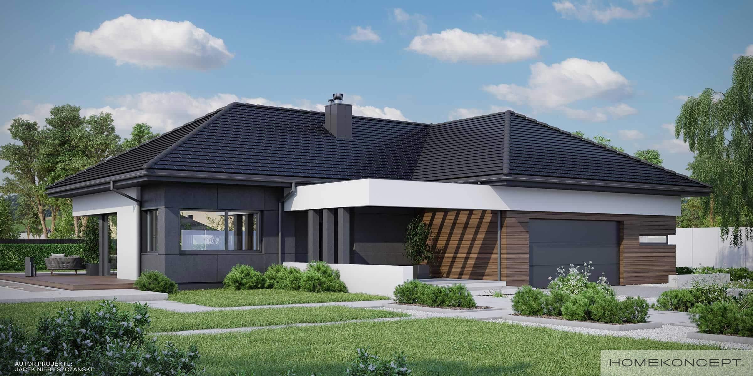Elewacja: płyty elewacyjne połączone z tynkiem i drewnem elewacyjnym