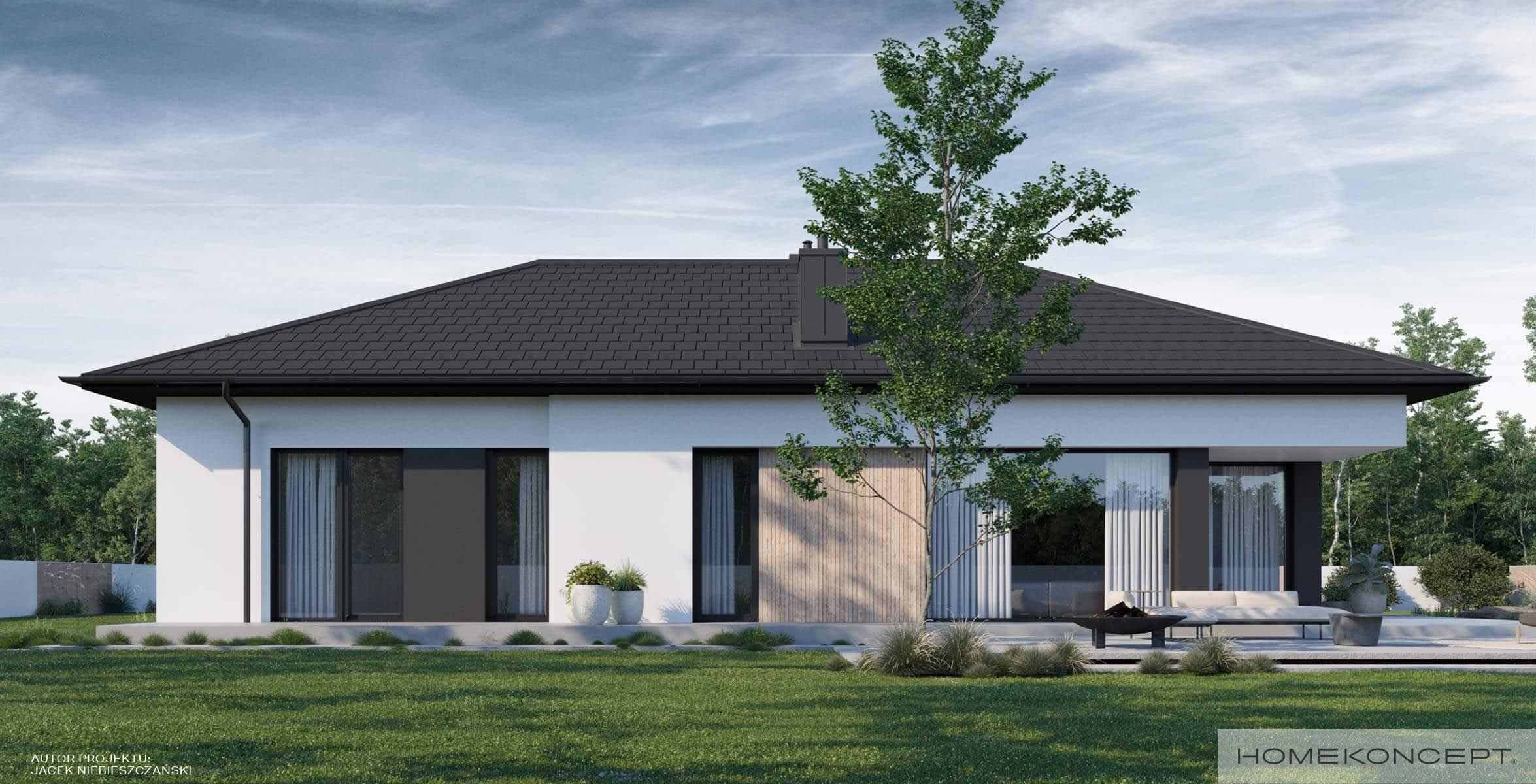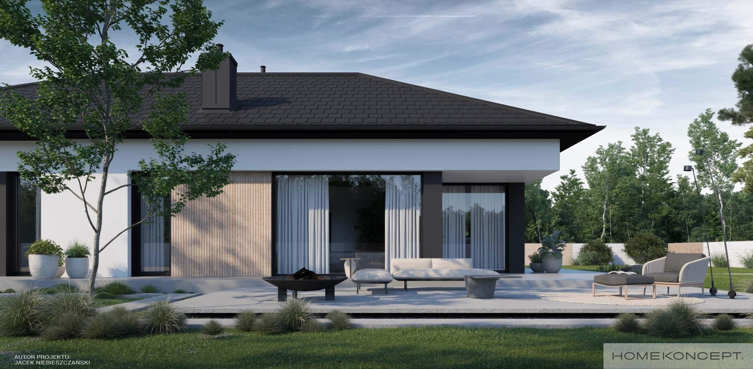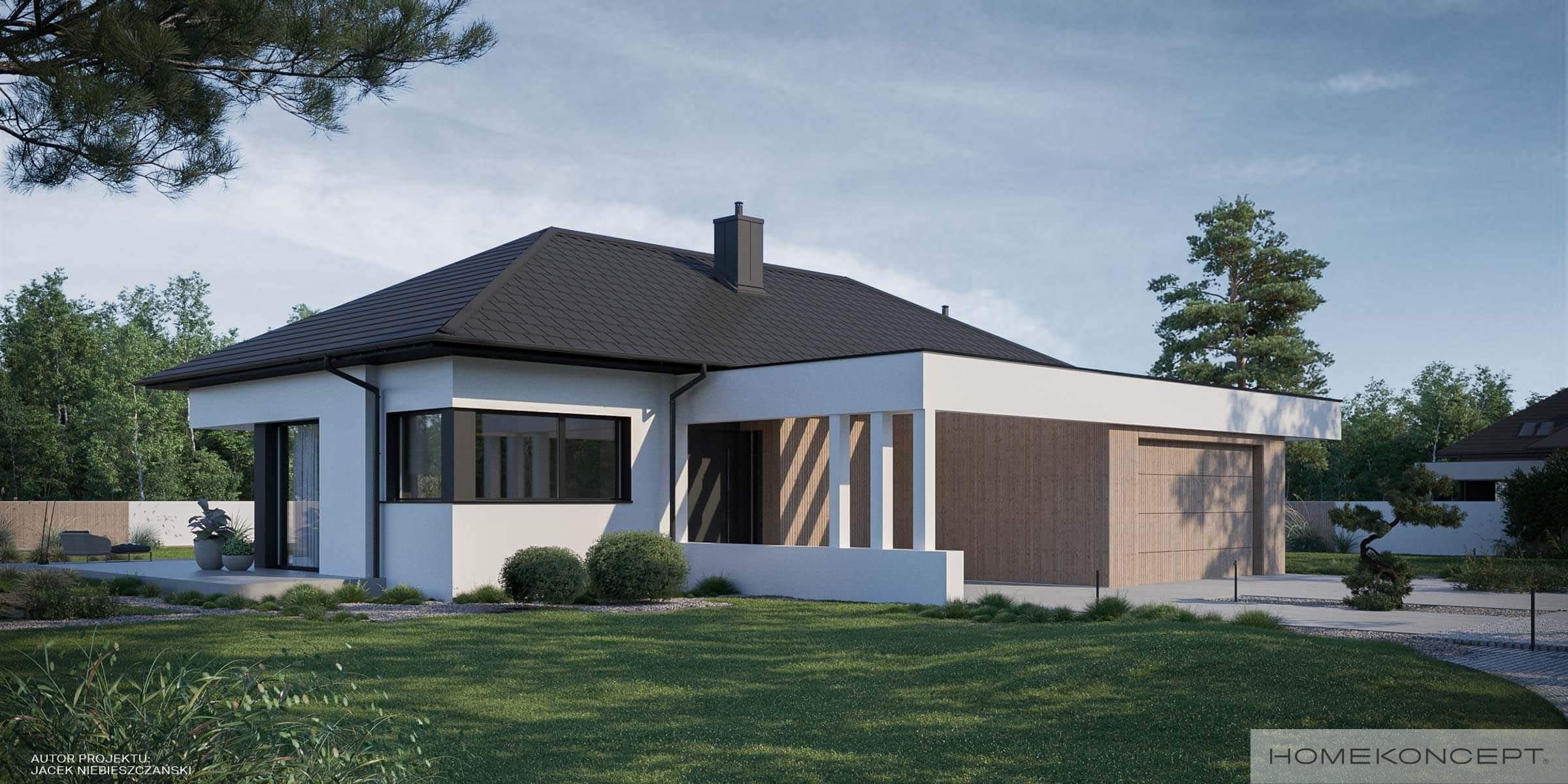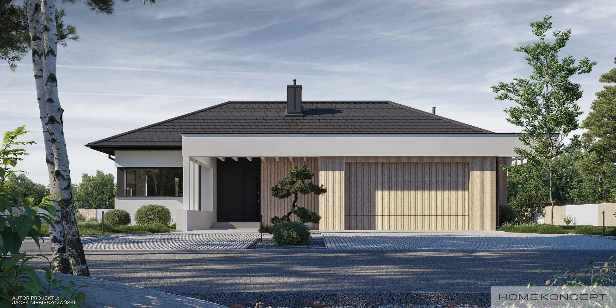 Elewacja: tynk silikonowy w kolorze białym i grafitowym połączony z deską elewacyjną