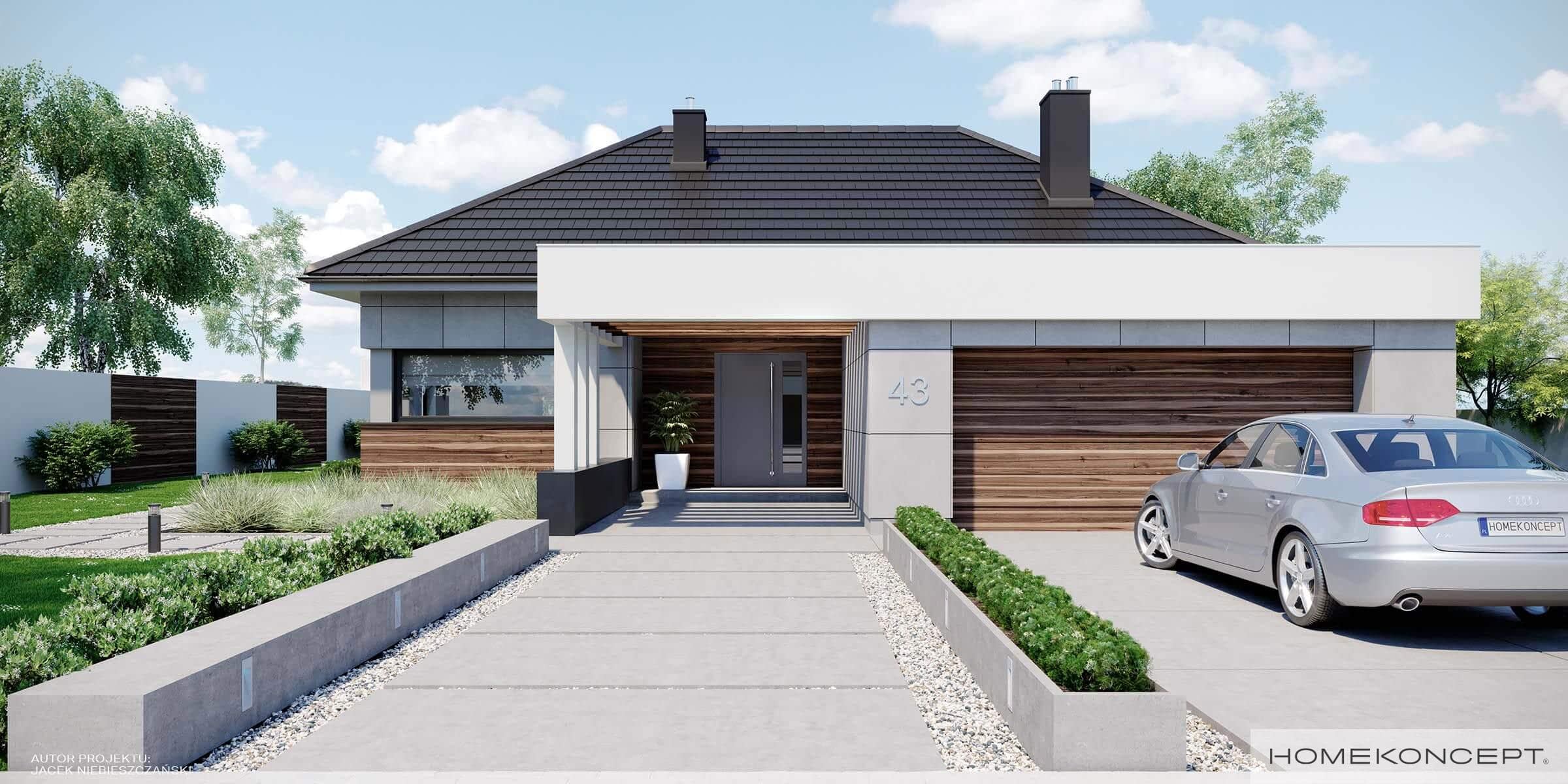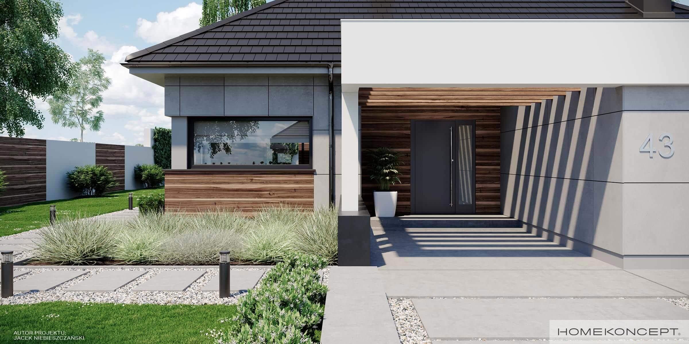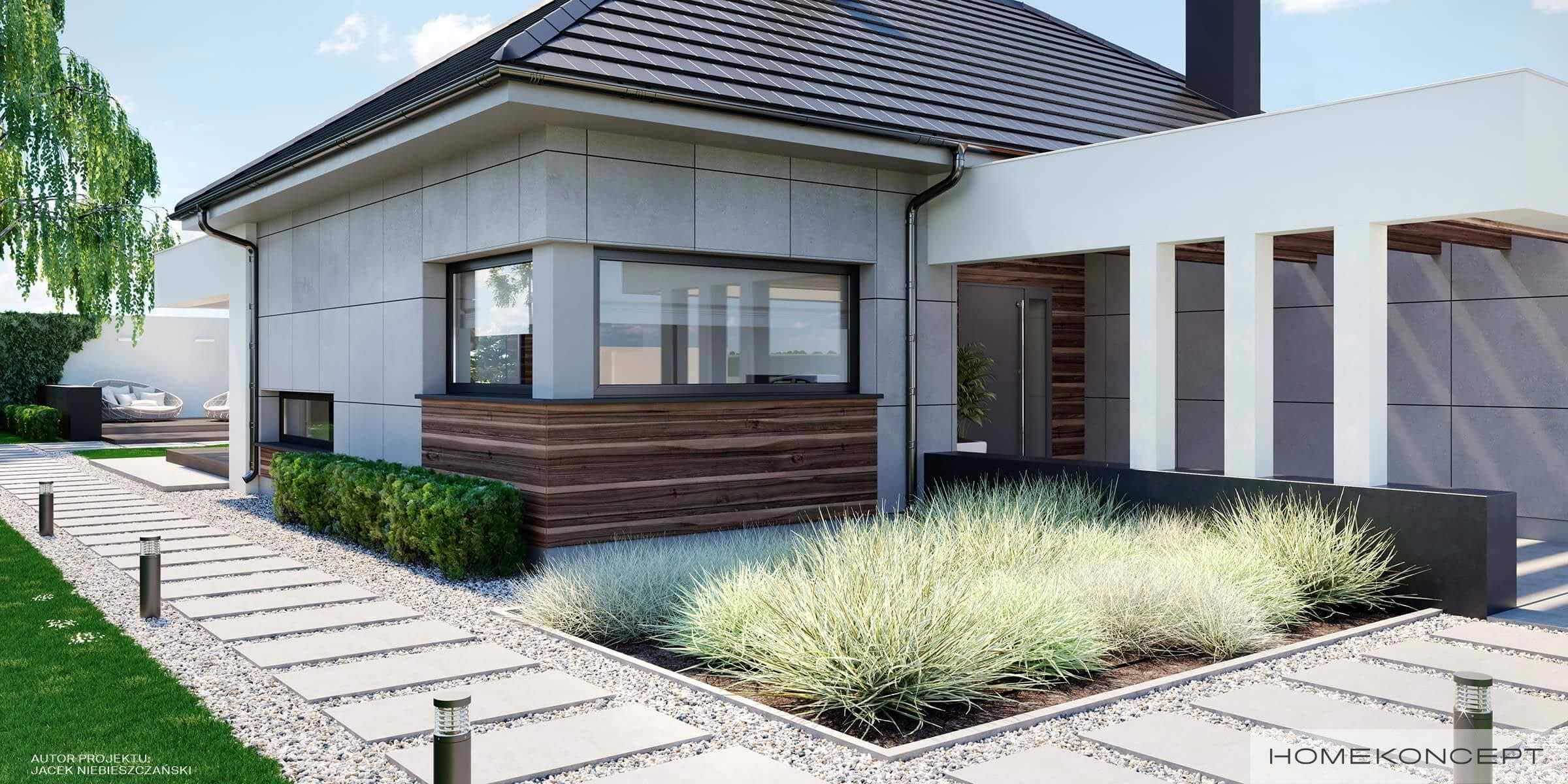 Elewacja: betonowe płyty elewacyjne połączone z tynkiem i drewnem elewacyjnym