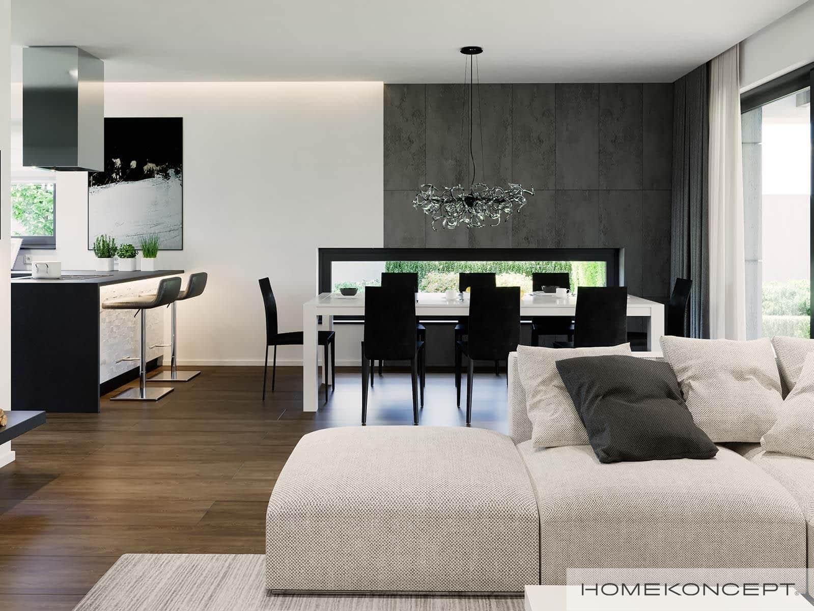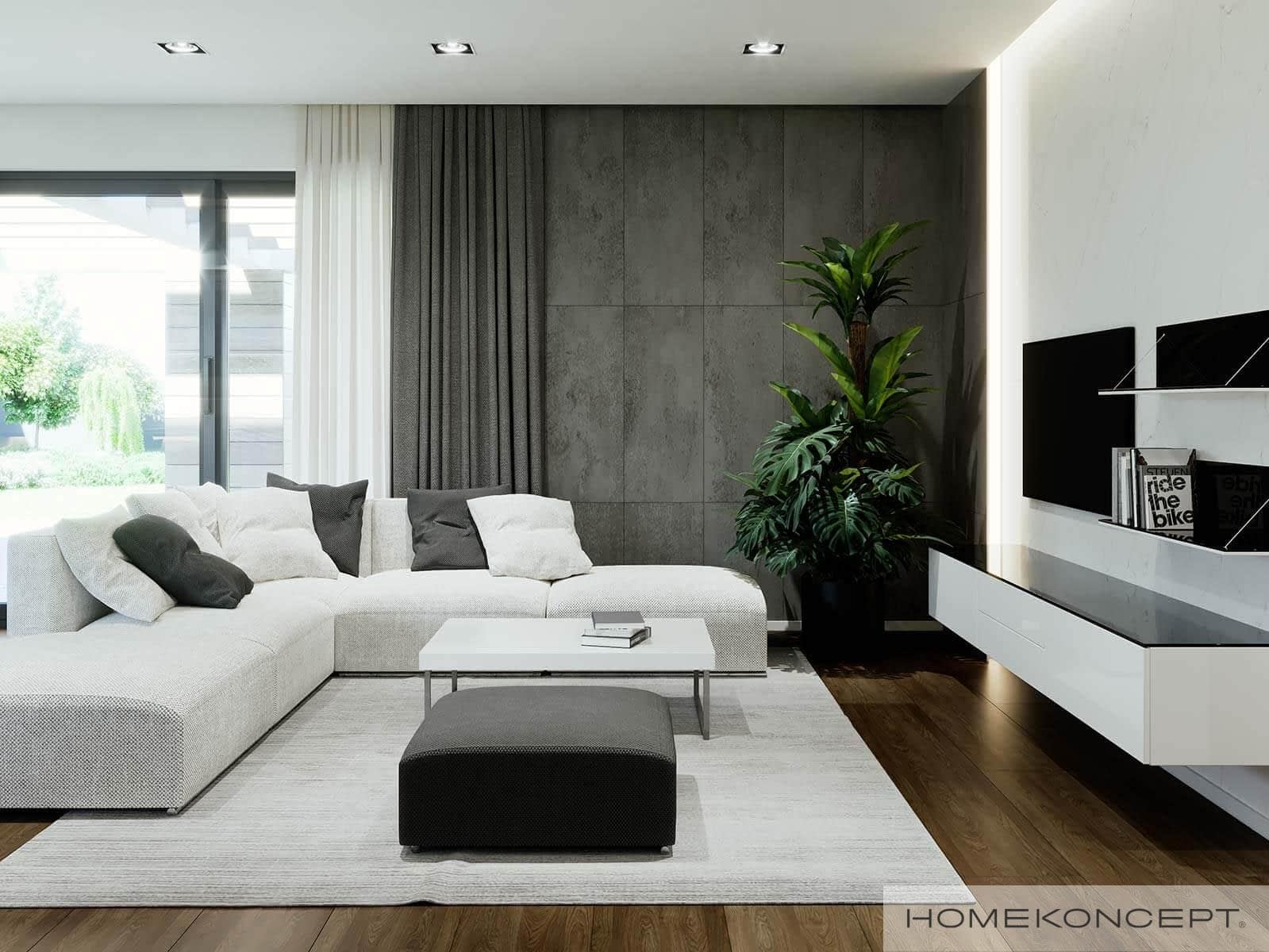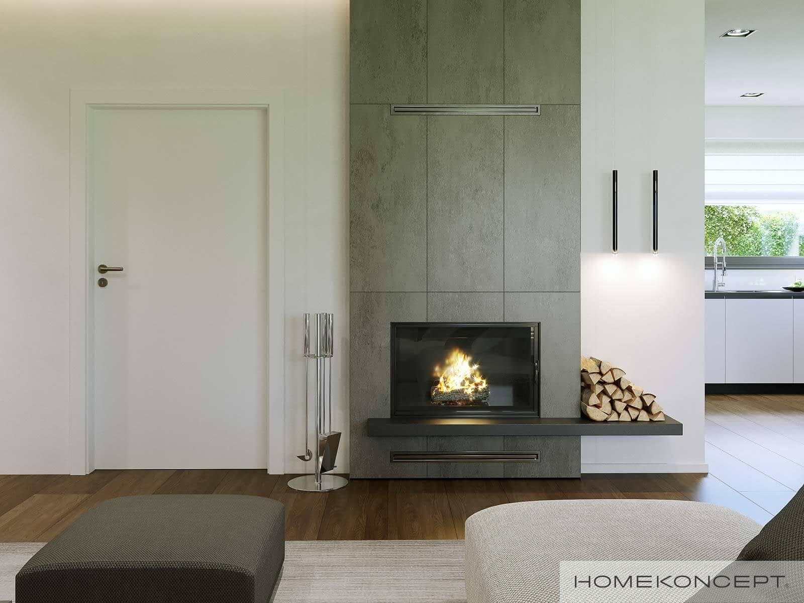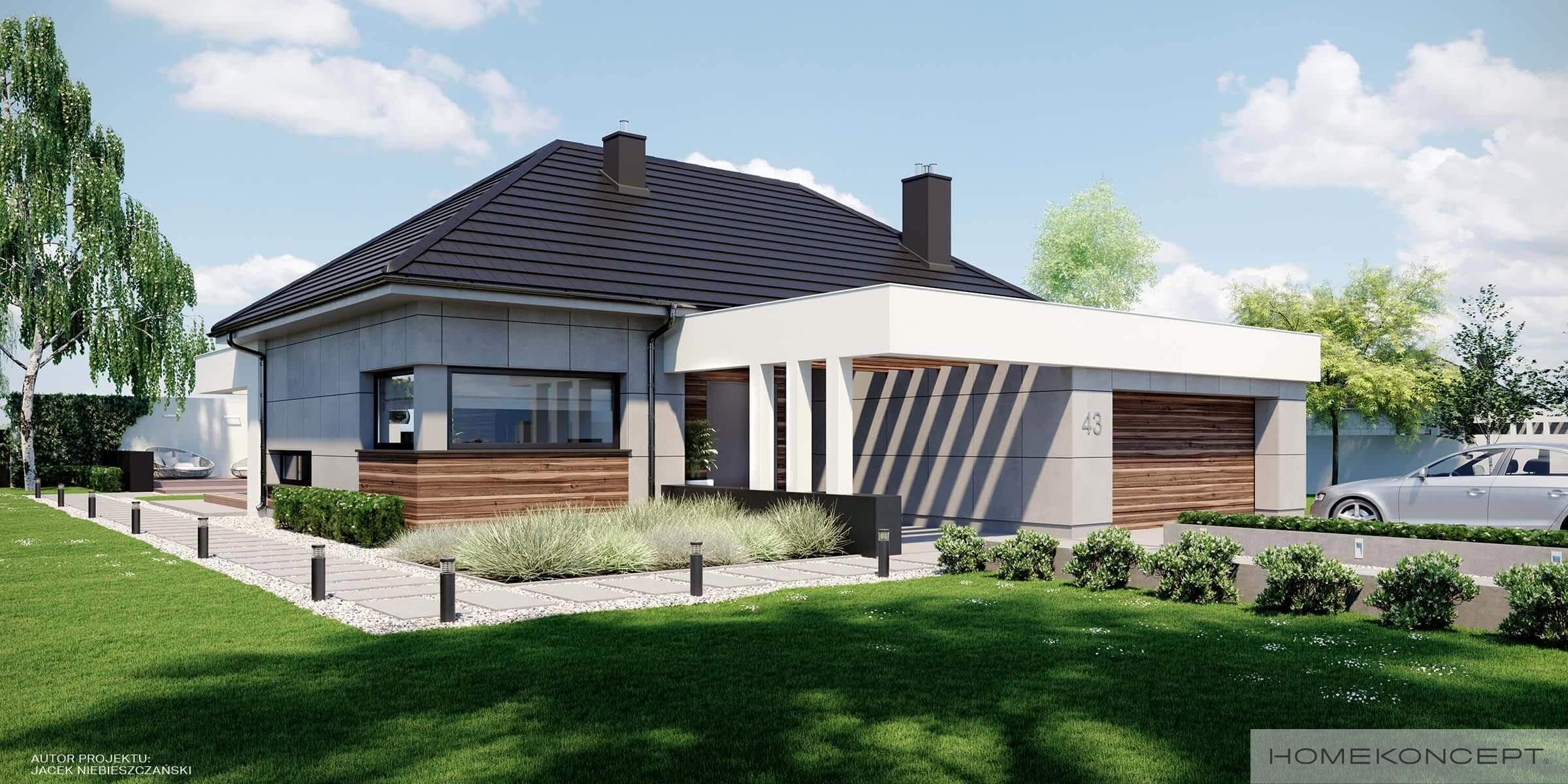 Elewacja: betonowe płyty elewacyjne połączone z tynkiem i drewnem elewacyjnym