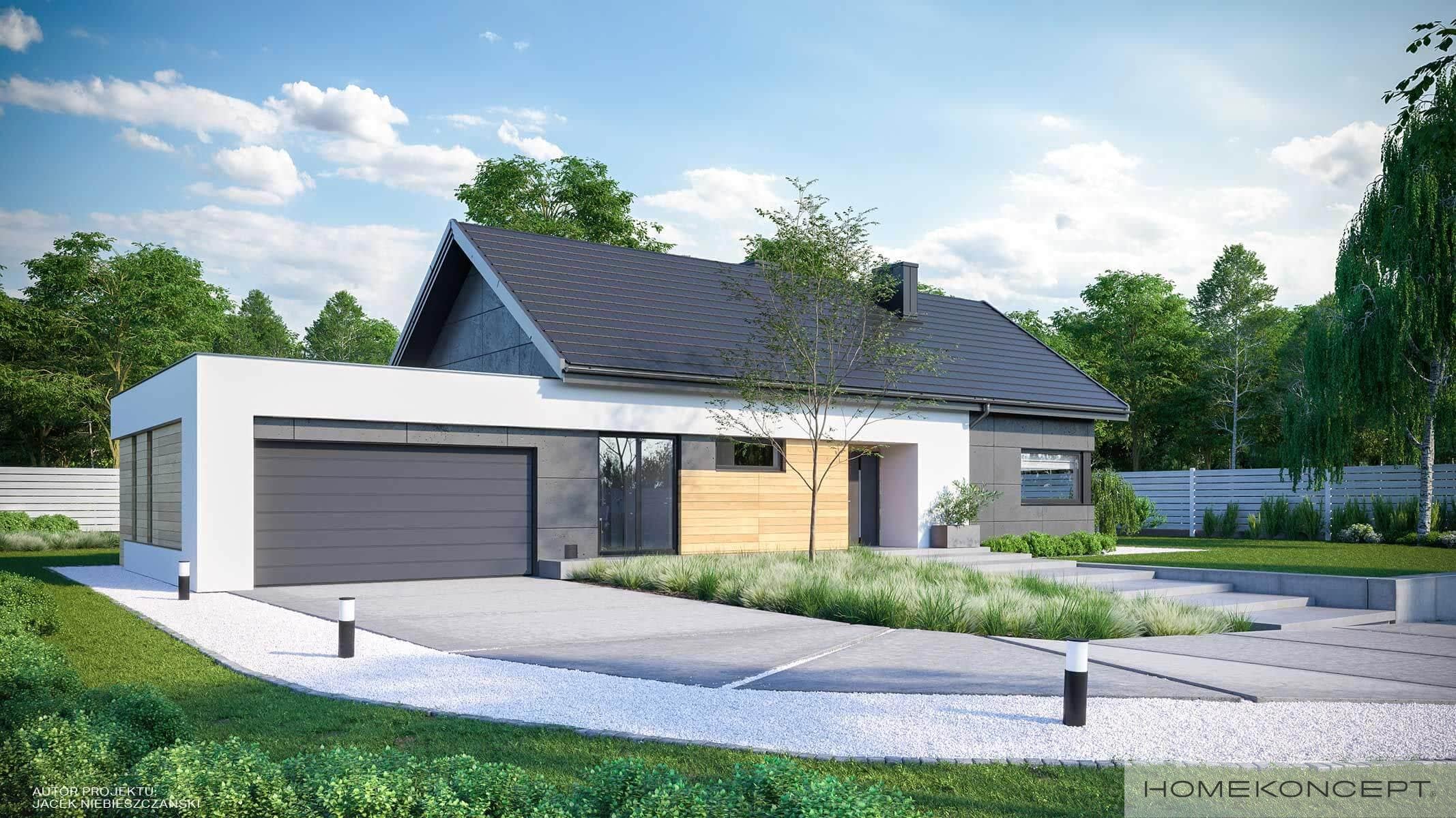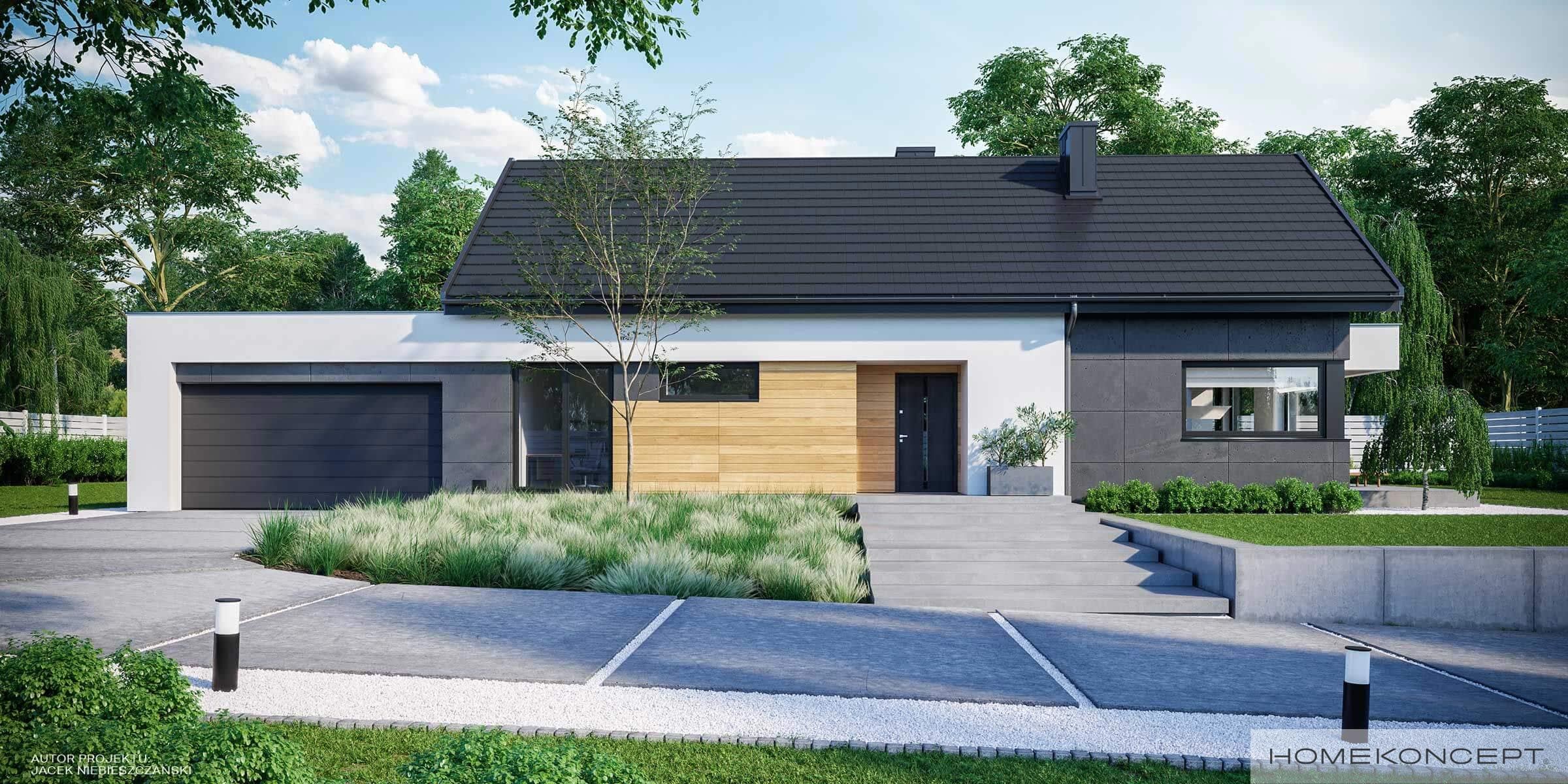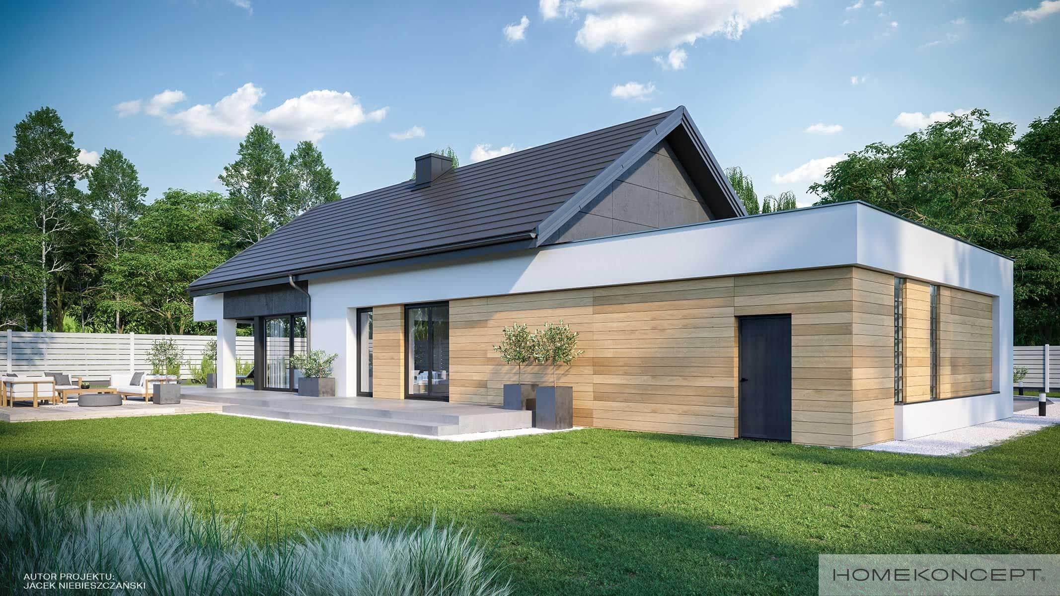 Elewacja: tynk silikonowy połączony z deskami elewacyjnymi modrzew syberyjski