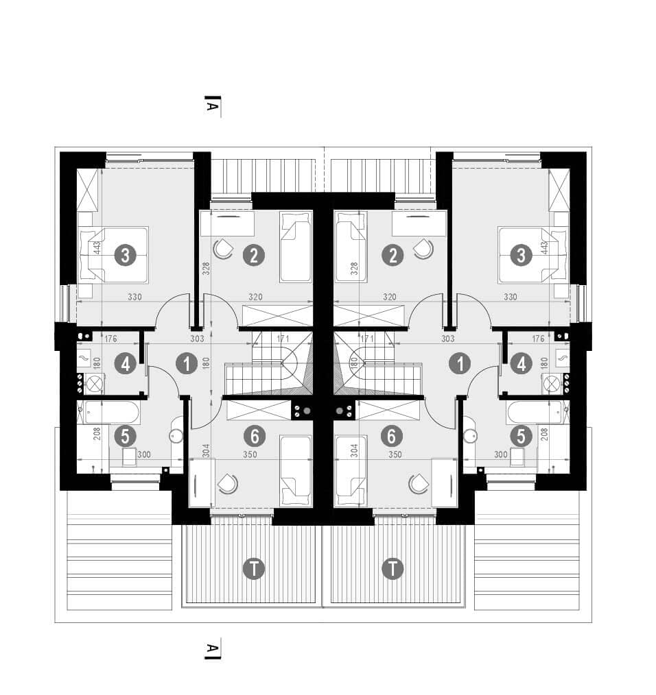 - rzuty poziome poszczególnych kondygnacji (parter, poddasze lub piętro),