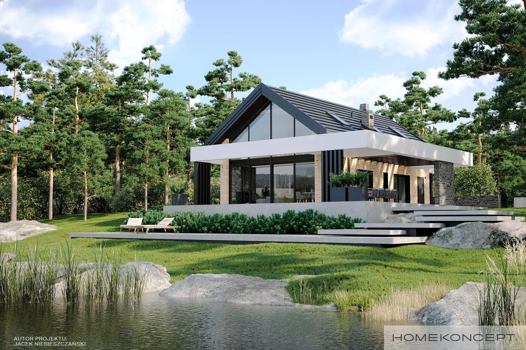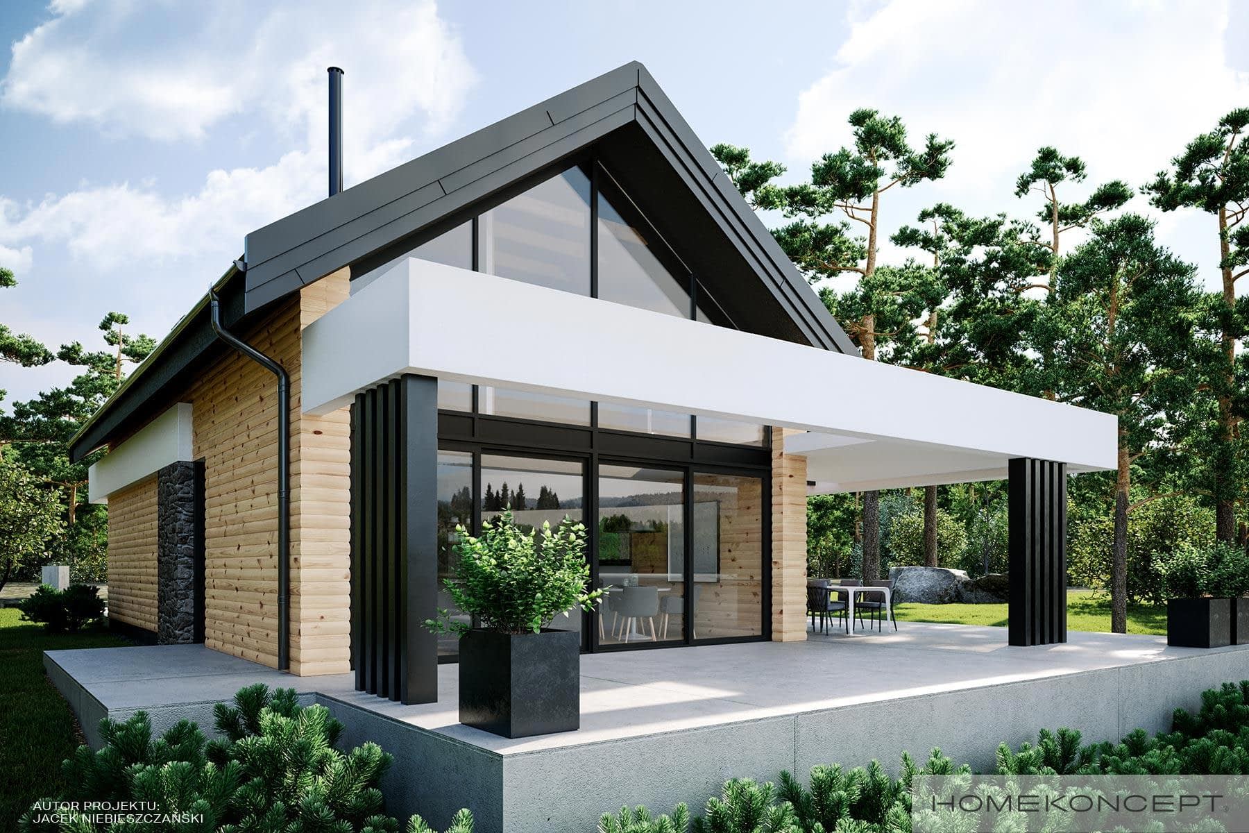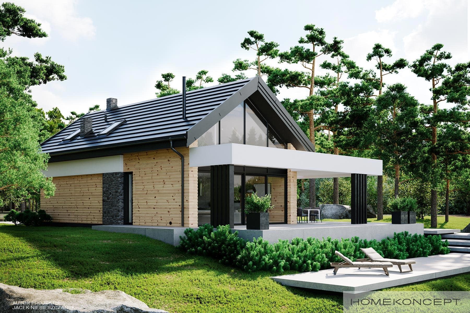 Elewacja: deski elewacyjne/ćwierćbale połączone z kamieniem elewacyjnym 29 PM firmy EL-POL Hurtownia Kamienia i tynkiem silikonowym