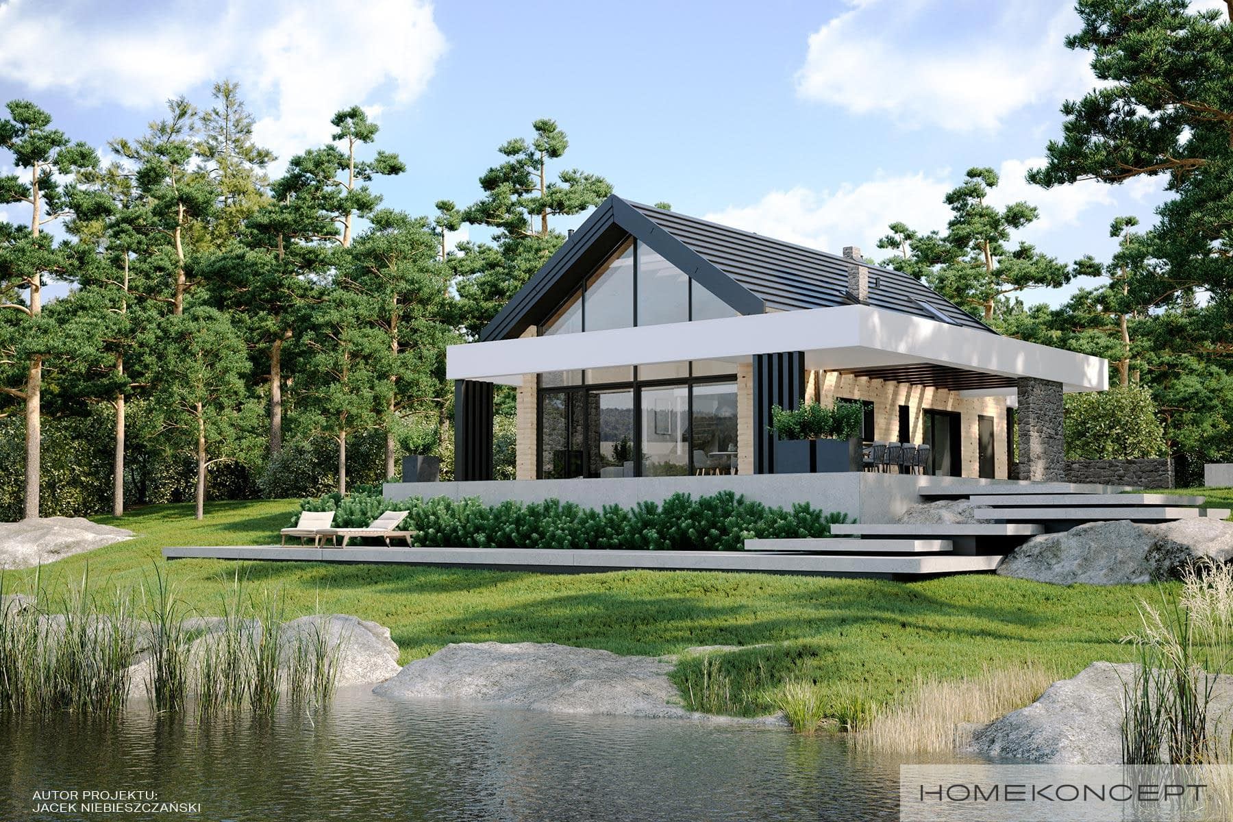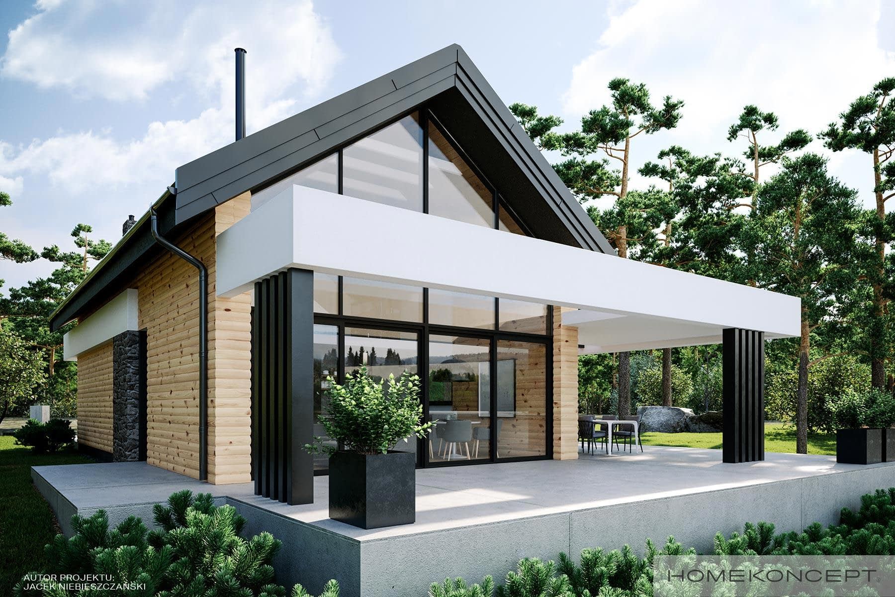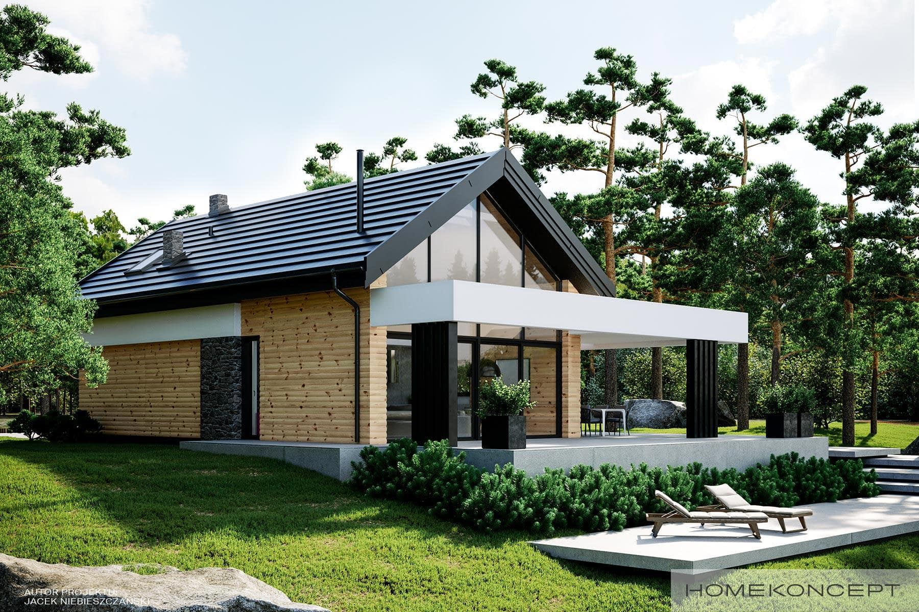 Elewacja: deski elewacyjne/ćwierćbale połączone z kamieniem elewacyjnym 29PM firmy EL-POL Hurtownia Kamienia i tynkiem silikonowym