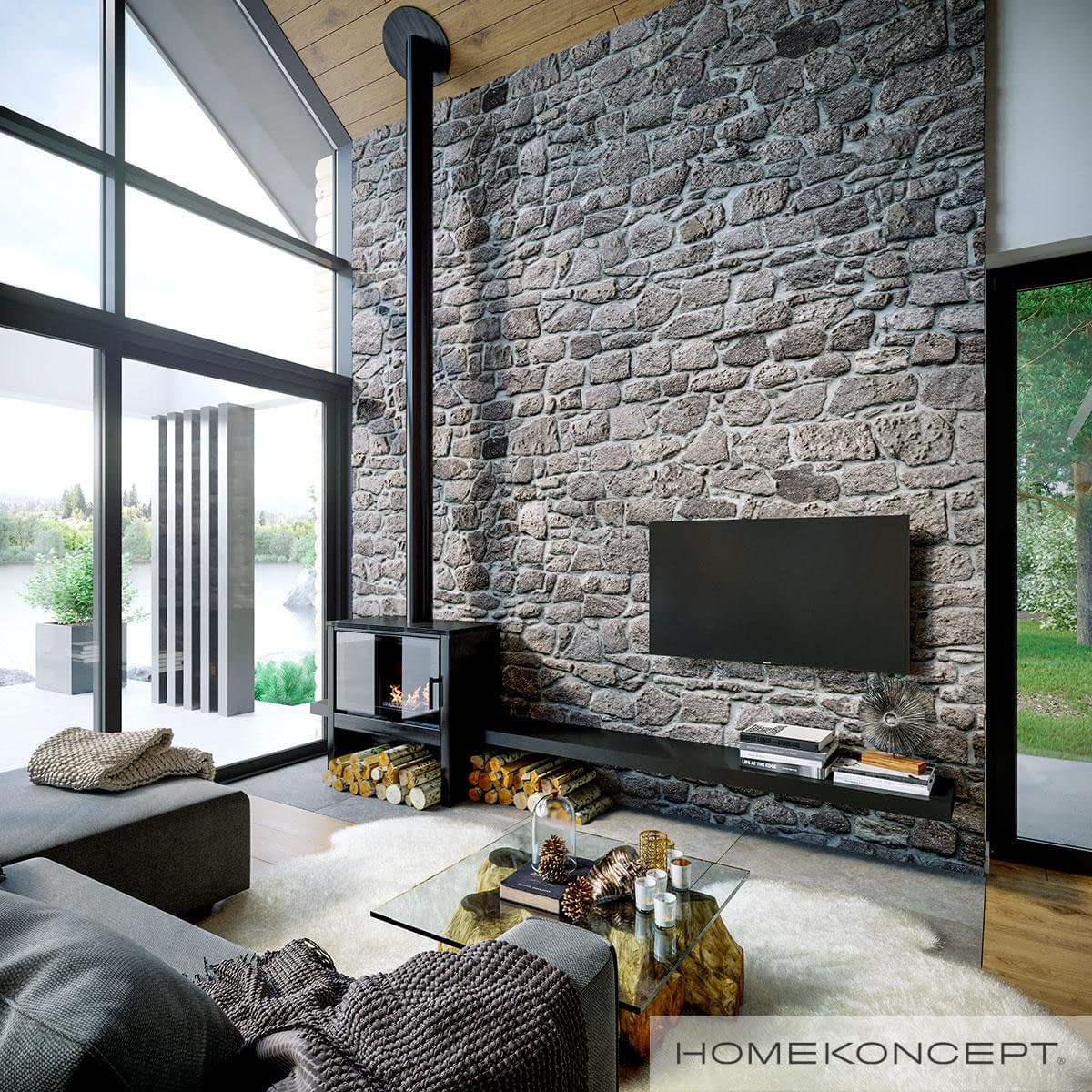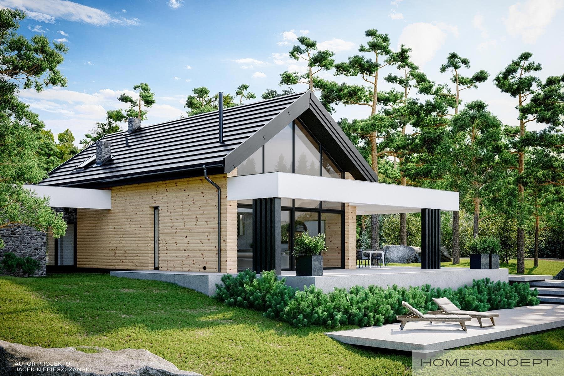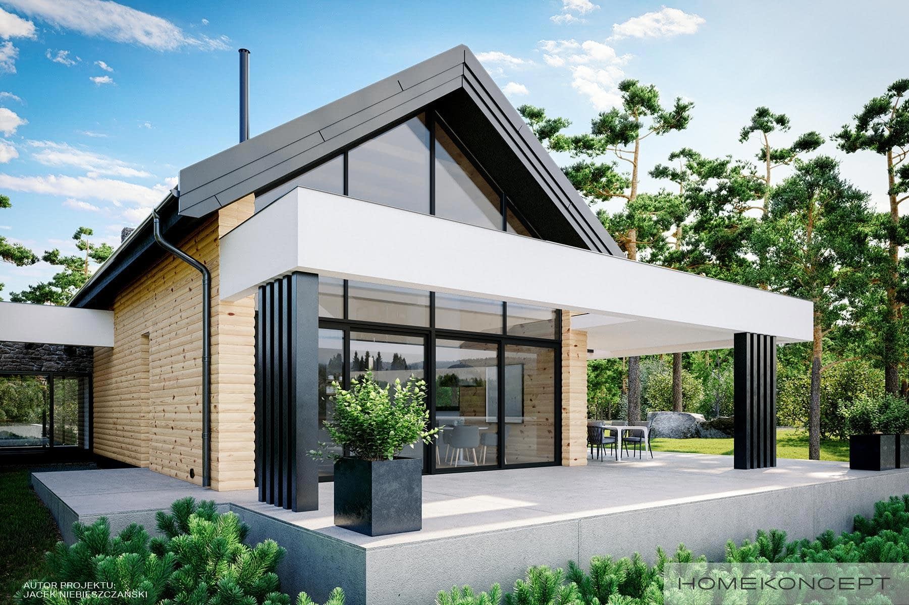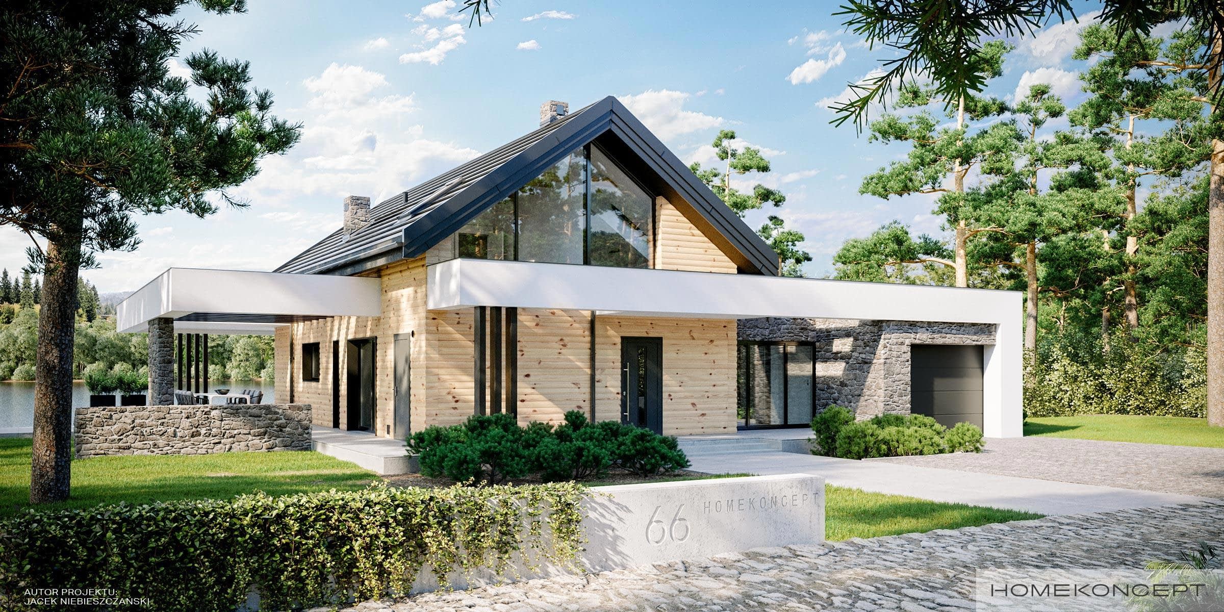 Elewacja: deski elewacyjne/ćwierćbale połączone z kamieniem naturalnym 29 PM firmy EL-POL Hurtownia Kamienia i tynkiem silikonowym