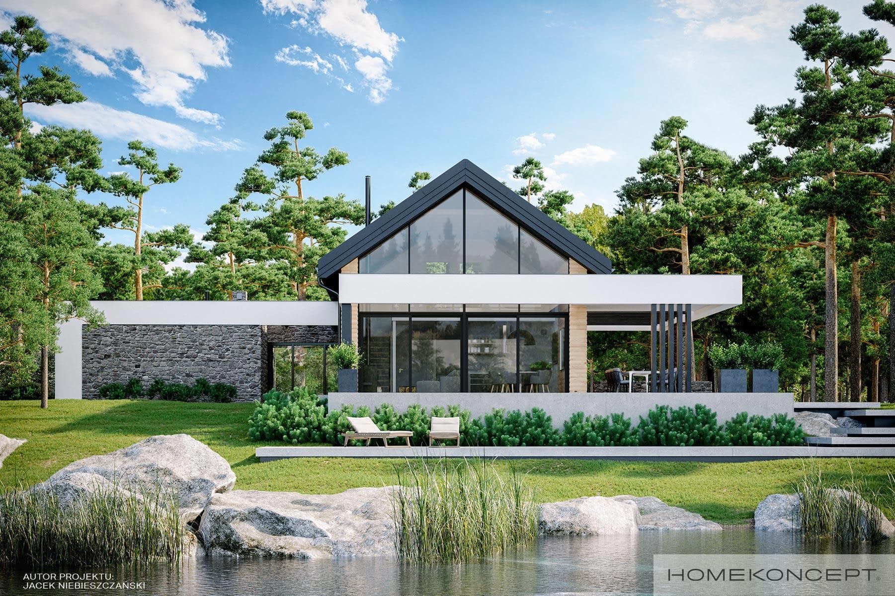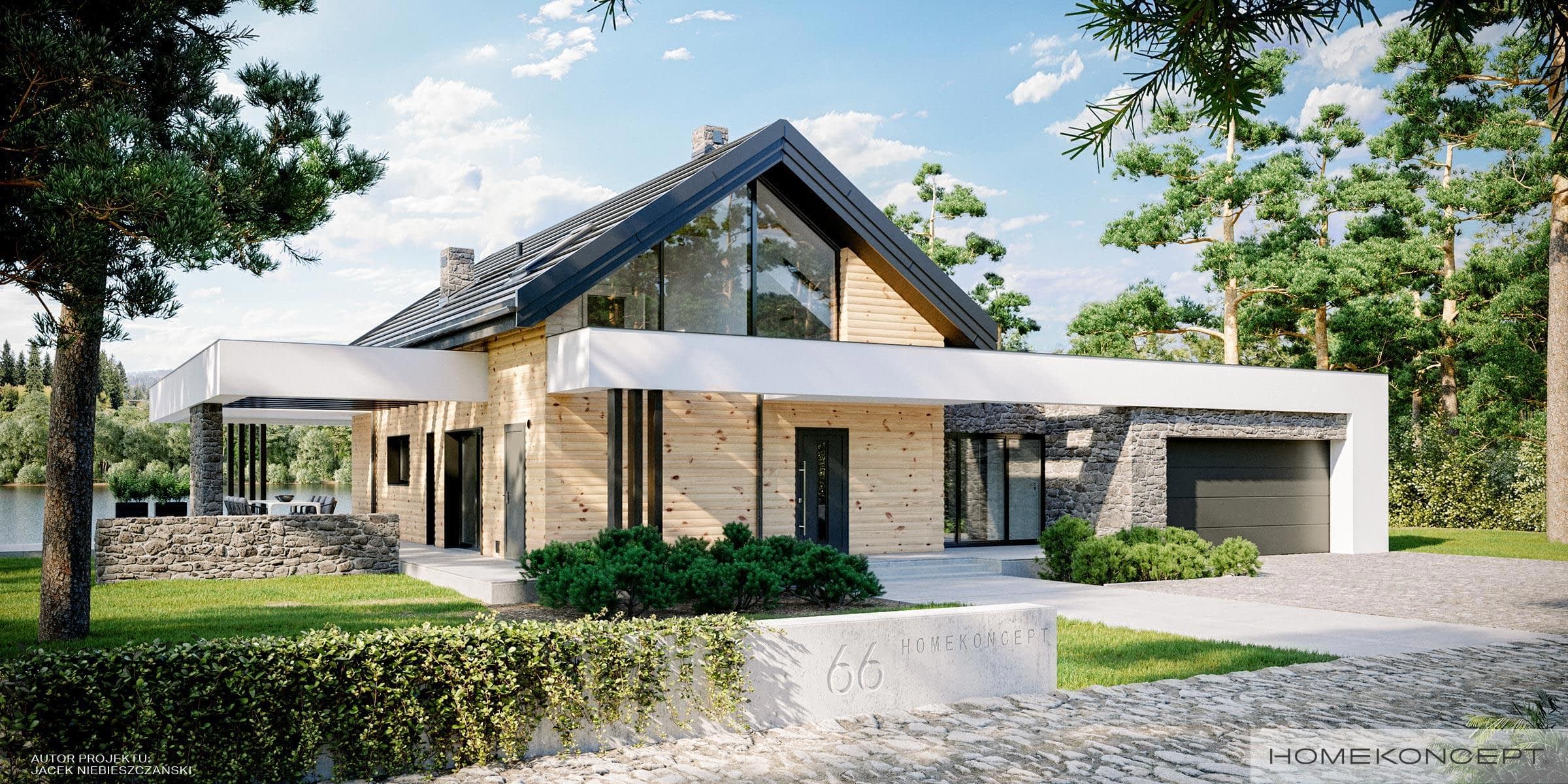 Elewacja: deski elewacyjne/ćwierćbale połączone z kamieniem elewacyjnym 29 PM firmy EL-POL Hurtownia Kamienia i tynkiem silikonowym