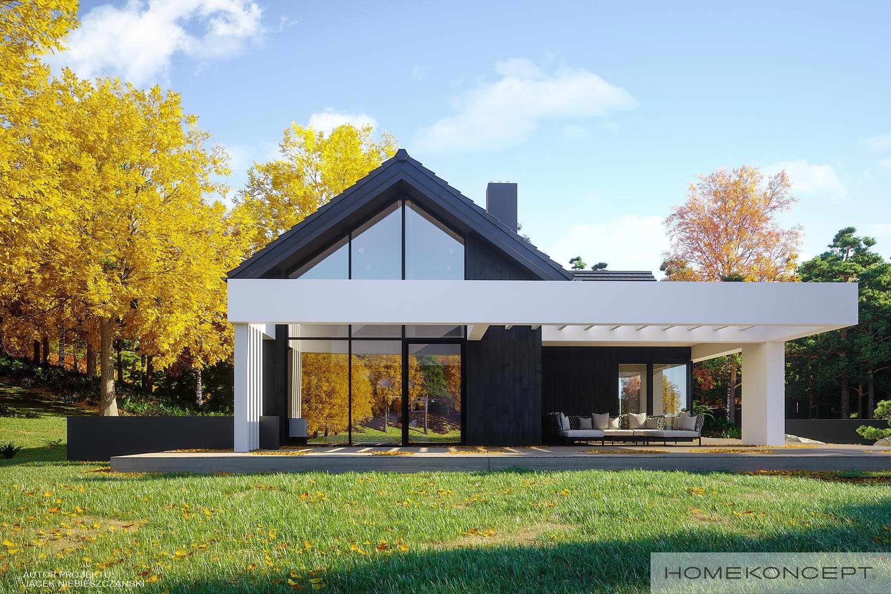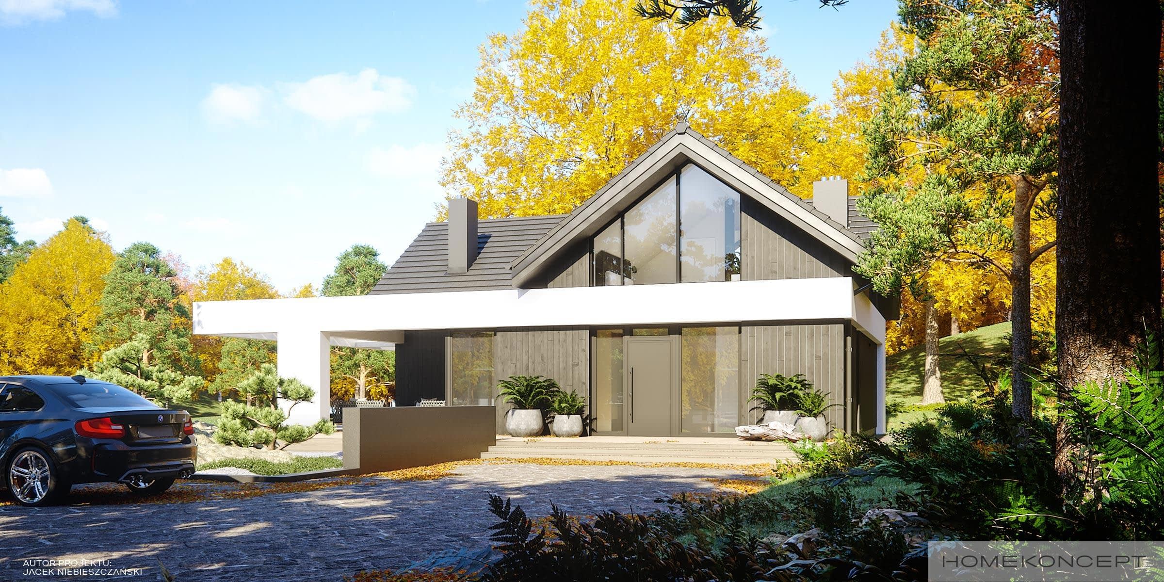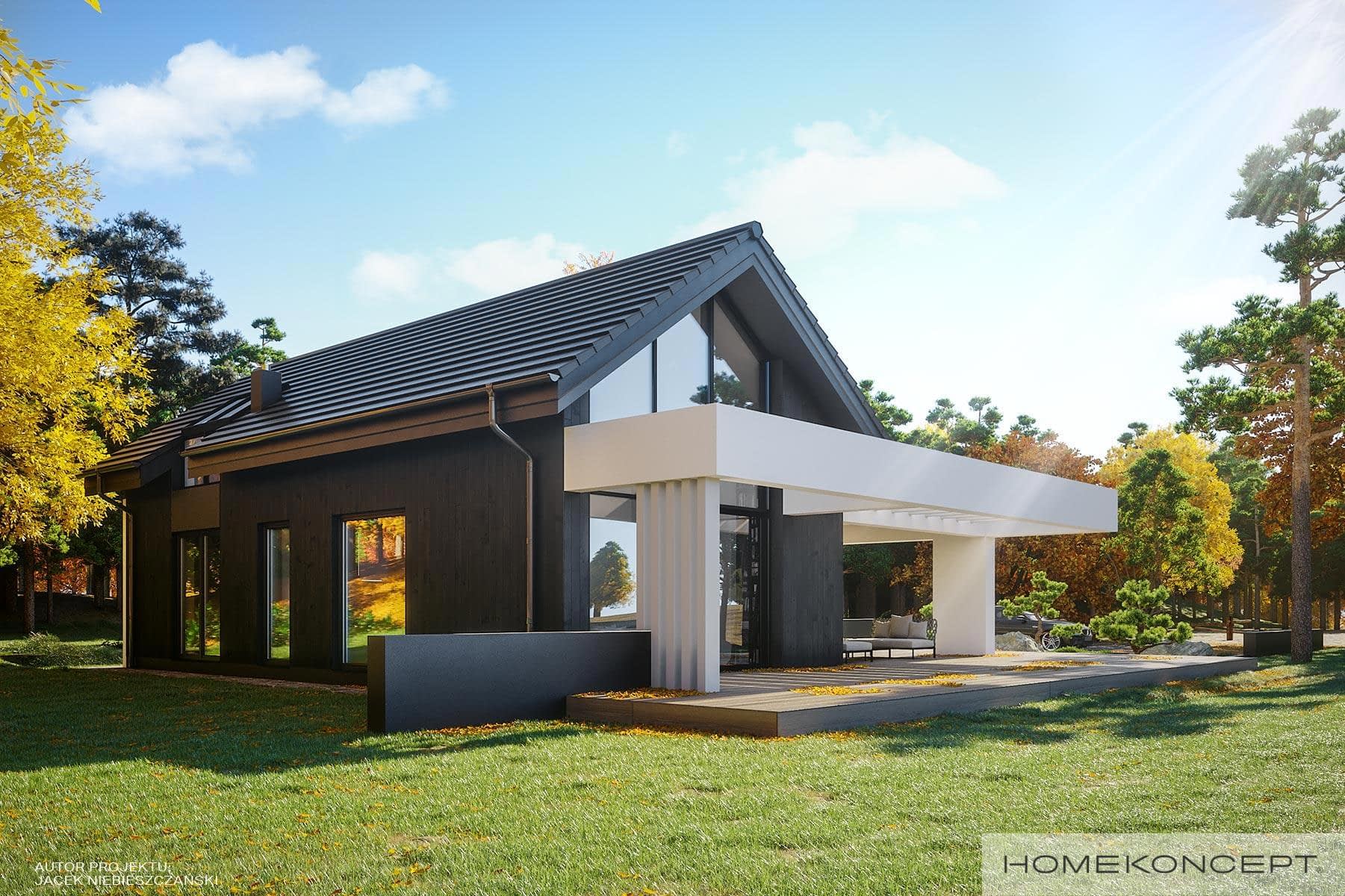 Elewacja: okładziny drewniane (sosna skandynawska) malowane na kolor heban połączone z tynkiem silikonowym