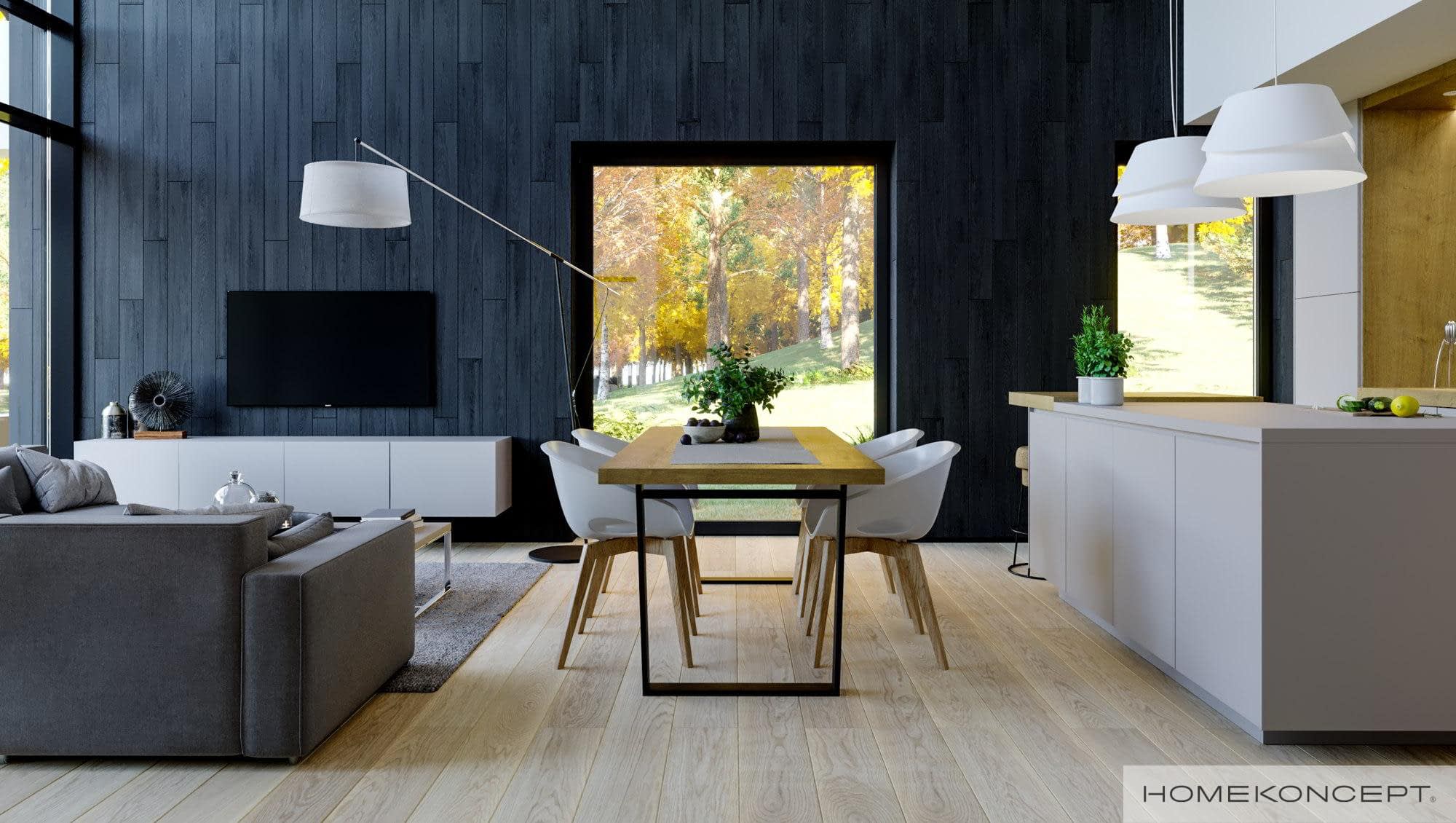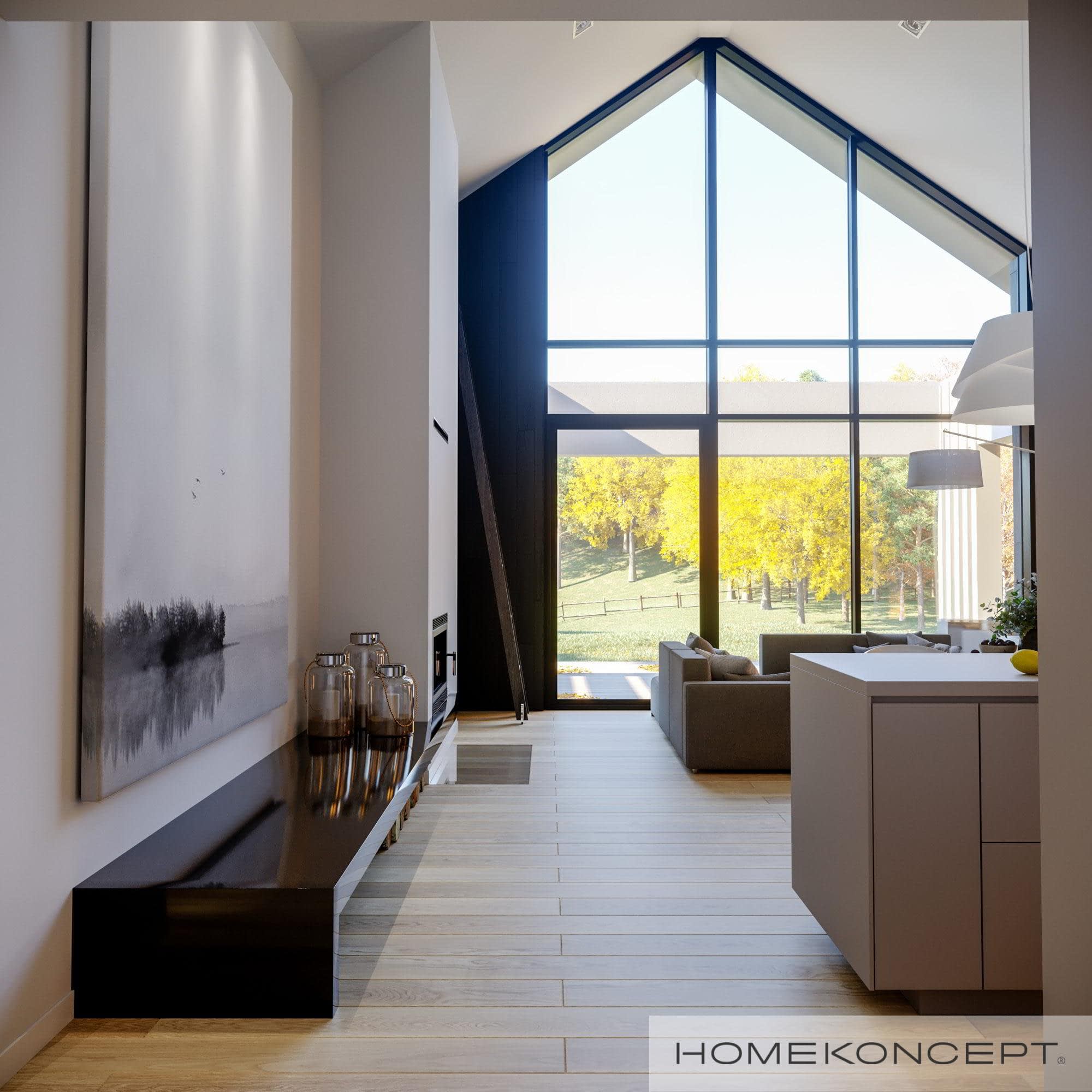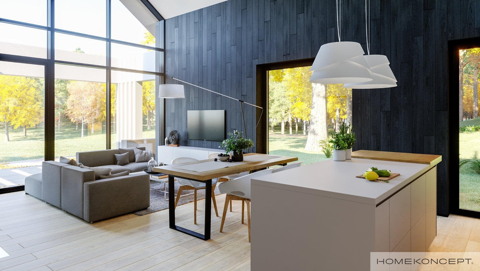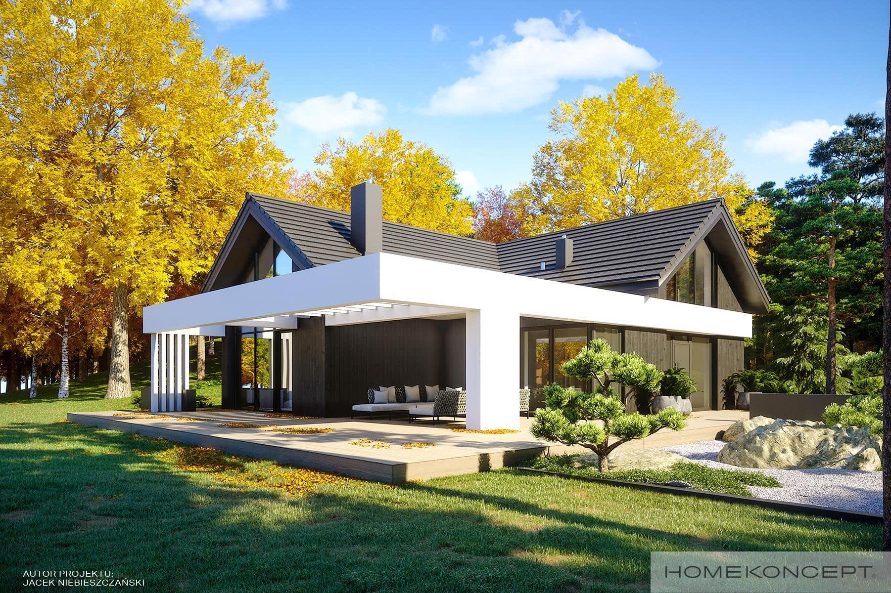 Elewacja: okładziny drewniane (sosna skandynawska) malowane na kolor heban połączone z tynkiem silikonowym