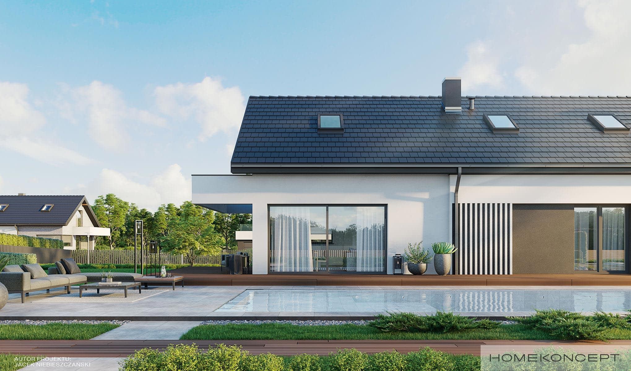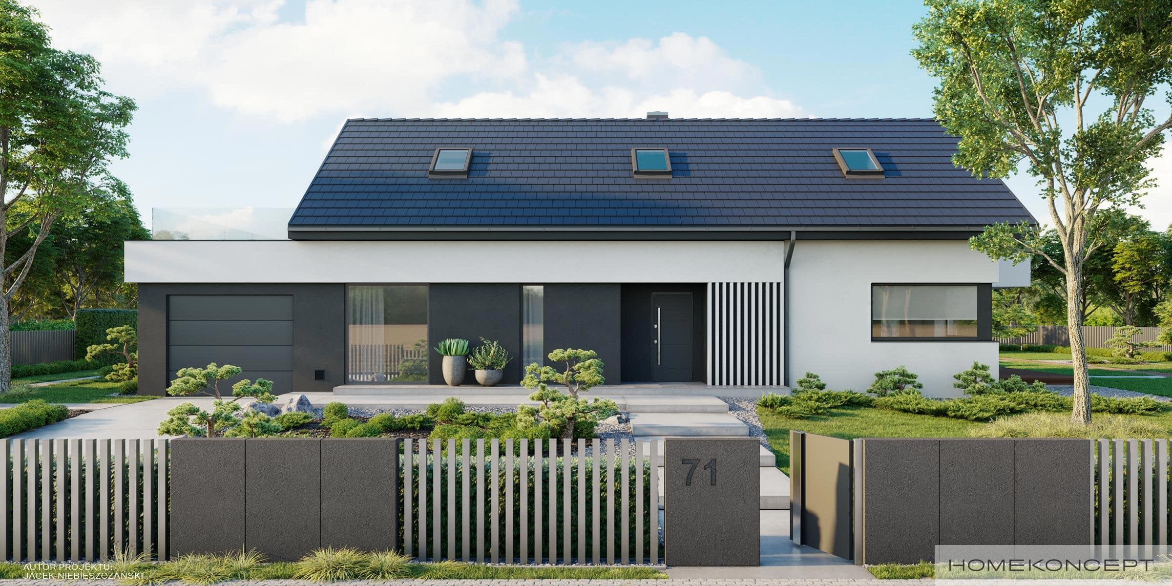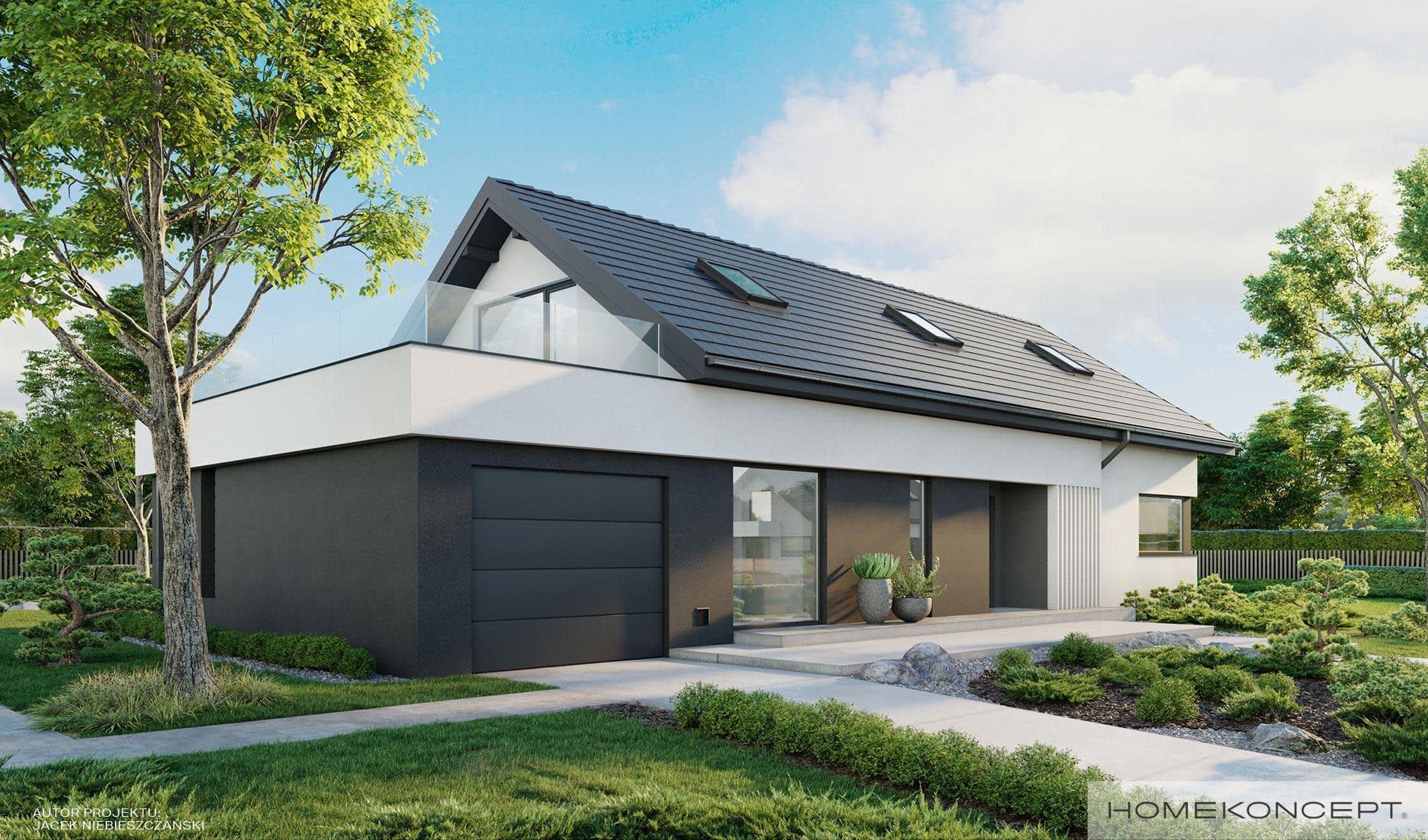 Elewacja: tynk silikonowy połączony z drewnem klejonym świerk malowanym na biało
