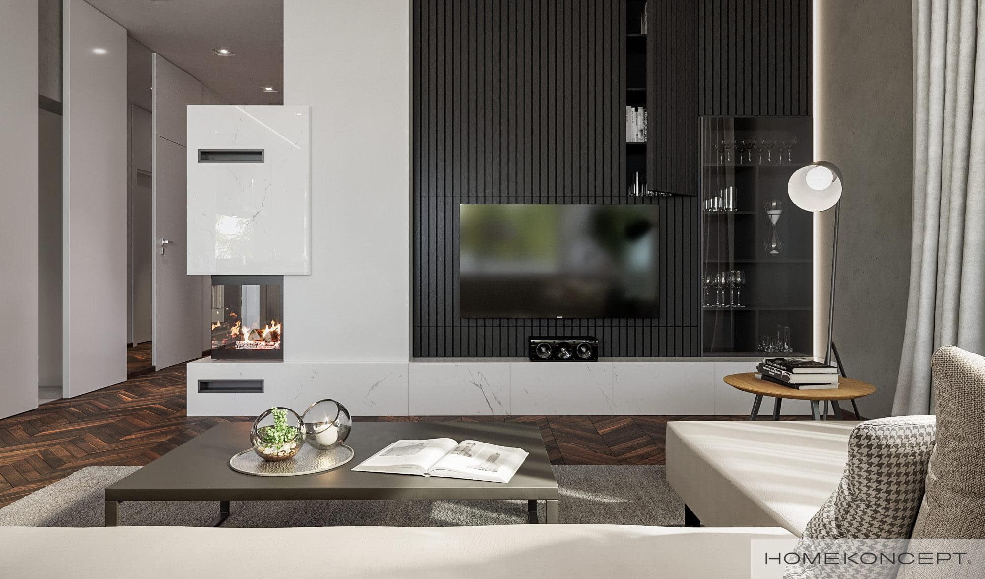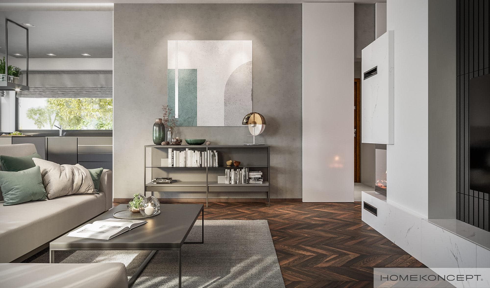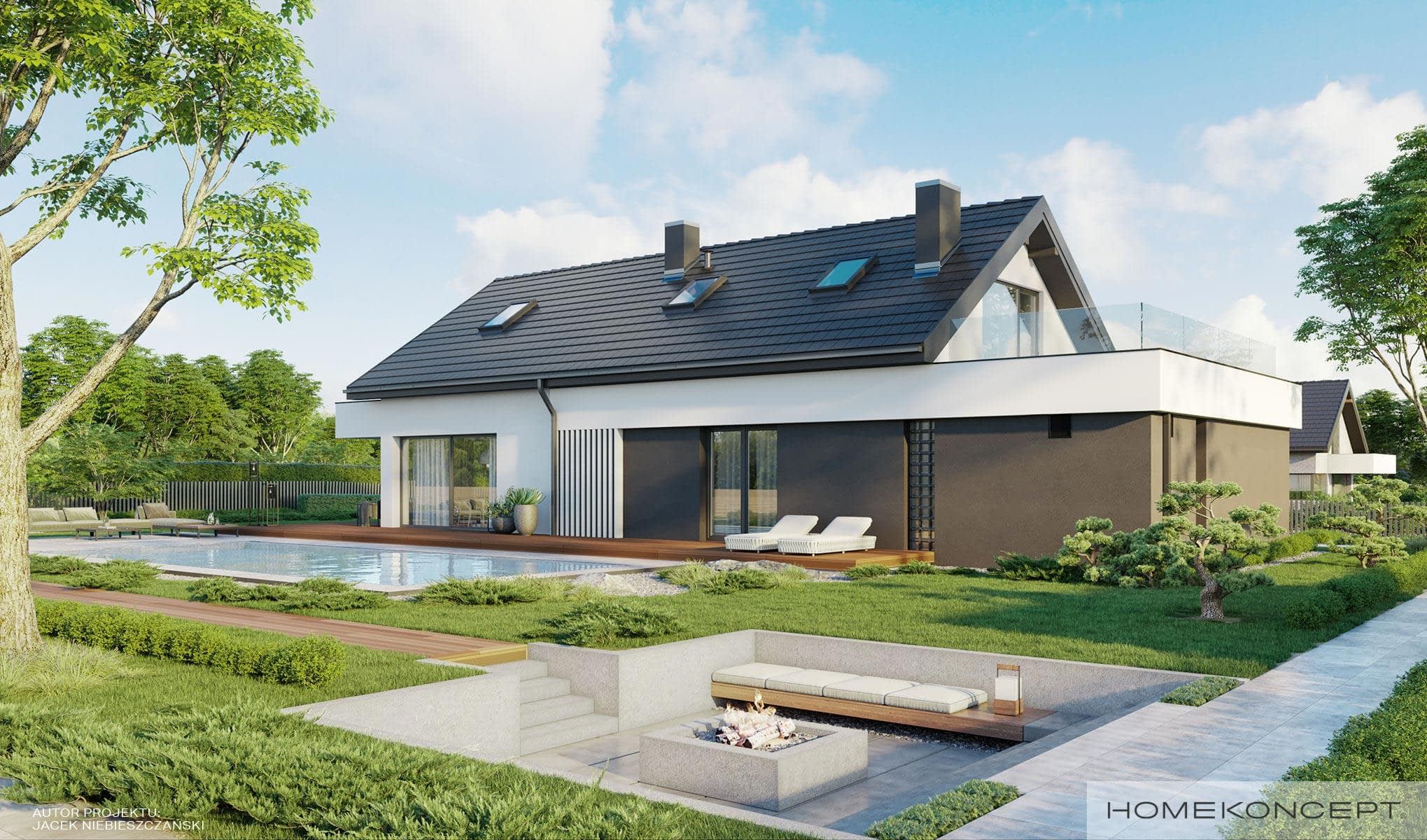 Elewacja: tynk silikonowy połączony z drewnem klejonym świerk malowanym na biało