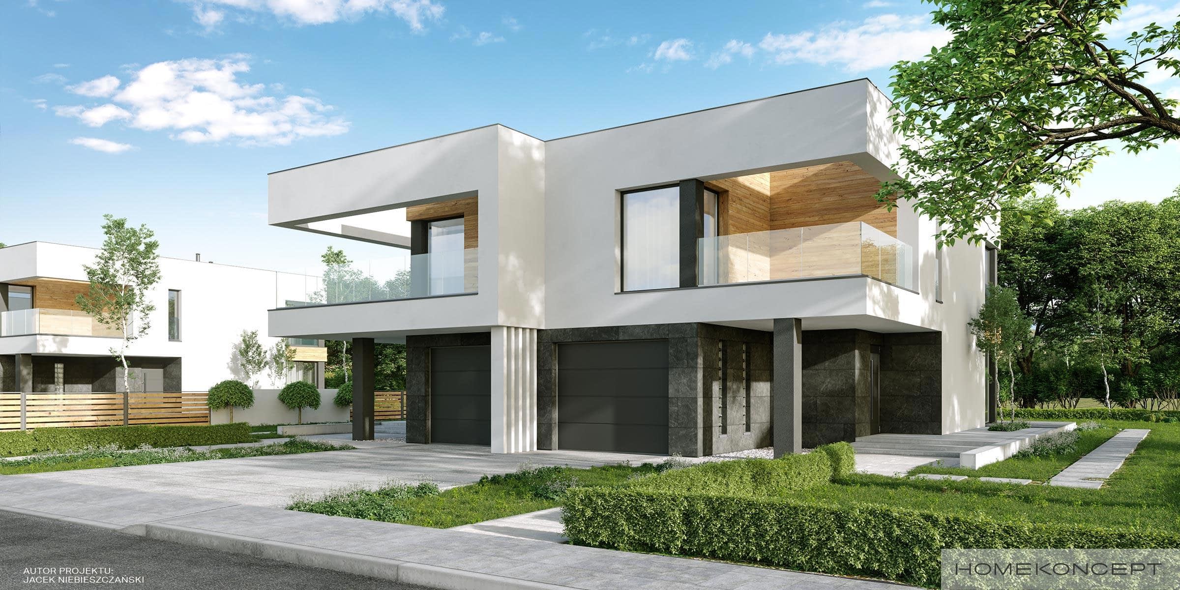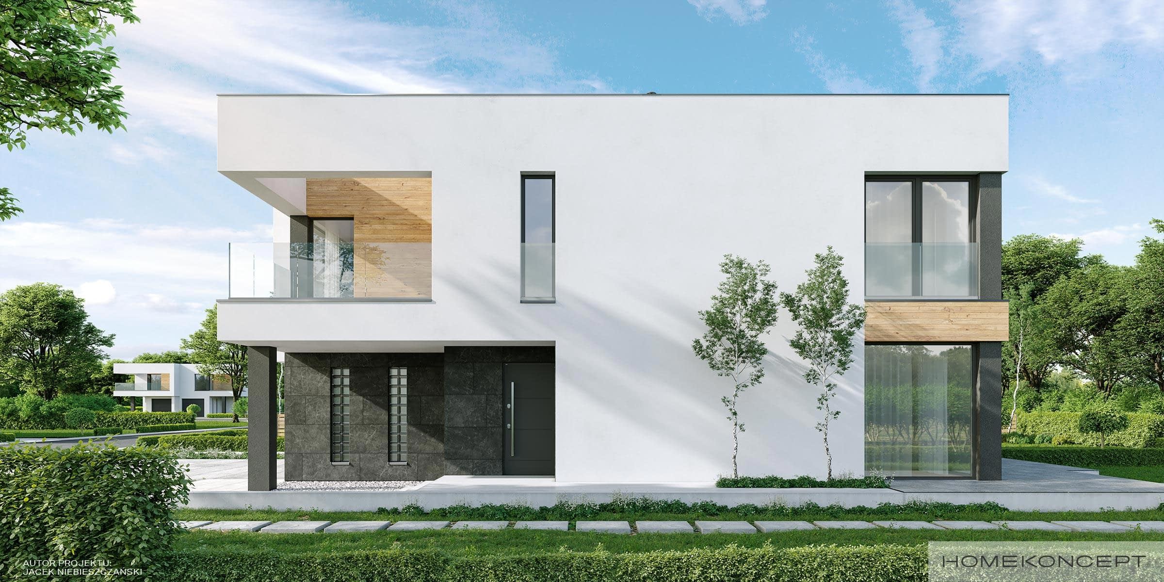 Elewacja: tynk połączony z deskami elewacyjnymi - modrzew syberyjski i kamieniem elewacyjnym Silver Grey firmy EL-POL Hurtowania Kamienia
