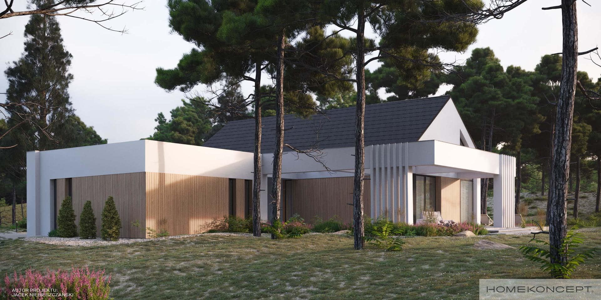 Elewacja: tynk silikonowy połączony z deskami elewacyjnymi Thermory thermo sosna bezsęczna profil C3 w wybarwieniu hemlock