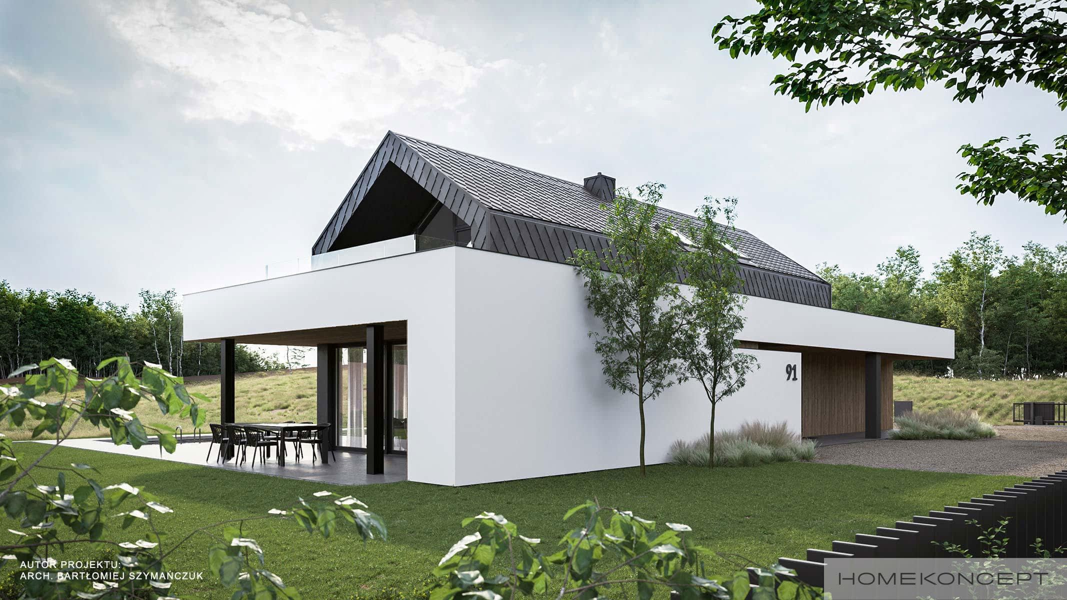 Elewacja: tynk silikonowy połączony z panelami elewacyjnymi oraz panele karo z blachy tytanowo-cynkowej - krycie w stylu francuskim