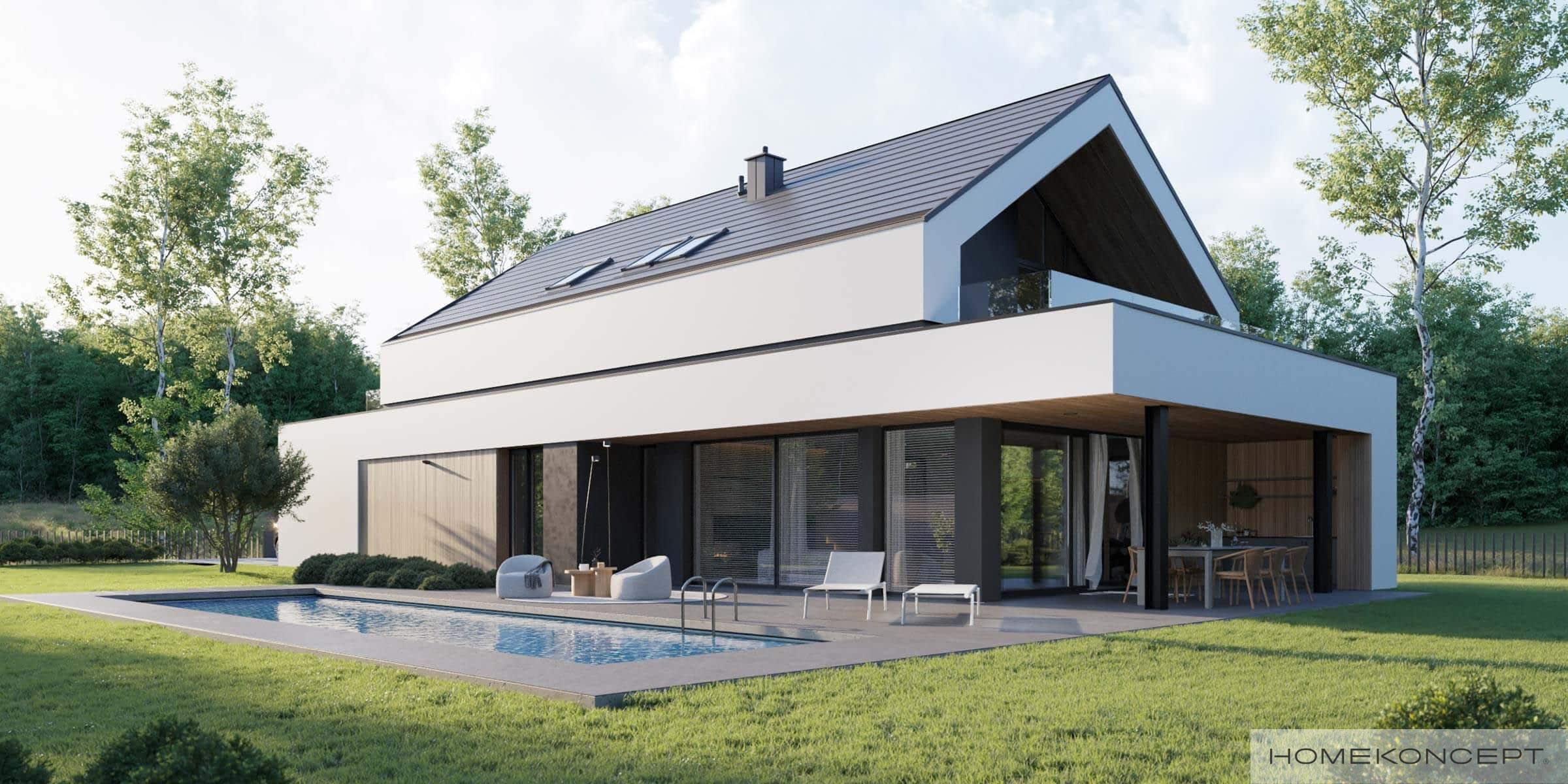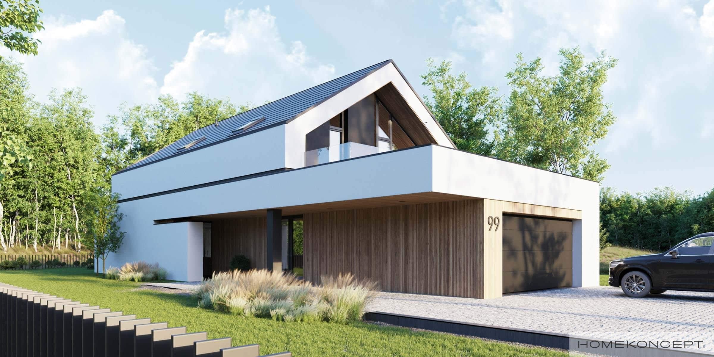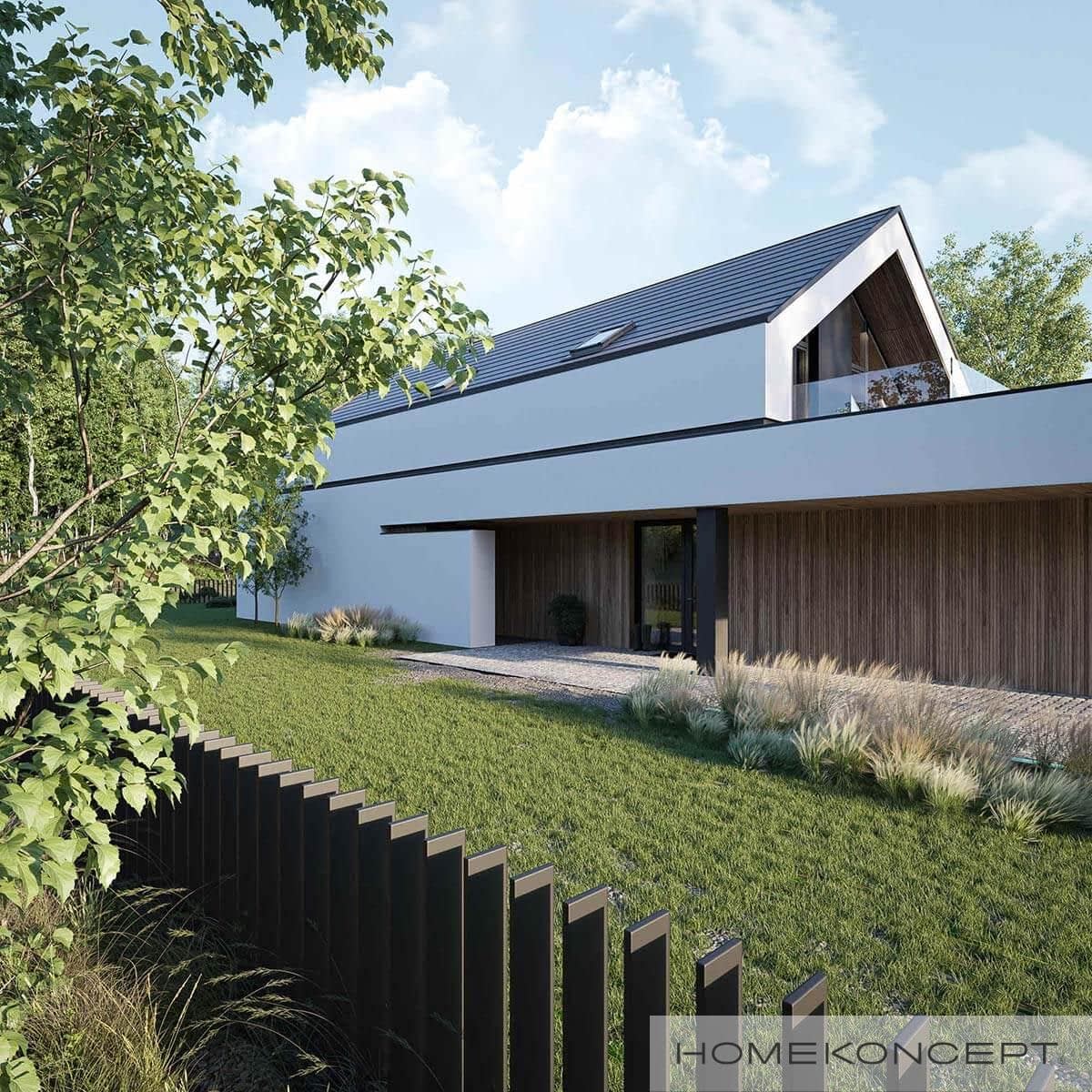 Elewacja: tynk silikonowy w kolorze białym i grafitowym połączony z drewnem elewacyjnym
