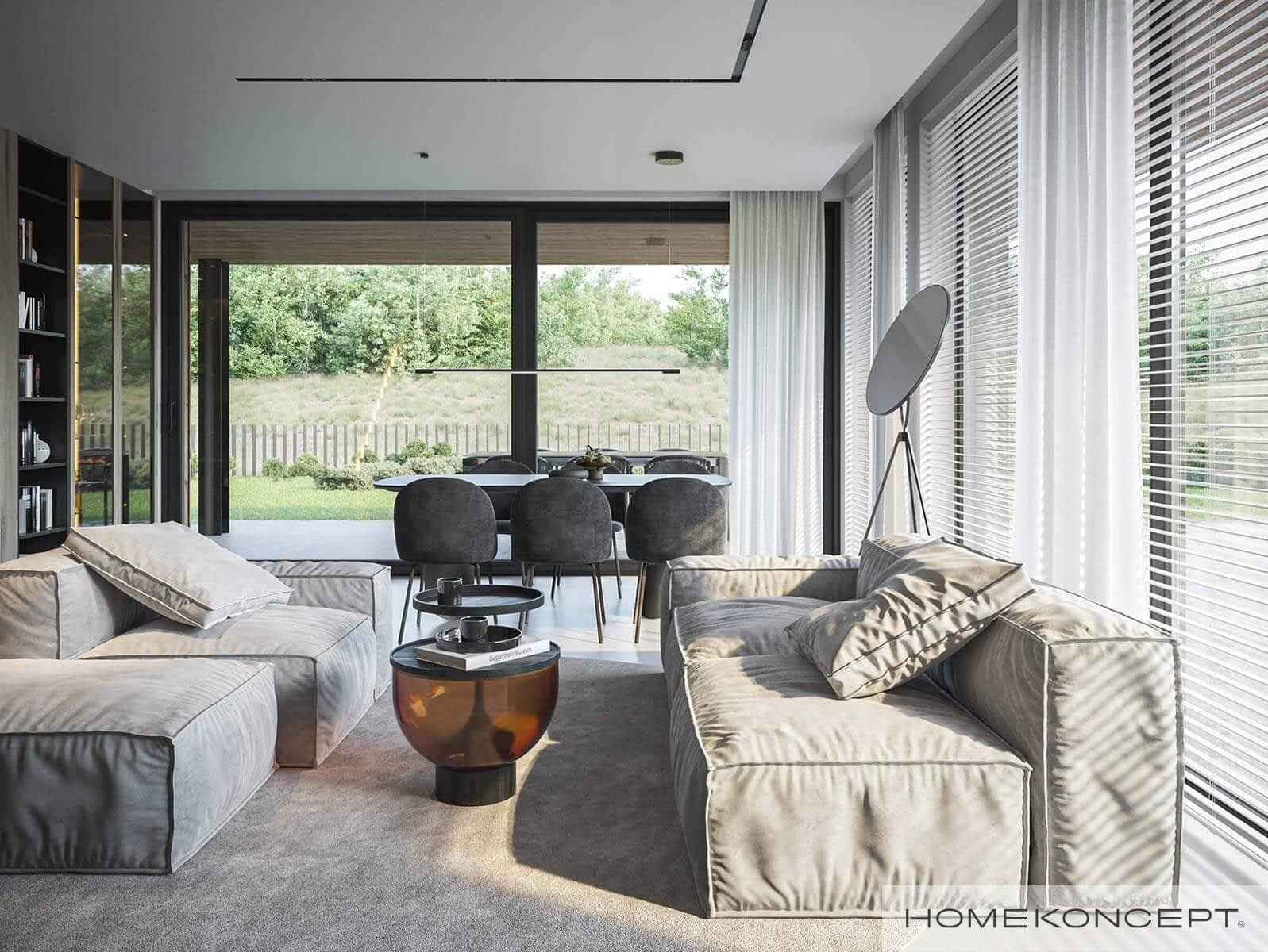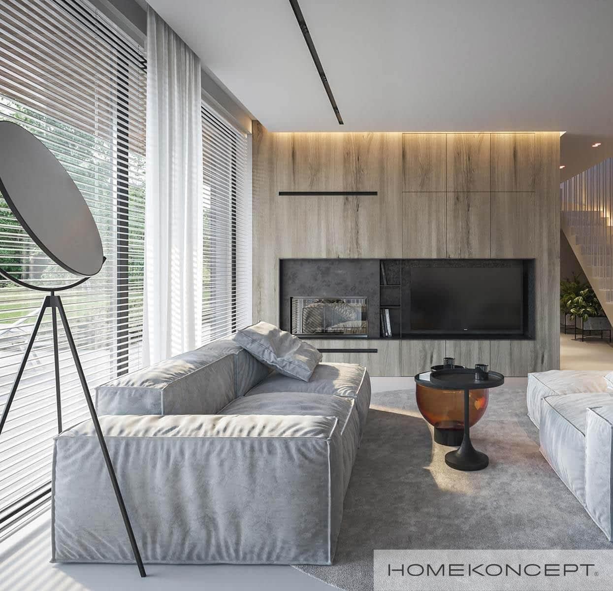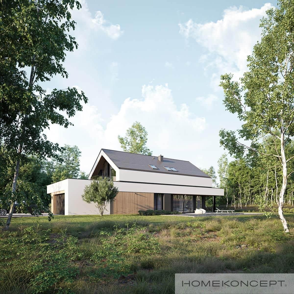 Elewacja: tynk silikonowy w kolorze białym i grafitowym połączony z drewnem elewacyjnym