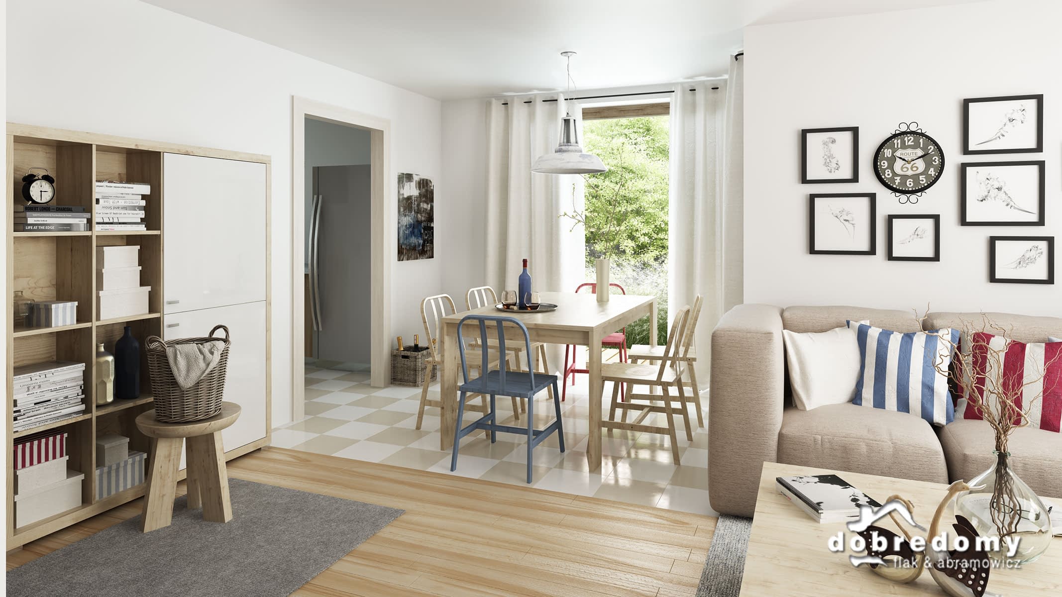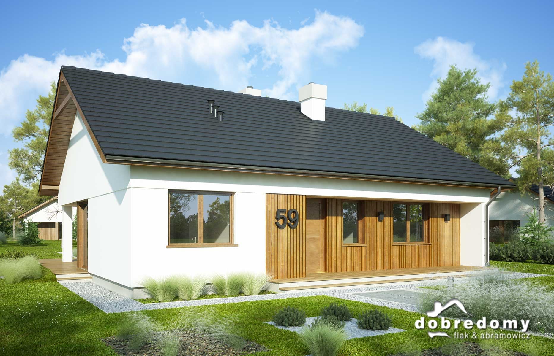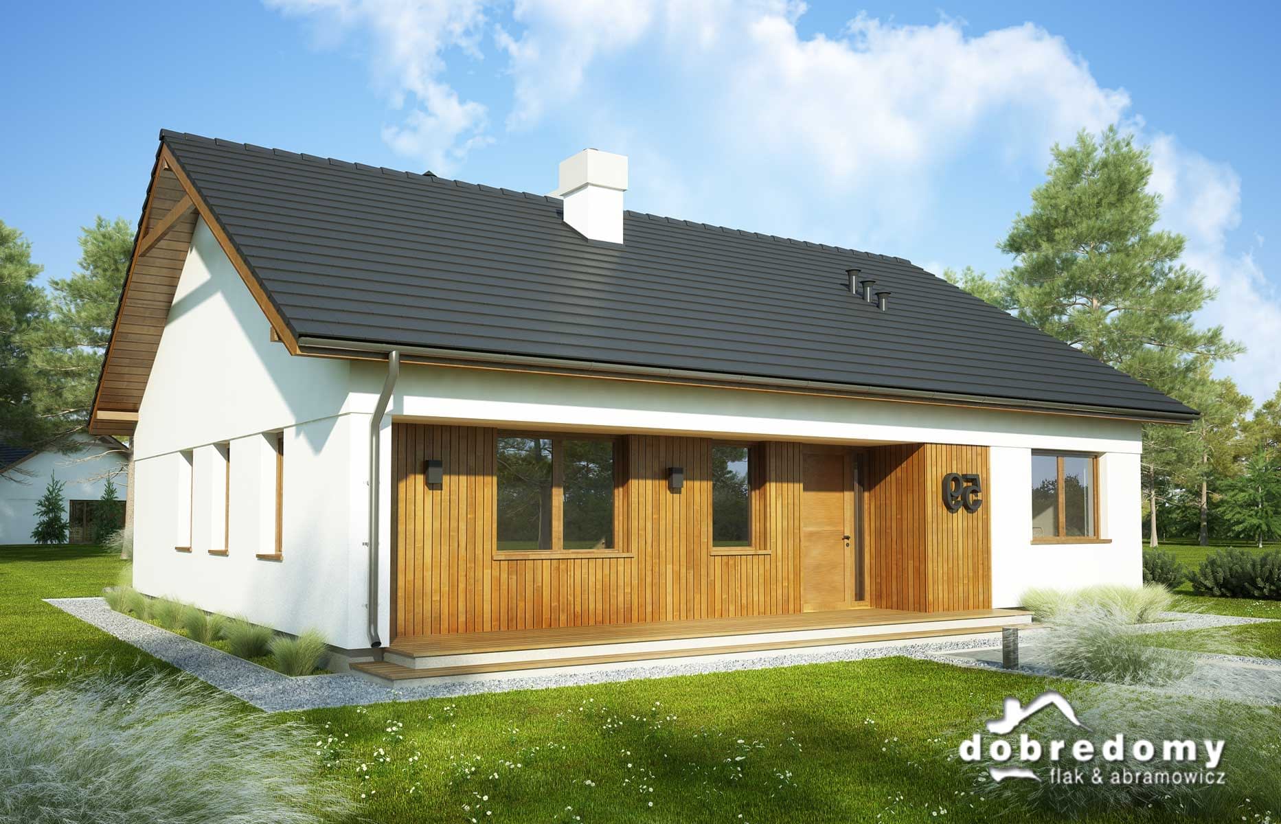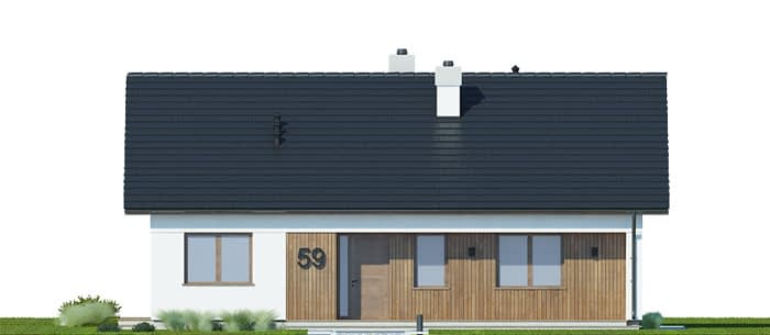 Projekt ładnego, parterowego domu bez garażu, w nowoczesnym stylu, idealny dla 4-osobowej rodziny. Strefa dzienna to pokój dzienny połączony z jadalnią oraz osobna kuchnia, z możliwością rezygnacji ze ścianek działowych. Strefa prywatna to trzy pokoje oraz łazienka. Dodatkowe pomieszczenia w domu to: garderoba i kotłownia zlokalizowane tuż obok wiatrołapu, spiżarnia obok kuchni oraz osobna toaleta.