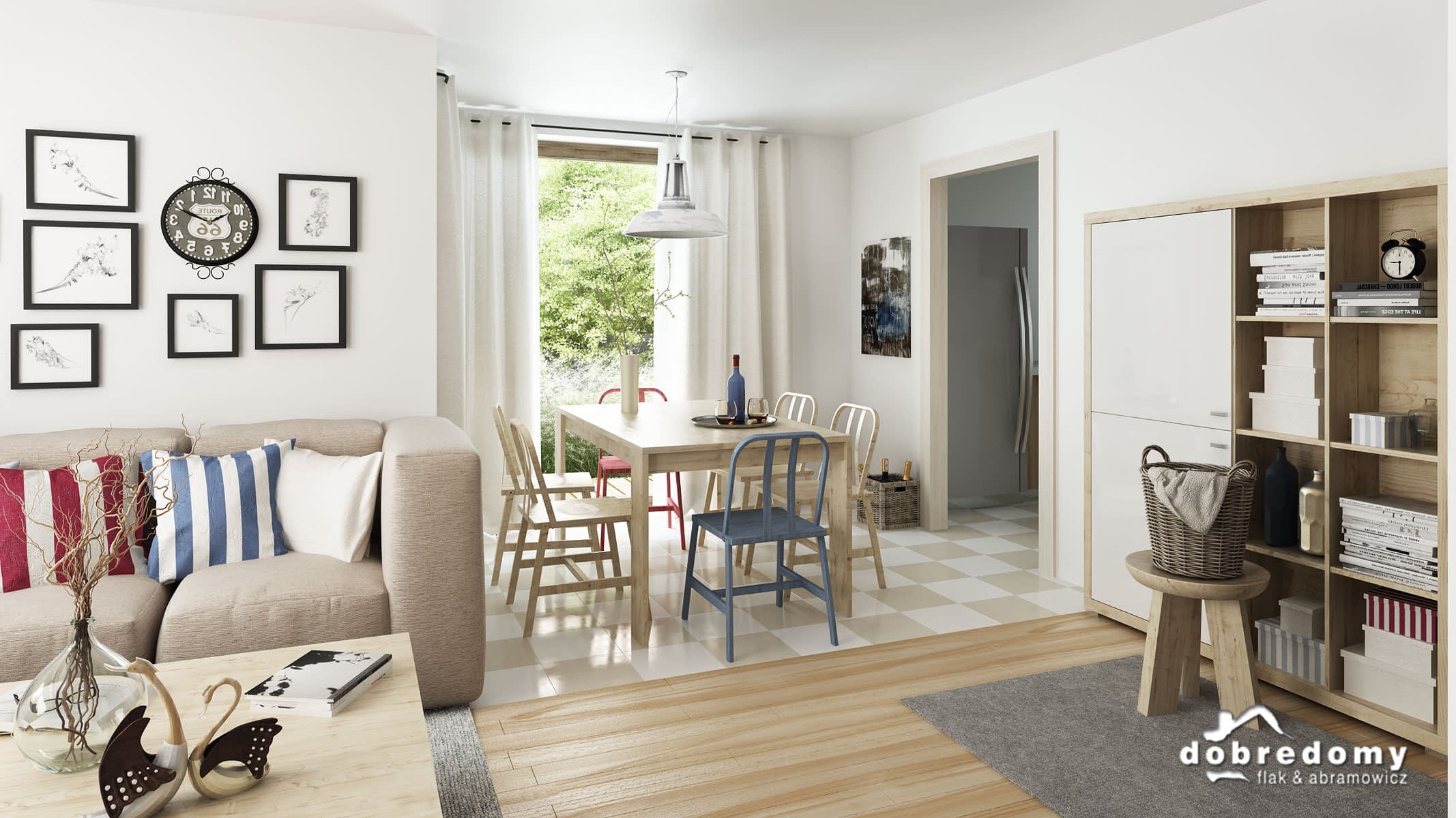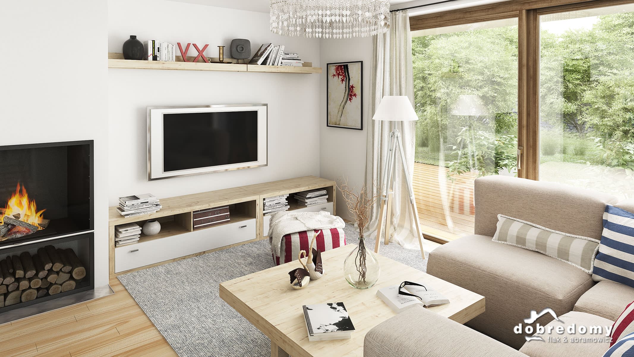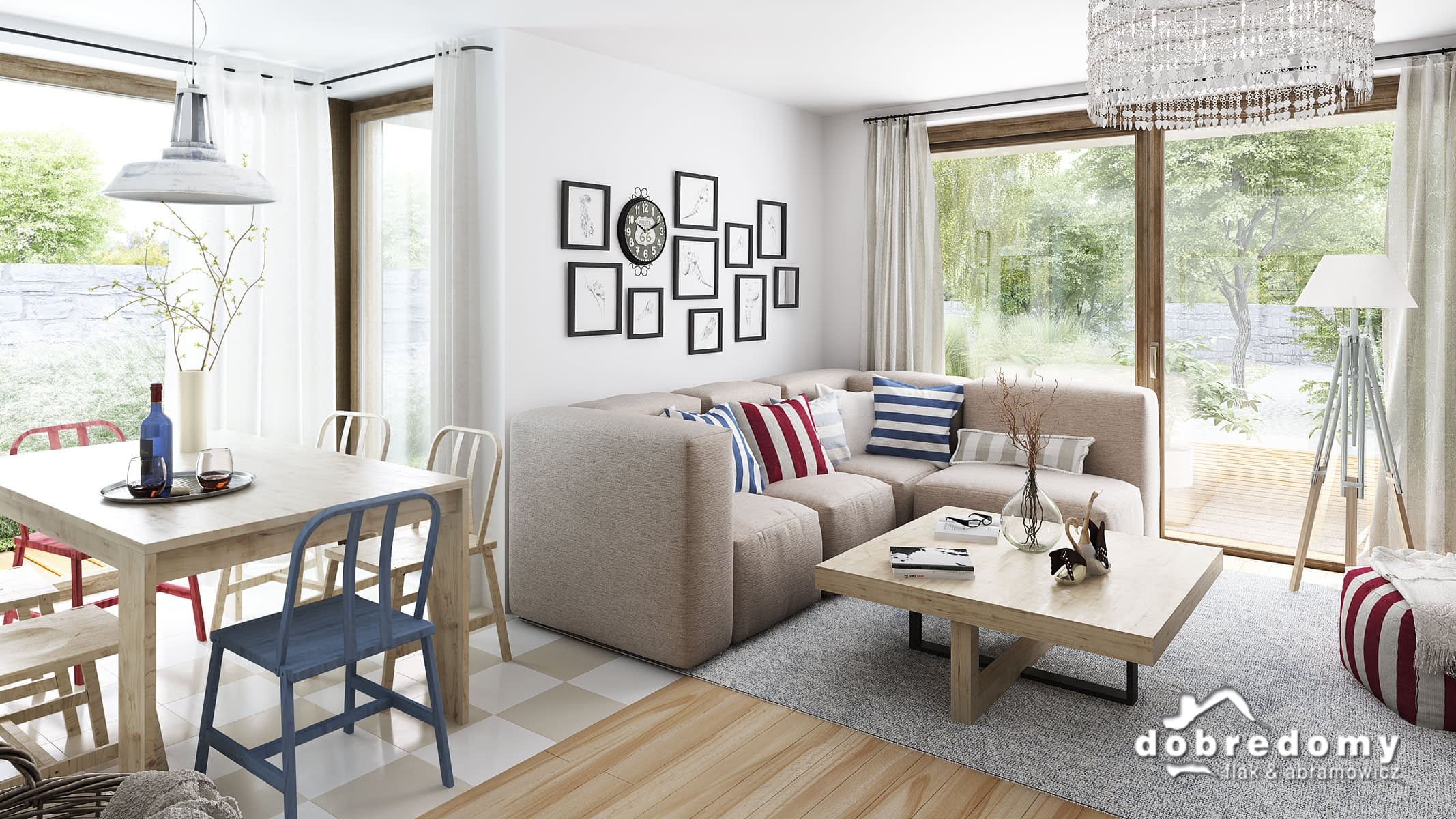 Projekt ładnego, parterowego domu bez garażu, w nowoczesnym stylu, idealny dla 4-osobowej rodziny. Strefa dzienna to pokój dzienny połączony z jadalnią oraz osobna kuchnia, z możliwością rezygnacji ze ścianek działowych. Strefa prywatna to trzy pokoje oraz łazienka. Dodatkowe pomieszczenia w domu to: garderoba i kotłownia zlokalizowane tuż obok wiatrołapu, spiżarnia obok kuchni oraz osobna toaleta.