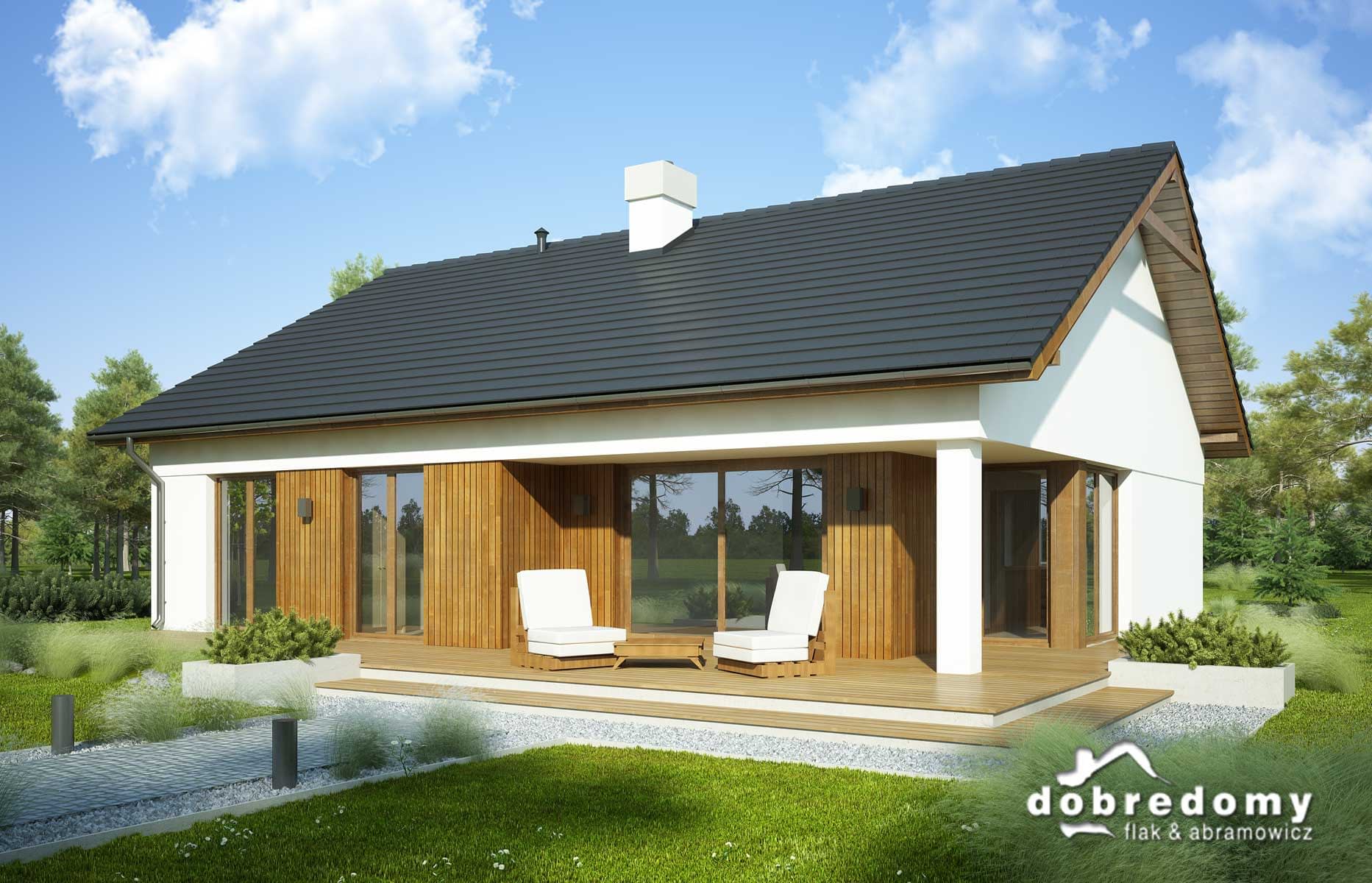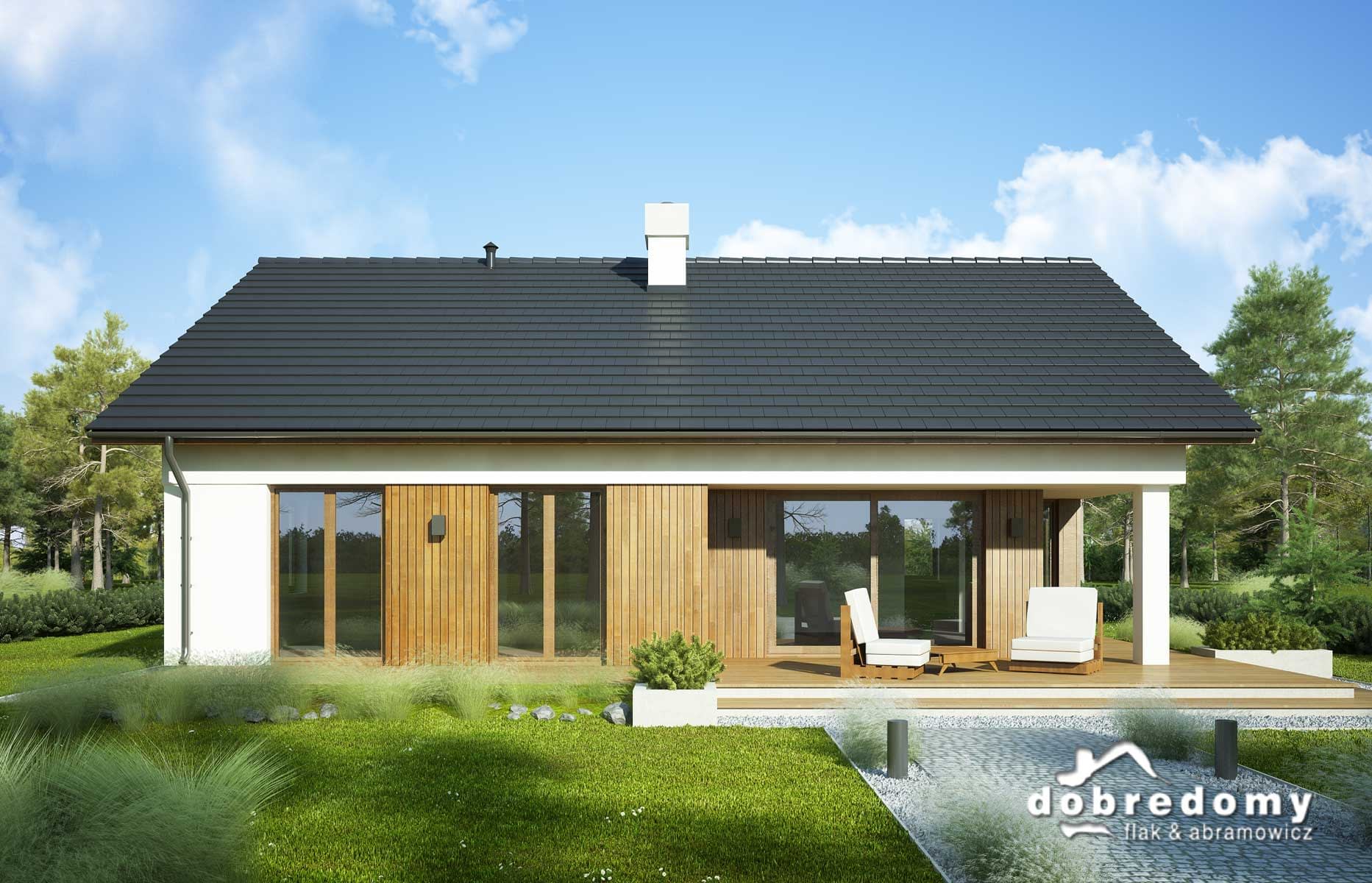 Elewacje pokryte tynkiem strukturalnym w systemie ociepleń Termo Organika oraz okładziną drewnianą. Pokrycie dachu - dachówka ceramiczna lub cementowa CREATON.