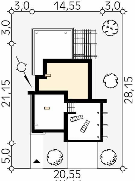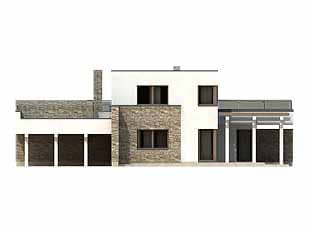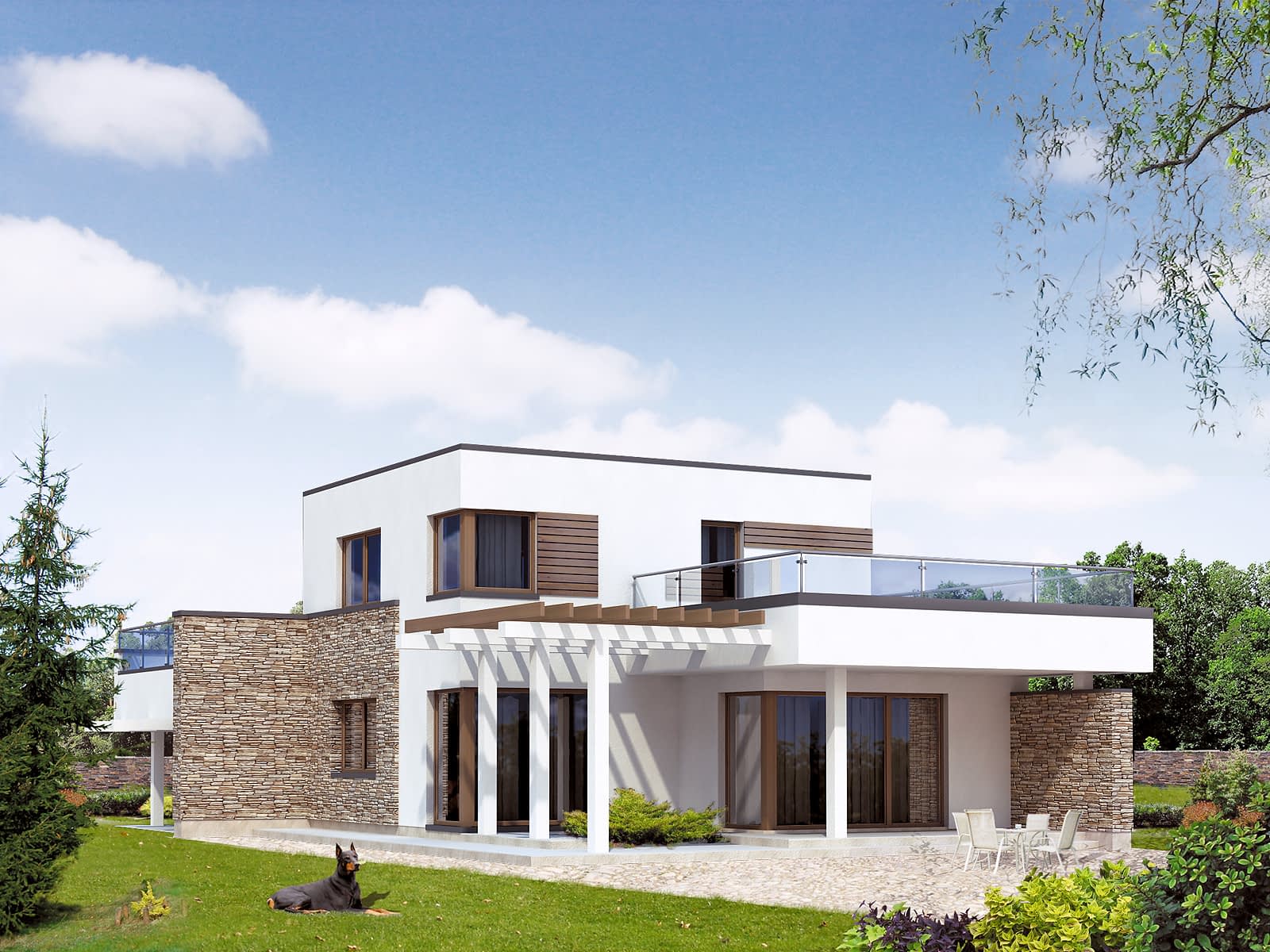 Dom jednorodzinny przeznaczony dla 3 – 4-osobowej rodziny. Wyraźny podział na część dzienną, nocną i gospodarczą. Ciekawa bryła domu utrzymana w duchu modernizmu. Przestronna część dzienna. W obrębie budynku zaprojektowano wiatę na dwa samochody. Duże tarasy na różnych poziomach.Konstrukcja