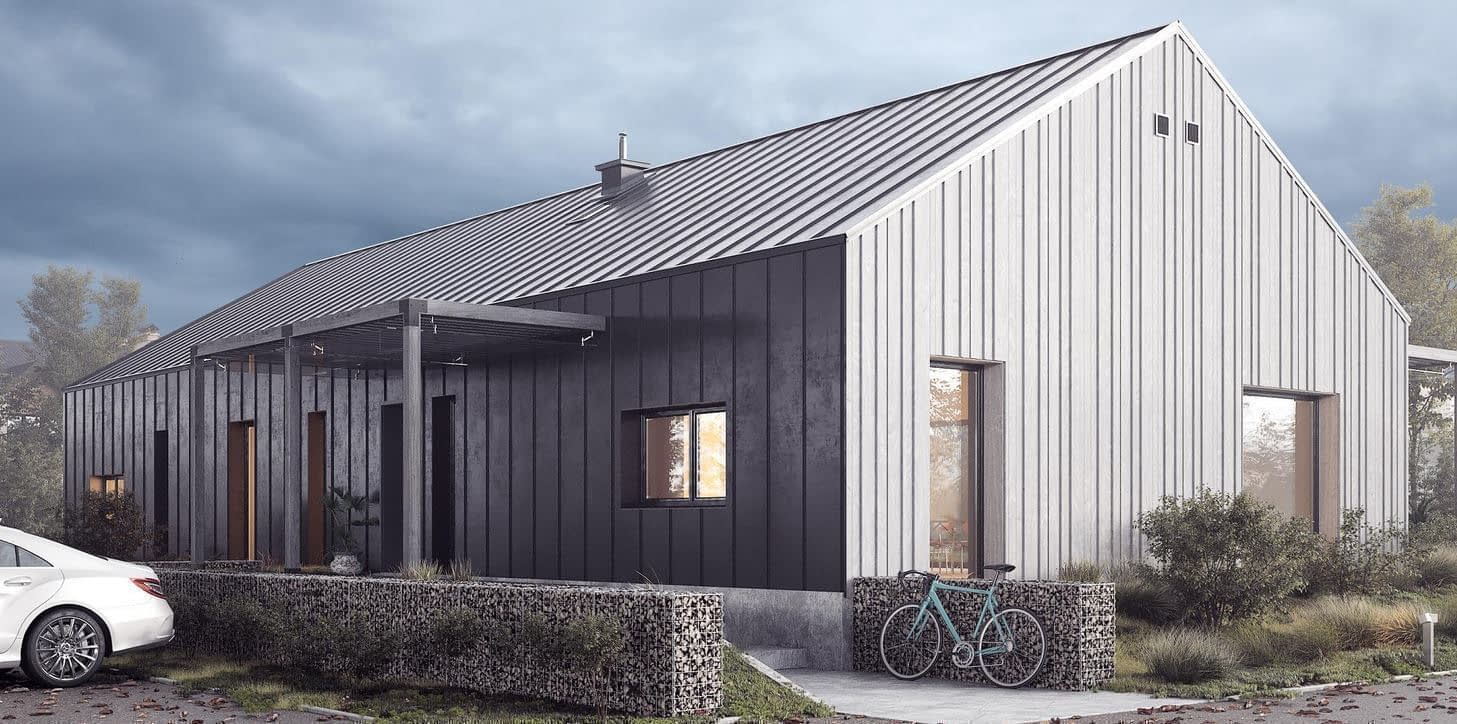 House 25 to projekt domu parterowego cechujący się prostotą wynikającą z zaprojektowanego rzutu regularnego prostokąta oraz układu funkcjonalnego. Stylistykę zewnętrzną podkreśliliśmy materiałami wykończeniowymi: deskami w kolorze szarym, blachą na rąbek elewacji wejściowej oraz pokrycia dachu i dużymi szkleniami elewacji ogrodowej, które otwierają dom na część ogrodową.