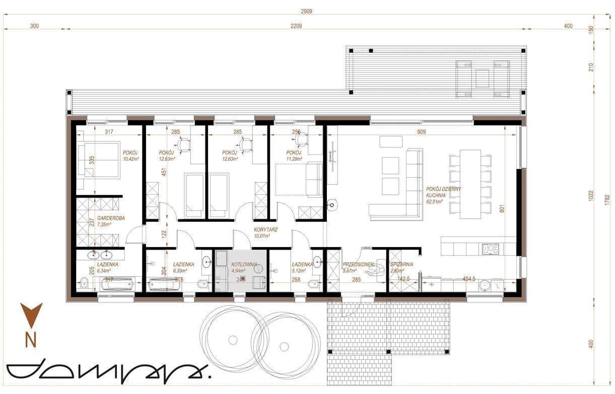 Układ przestrzenny projektu domu wyraźnie dzieli dom na dwie części: ogólną dzienną i prywatną z czterema pokojami oraz pomieszczeniami pomocniczymi. Zastosowane rozwiązania konstrukcyjne pozwalają na realizację części dziennej wysokiej do kalenicy dachu, co podkreśli jej przestrzeń oraz uczyni wnętrze atrakcyjnym zarówno funkcjonalnie , jak i pod względem aranżacji wnętrz. W części prywatnej brak wewnętrznych ścian konstrukcyjnych wspomaga łatwe dostosowanie zaprojektowanego układu funkcjonalnego do potrzeb własnych bez konieczności poważnych zmian konstrukcyjnych budynku.