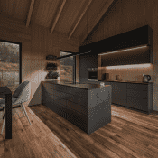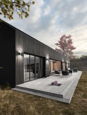 Główną część domu stanowi przestronny salon z otwartą kuchnią, który tworzy serce przestrzeni mieszkalnej. Dzięki dużym przeszkleniom wnętrze jest pełne naturalnego światła i otwarte na ogród. Po jednej stronie znajduje się sypialnia główna, natomiast po drugiej dwa pokoje oraz łazienka, co zapewnia domownikom komfort i prywatność.