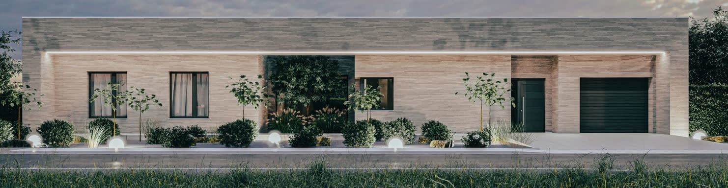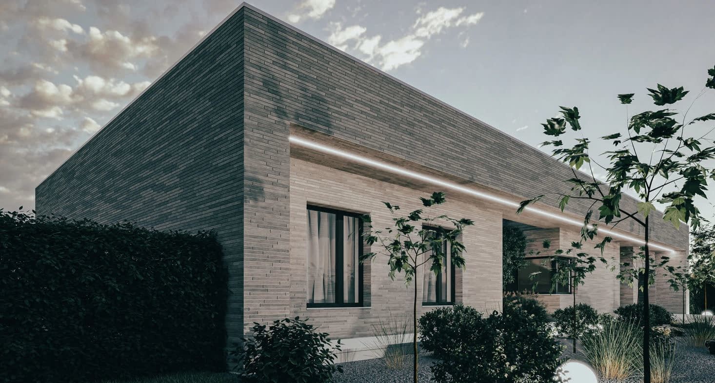 Dom z dachem płaskim reprezentuje prostą minimalistyczną nowoczesną architekturę. Elewacja frontowa obudowana ramą posiada akcent w postaci zielonego patio ograniczającego wgląd do pokoju dziennego, tworząc jednocześnie bufor dla słońca w okresie letnim. Budynek w części ogrodowej uzupełniony został o funkcję rozbudowanego tarasu.