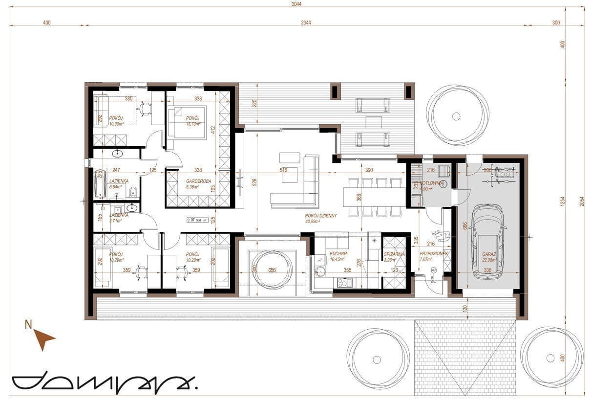 Układ funkcjonalny budynku podporządkowany został zasadzie strefowania funkcji. Wydzielona strefa wejściowa połączona z garażem jednostanowiskowym, który bez większych problemów można rozbudować o drugie stanowisko, prowadzi do otwartej części dziennej, w której wyodrębniono jadalnię, strefę wypoczynkową oraz półotwartą kuchnię ze spiżarnią. W części tej układ przestrzenny zapewnia swobodne, bezkolizyjne przejście do części tzw prywatnej, na którą składają się dwa pokoje, sypialnia główna z garderobą, pokój gościnny mogący pełnić funkcję gabinetu oraz dwie łazienki. Projekt dedykowany dla działek z wjazdem od strony południowej.
