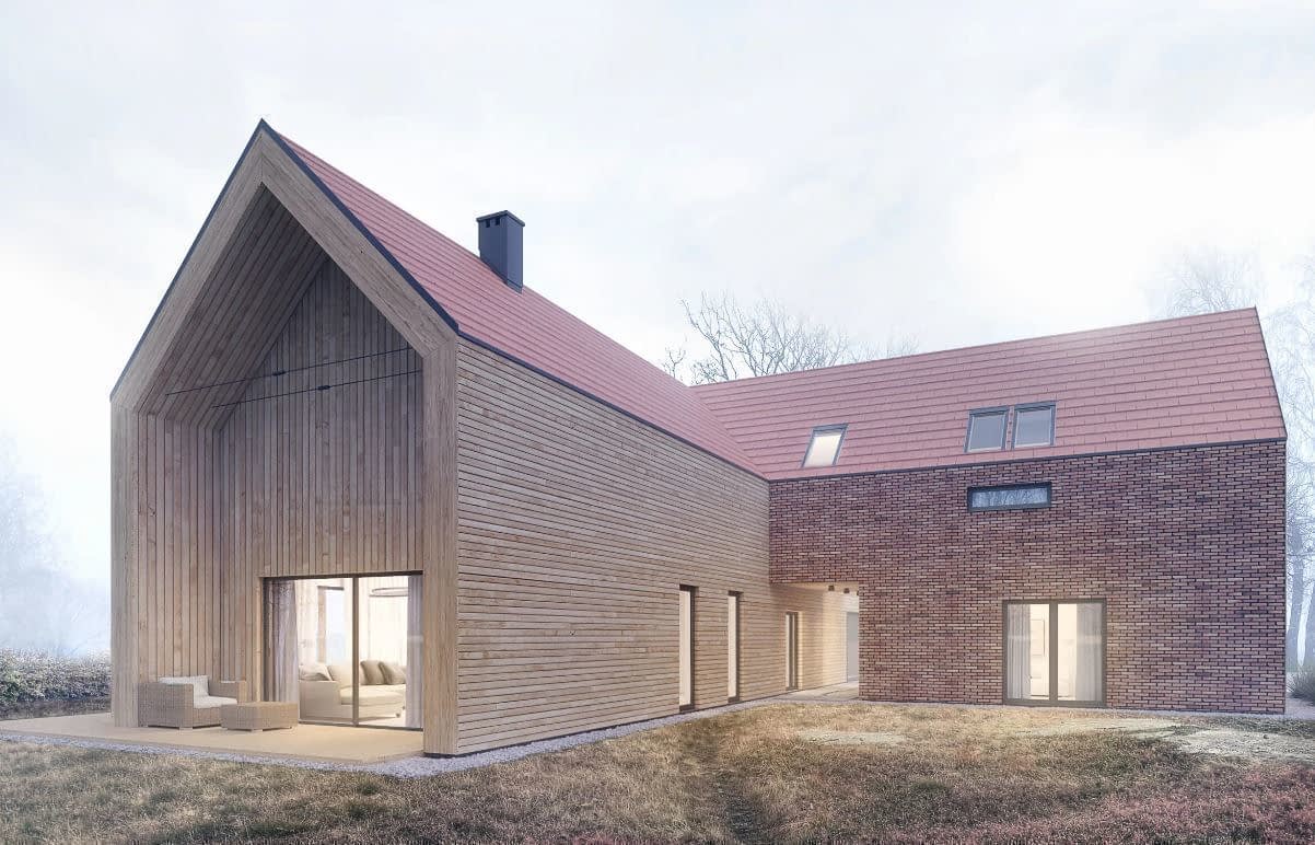 Bryła budynku założona została na odwróconej literze T, która z jednej strony tworzy otwarty dziedziniec wejściowy z wjazdem do parterowego garażu dwustanowiskowego, z drugiej, osłoniętej dwukondygnacyjną częścią mieszkalną, otwiera się na ogród.