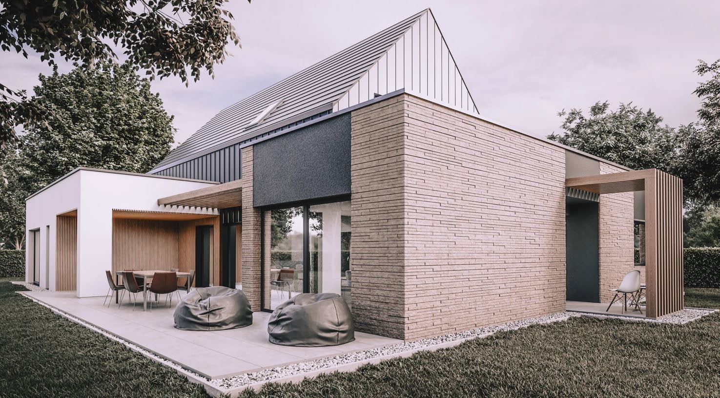 Budynek w podstawie zaprojektowany jako parterowy o geometrycznej, nowoczesnej bryle, na której posadowiono tradycyjną formę dachu dwuspadowego zamykającą nie duża powierzchnie poddasza użytkowego. Dom w poziomie parteru zaprojektowano na rzucie rozbudowanego prostokąta, co sprzyjało otwieraniu pomieszczeń na ogród oraz wprowadzeniu strefowania funkcji.