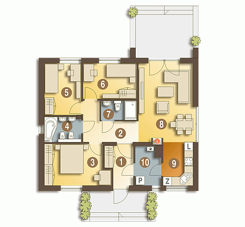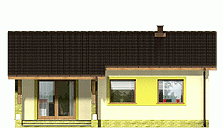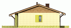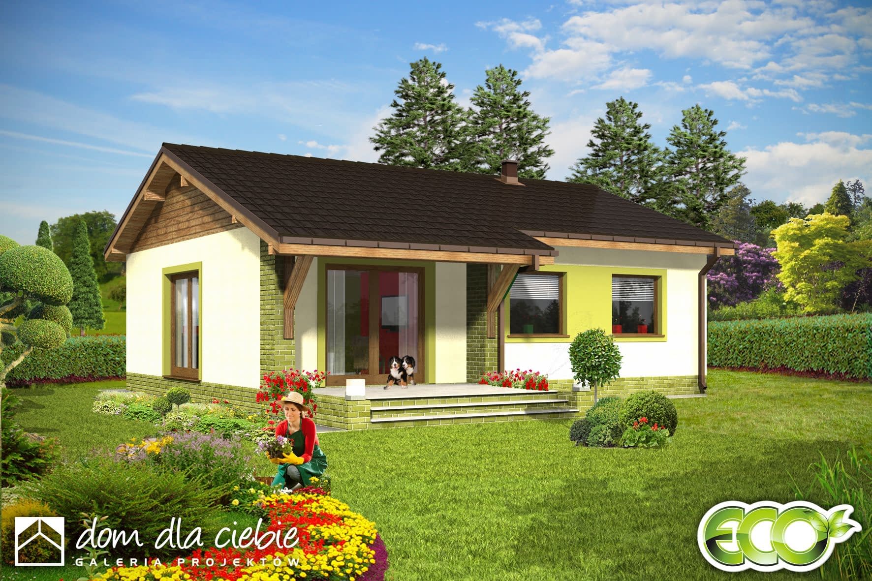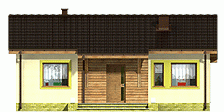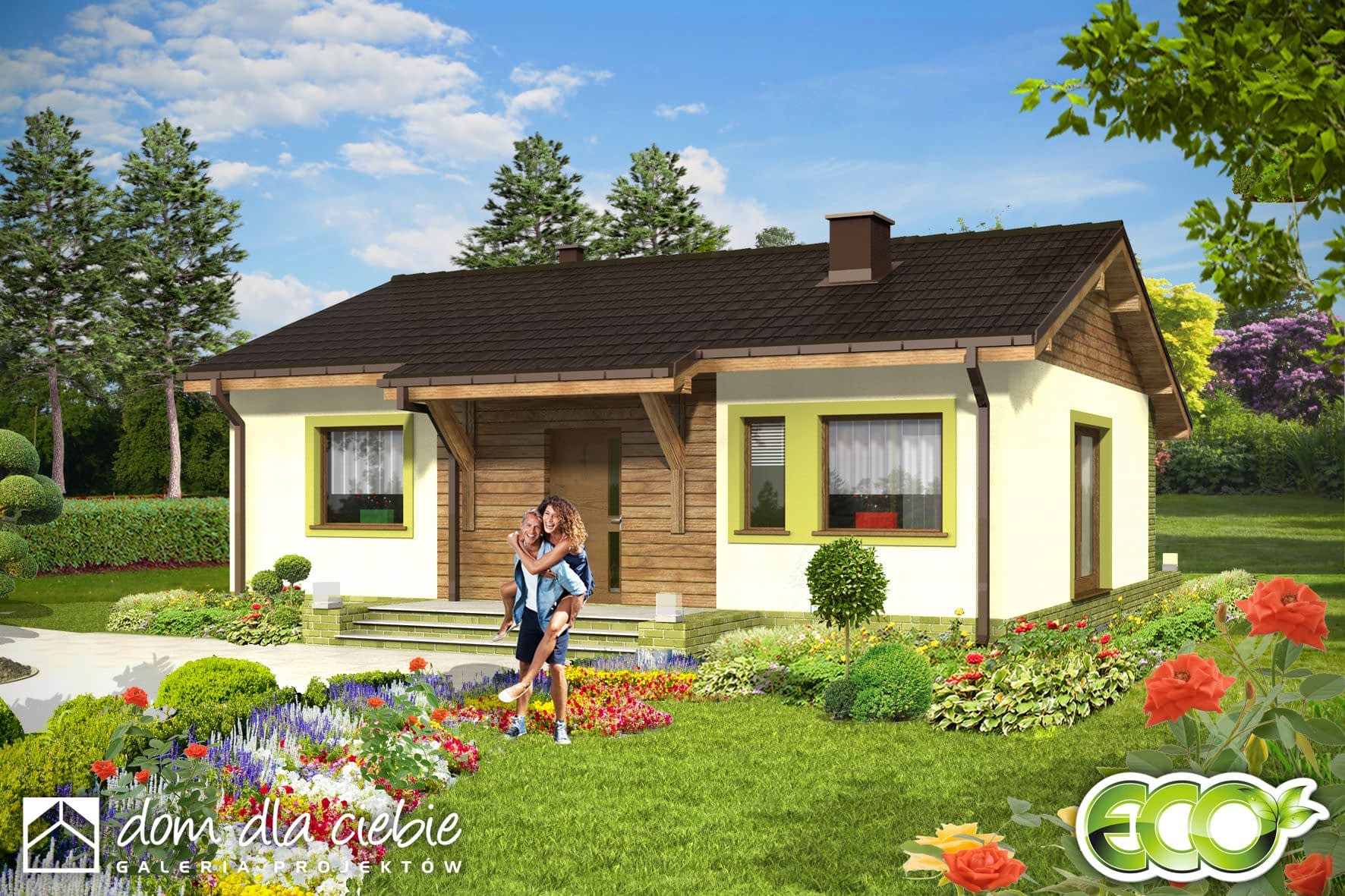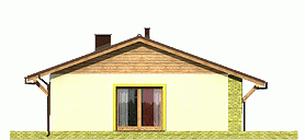 Prosty i zgrabny dom parterowy dla 4-osobowej rodziny. Budynek na niewielkiej powierzchni mieści wszystkie potrzebne pomieszczenia: 3 sypialnie, pokój dzienny z wyjściem na zadaszony taras, ustronnie położoną kuchnię, niemałe pom. techniczne z piecem i pralką, dwie łazienki, oraz w wersji z garażem z boku dodatkowe pom. gospodarcze z wejściem od ogrodu, które można przeznaczyć na kotłownię na paliwo stałe. Dom ten dzięki niewielkim gabarytom, prostej bryle, dwuspadowym dachu oraz nieskomplikowanym rozwiązaniom konstrukcyjnym daje możliwość niedrogiej realizacji.