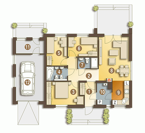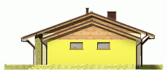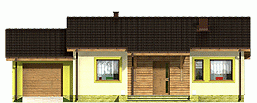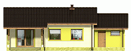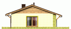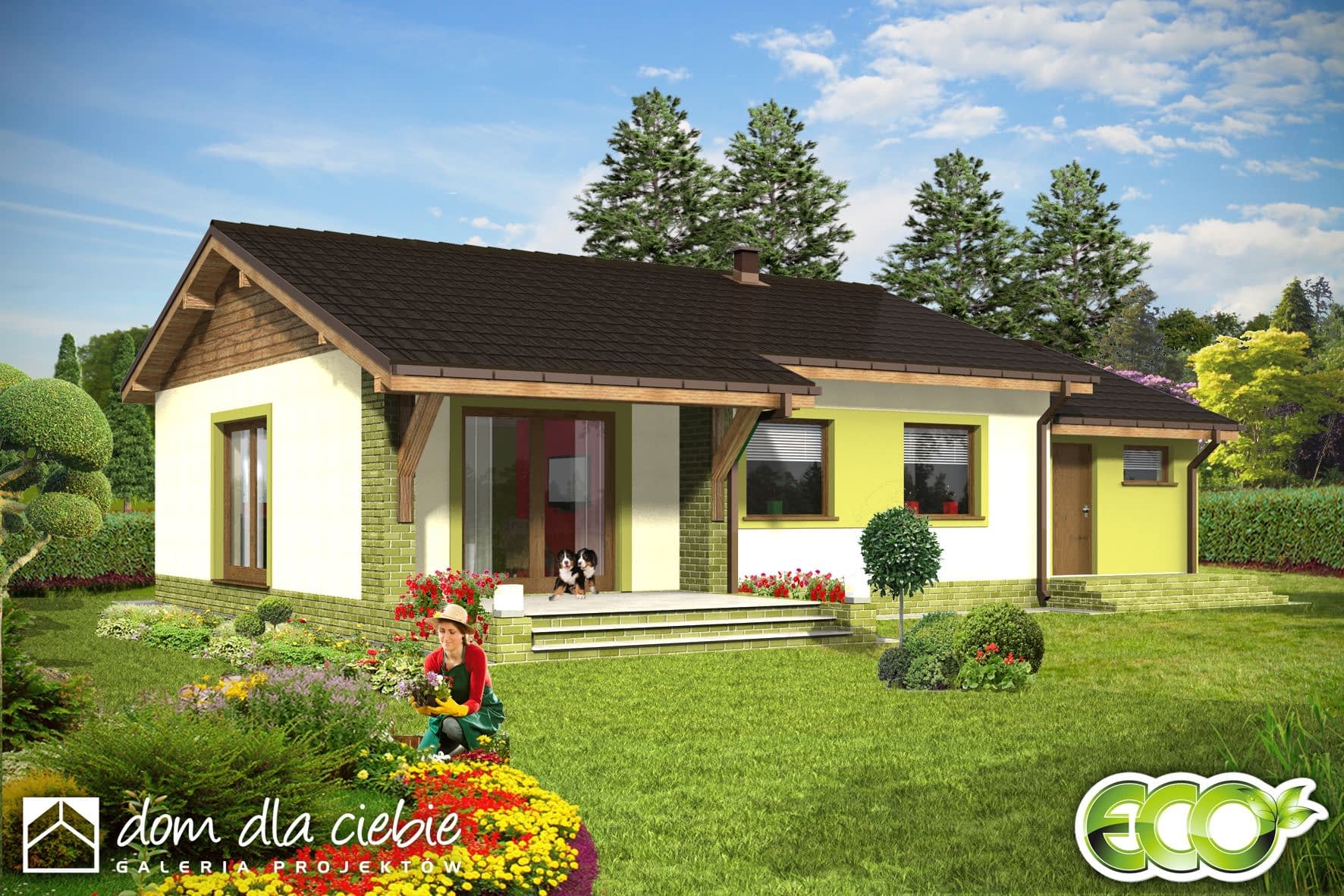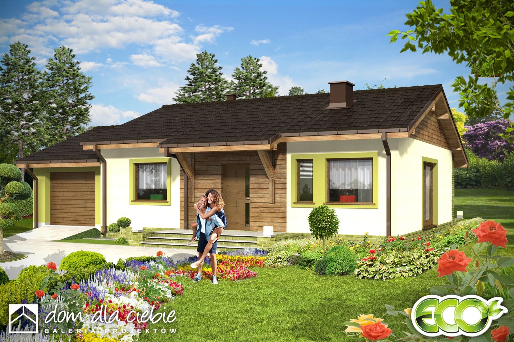 Prosty i zgrabny dom parterowy dla 4-osobowej rodziny. Budynek na niewielkiej powierzchni mieści wszystkie potrzebne pomieszczenia: 3 sypialnie, pokój dzienny z wyjściem na zadaszony taras, ustronnie położoną kuchnię, niemałe pom. techniczne z piecem i pralką, dwie łazienki, oraz w wersji z garażem z boku dodatkowe pom. gospodarcze z wejściem od ogrodu, które można adaptować na kotłownię na paliwo stałe. Dom ten dzięki niewielkim gabarytom, prostej bryle, dwuspadowym dachu oraz nieskomplikowanym rozwiązaniom konstrukcyjnym daje możliwość niedrogiej realizacji.