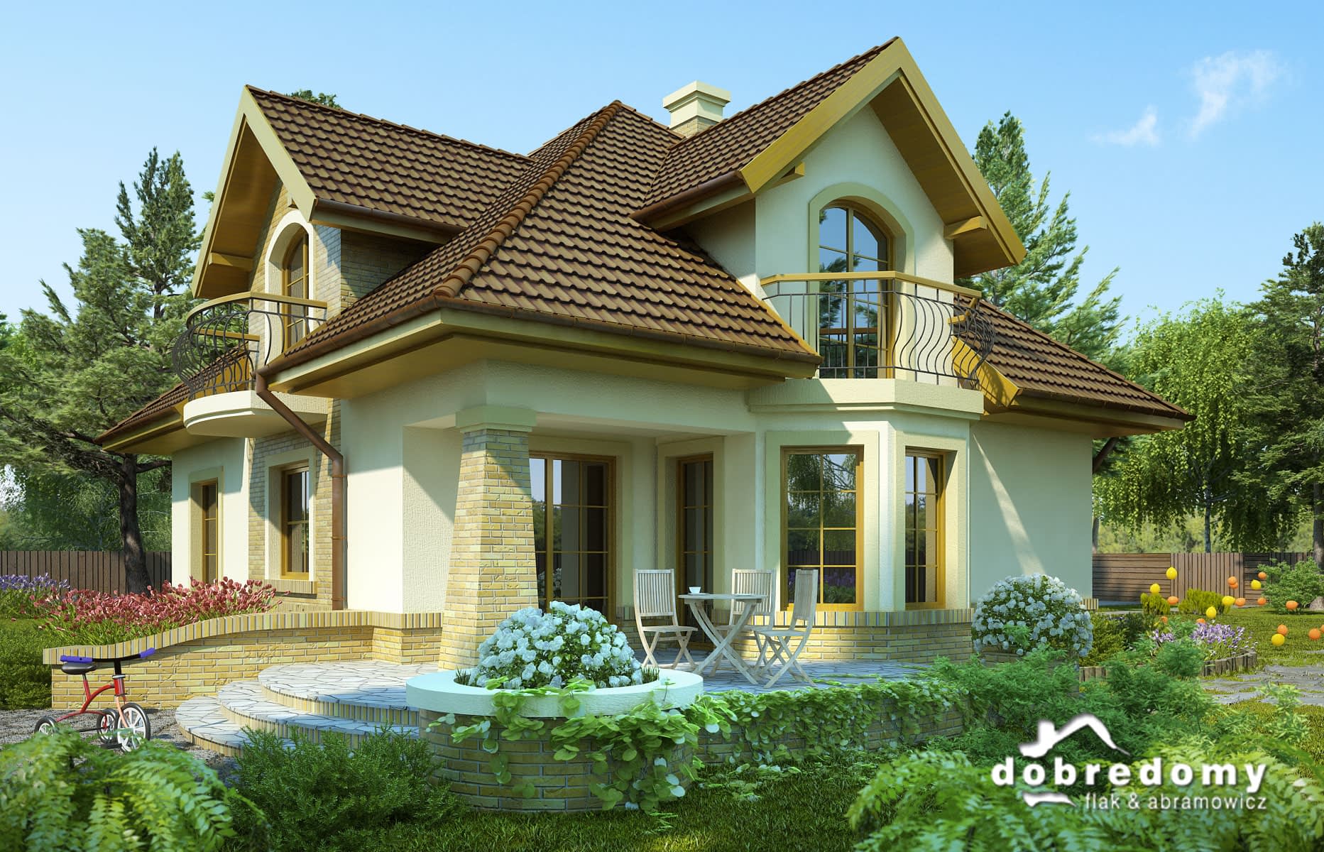 - Kolorystyka elewacji, detali dekoracyjnych, kształtu podjazdów i tarasów.