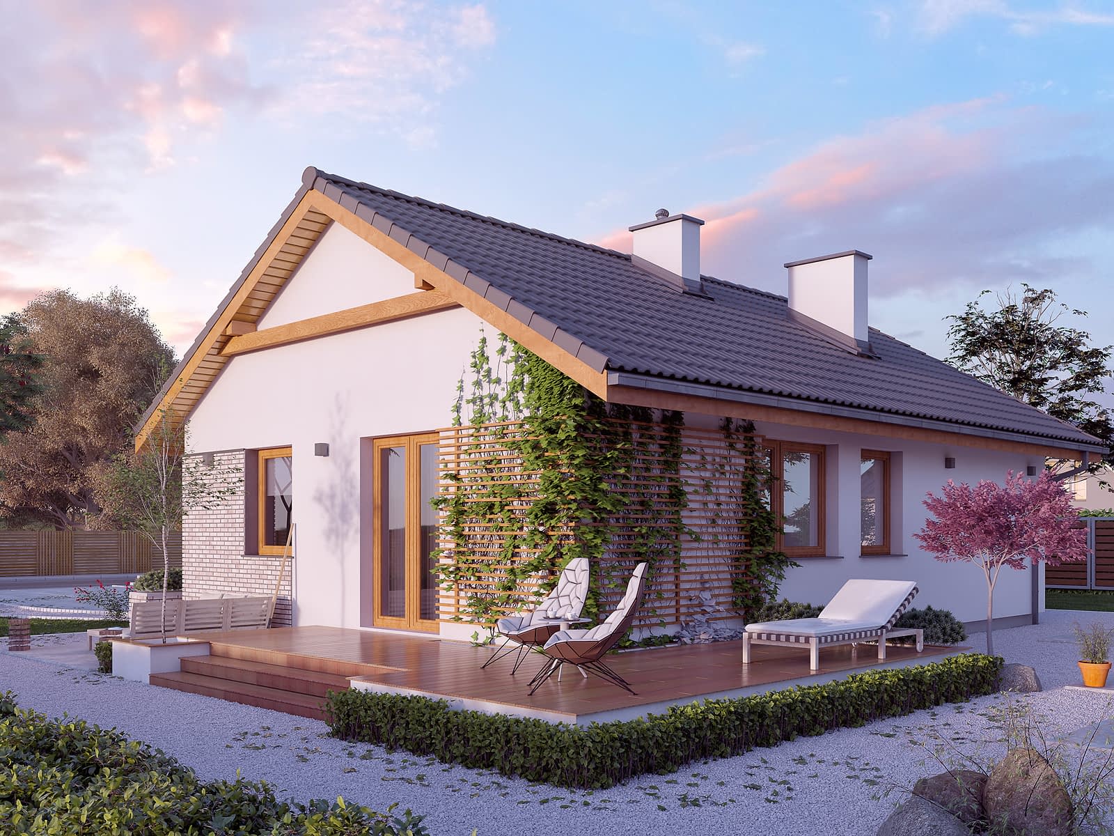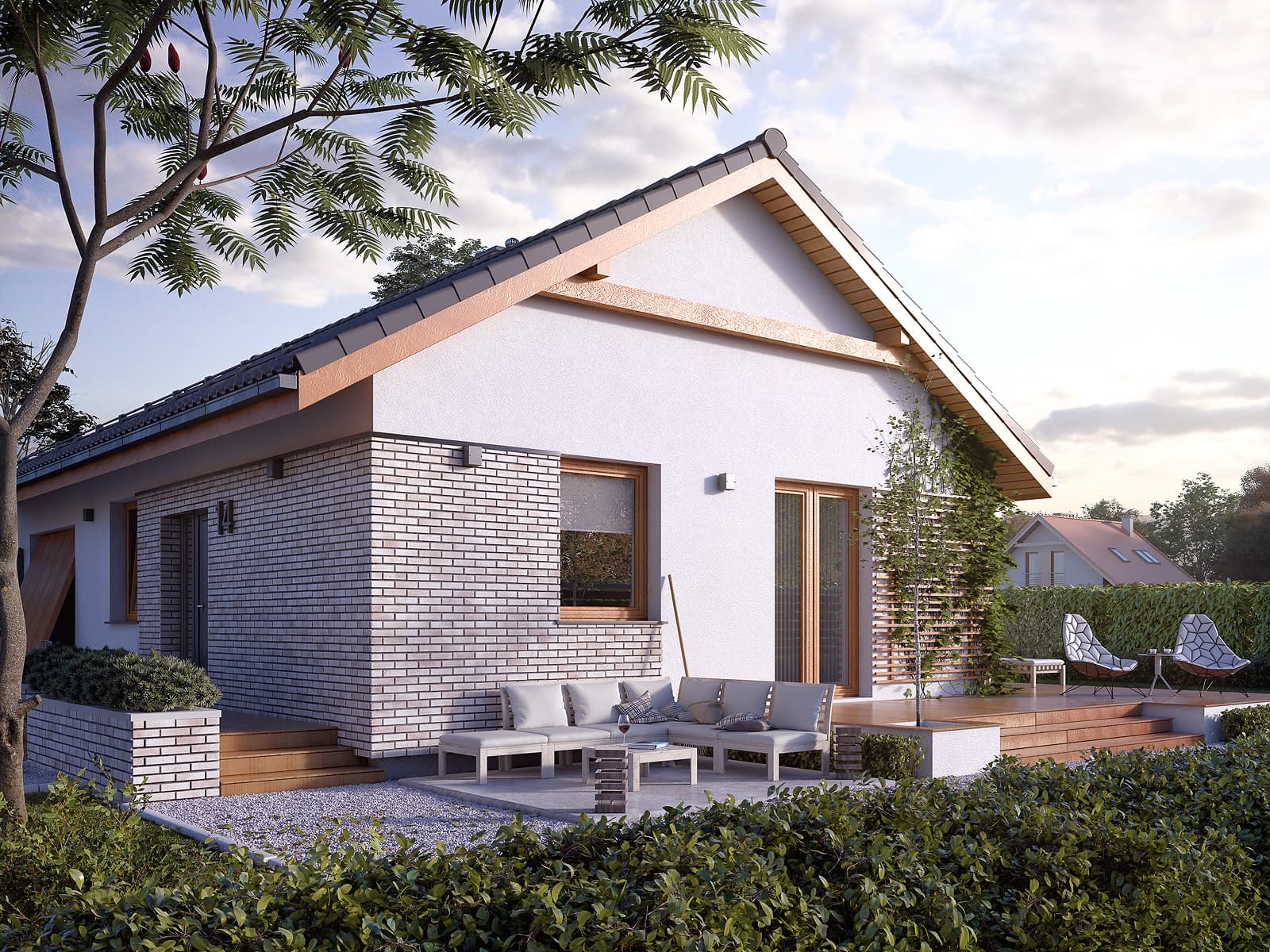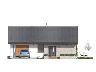 Mały, wygodny dom parterowy z garażem. Prosta bryła czyni dom tanim w budowie i użytkowaniu. Program funkcjonalny idealny dla małej rodziny. Duży taras połączony z pokojem dziennym stanowi jego przedłużenie w miesiącach letnich.Konstrukcja