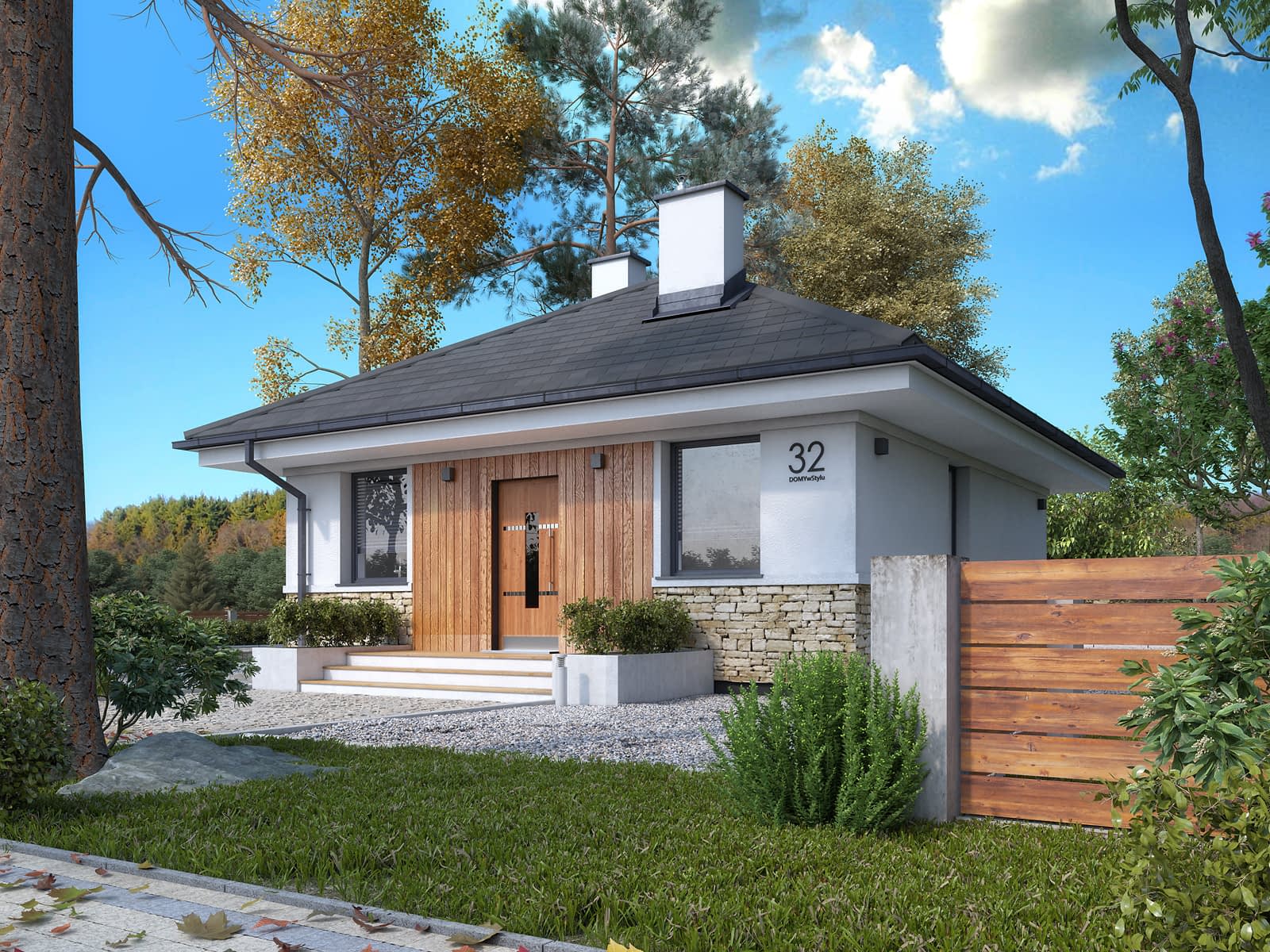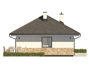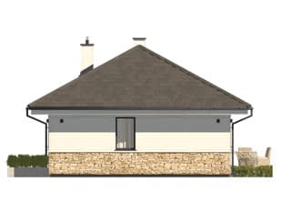 Projekt Imbir 5 to projekt domu parterowego, który stanowi alternatywę dla mieszkania w bloku. Prosta bryła przykryta dwuspadowym dachem czynią ten projekt niedrogim w realizacji oraz utrzymaniu. Pomimo niedużej powierzchni układ funkcjonalny zapewnia maksymalny komfort użytkowania. Z przedsionka znajduje się wejście do otwartej strefy dziennej z kuchnią połączoną z jadalnią oraz salonem. W salonie przewidziano miejsce na narożną kanapę do odpoczynku przy kominku oraz kącik telewizyjny. W projekcie znajduje się również sypialnia, która pomieści duże łóżko oraz pojemną szafę. Uzupełnieniem układu funkcjonalnego jest łazienka oraz pomieszczenie gospodarcze dostępne z przedsionka. Dodatkowym atutem projektu jest taras okalający budynek z dwóch stron, który dzięki przesuwnym drzwiom może stanowić przedłużenie salonu w ciepłe letnie dni.Konstrukcja