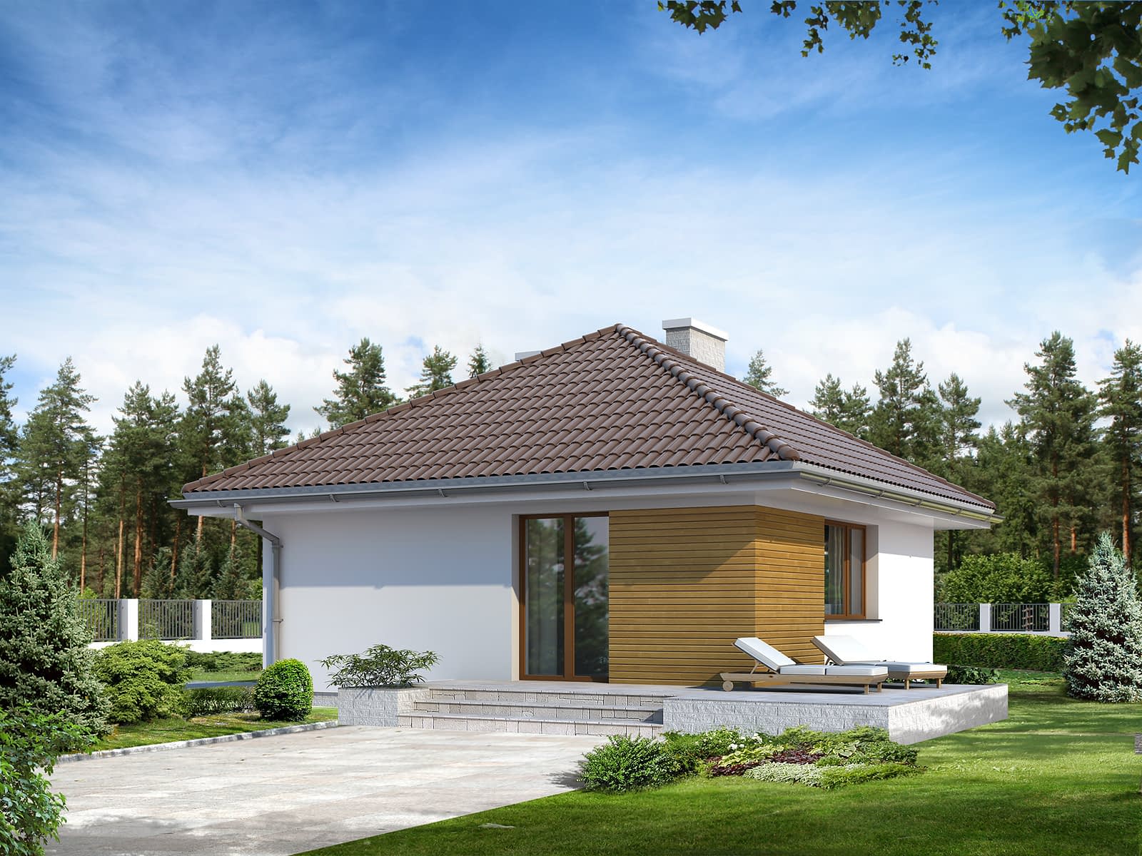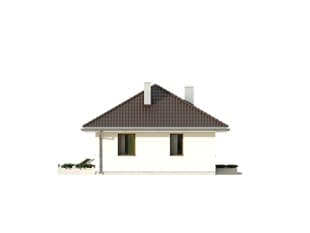 Mały, wygodny dom parterowy. Prosta bryła i oszczędny detal czynią dom tanim w budowie i użytkowaniu. Program funkcjonalny idealny dla małej rodziny. Duży taras połączony z pokojem dziennym.Konstrukcja