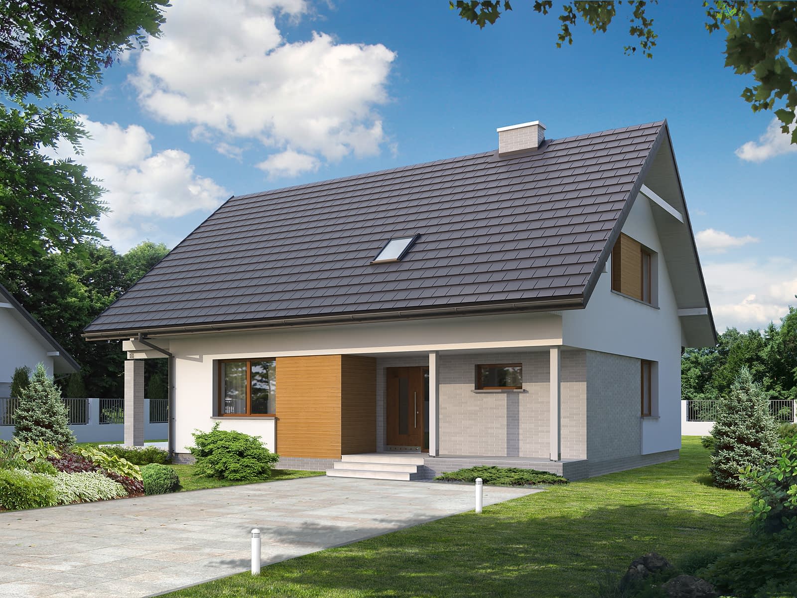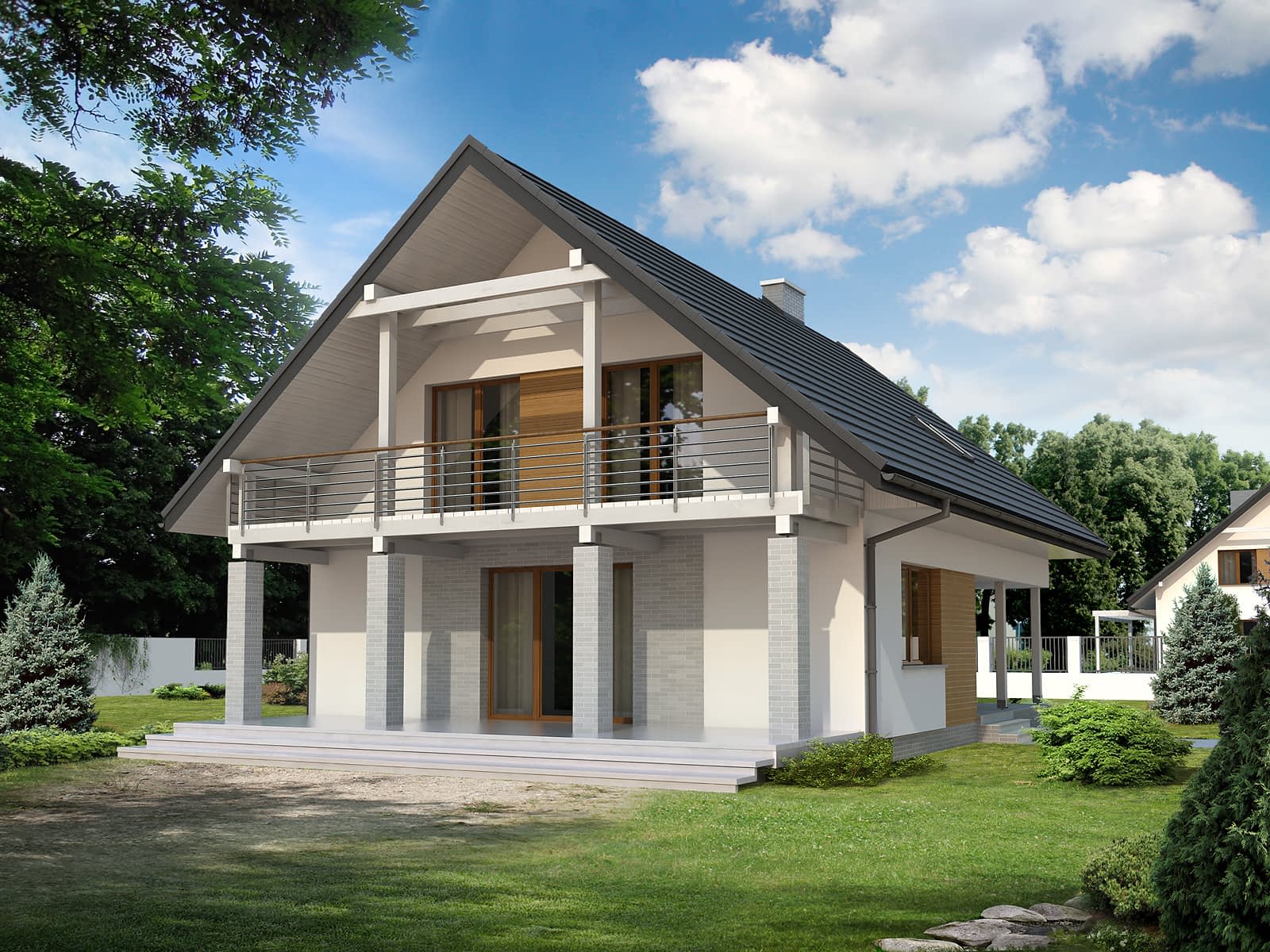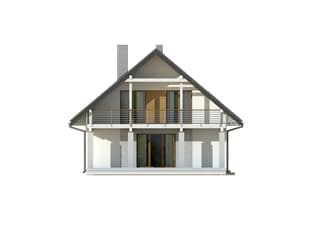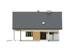 Dwukondygnacyjny, energooszczędny dom z jednostanowiskowy garażem, przeznaczony dla 5-osobowej rodziny. Budynek o ciekawej i eleganckiej architekturze. Na parterze, oprócz części dziennej składającej się z salonu, jadalni i kuchni ze spiżarnią, zaprojektowano też dodatkowy pokój. Na piętrze znajdują się trzy sypialnie, dwie łazienki oraz wolna przestrzeń, którą można zaadaptować na dodatkowy pokój.Konstrukcja