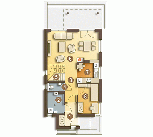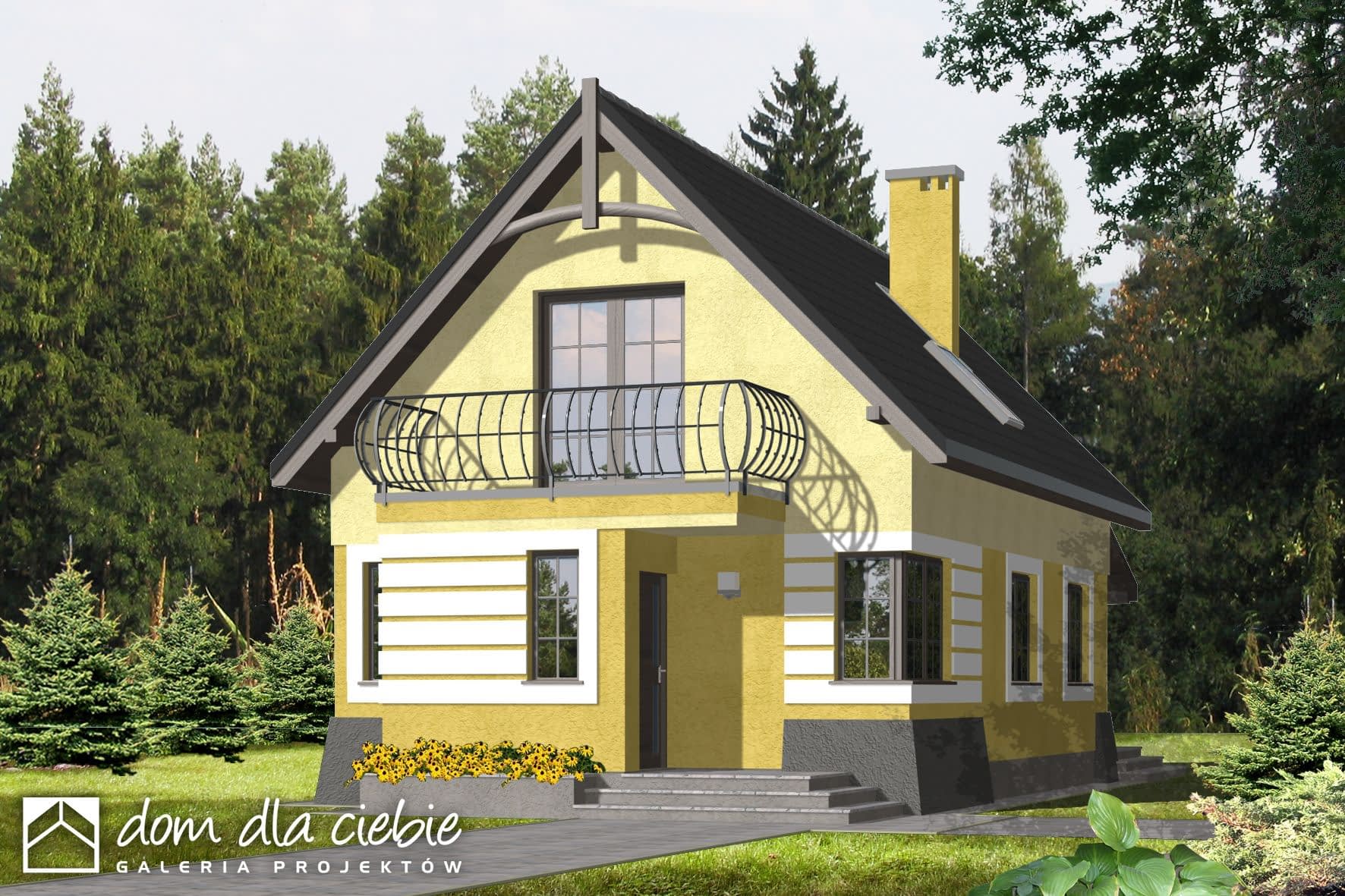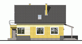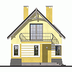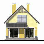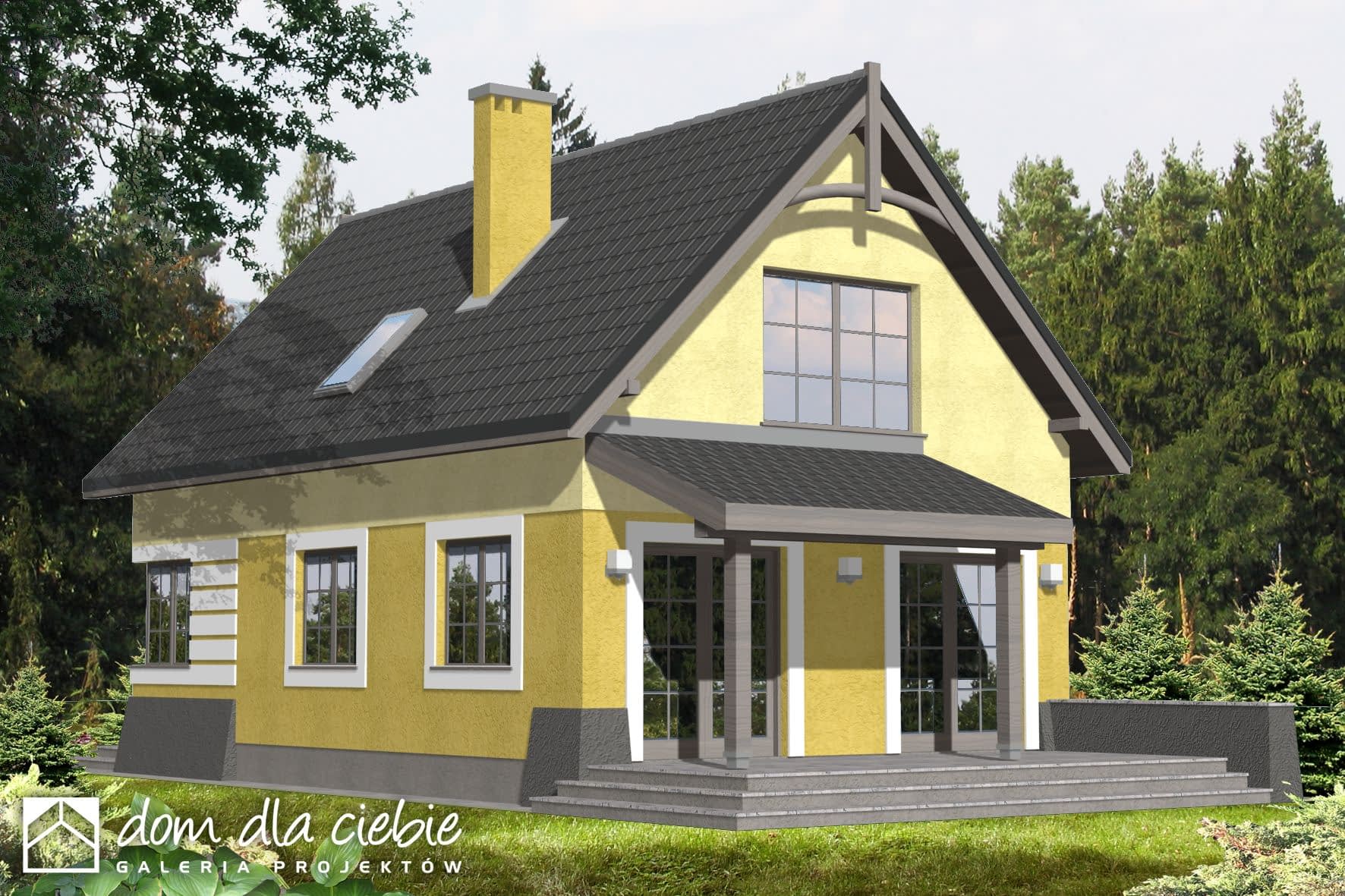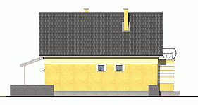 Zgrabny, niewielki dom jednorodzinny, zaprojektowany na wąską działkę, dla 4 osobowej rodziny, nadający się na dom całoroczny lub letniskowy. Drzwi wejściowe chronione są przed opadami funkcjonalnym podcieniem, natomiast jedno z wyjść tarasowych z p. dziennego przestronnym daszkiem na słupach. Z wiatrołapu dostępne jest pom. gospodarcze z piecem C.O.. Kuchnię, w zależności od upodobań inwestorów, można pozostawić otwartą lub zamknąć ściankami działowymi. Na poddaszu zaprojektowano 2 małe sypialnie, jedną większą z wewnętrzną garderobą oraz łazienkę. Wszystkie pomieszczenia, w wersji bez garażu, doświetlone są światłem dziennym.