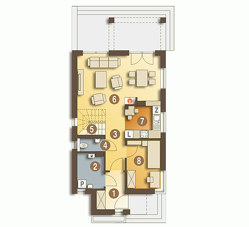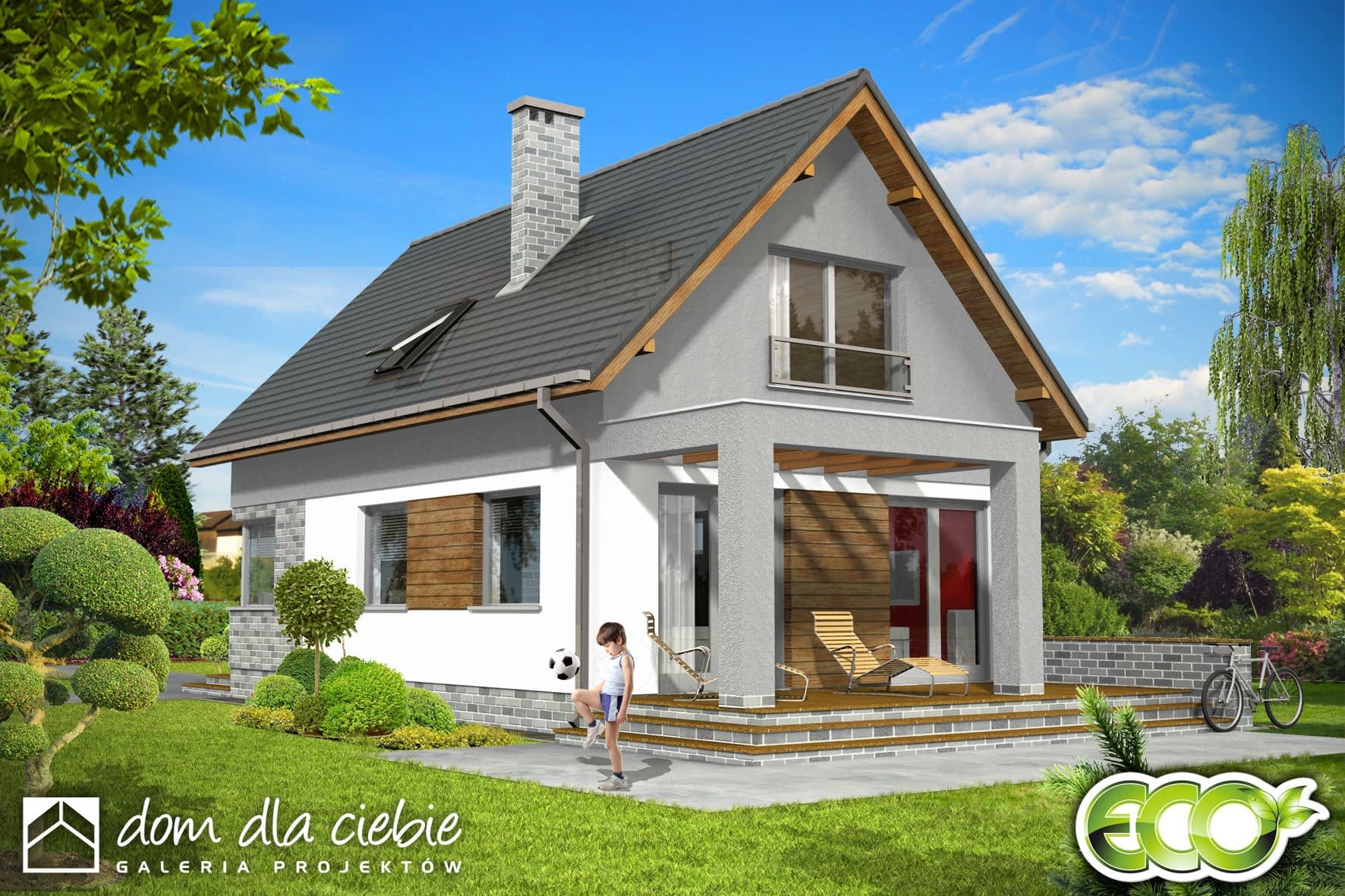 Projekt Iza w nowoczesnej odsłonie i o ekonomicznych rozwiązaniach. Zgrabny, niewielki dom jednorodzinny, zaprojektowany na wąską działkę, dla 4 osobowej rodziny, nadający się na dom całoroczny lub letniskowy. Drzwi wejściowe chronione są przed opadami funkcjonalnym podcieniem, natomiast jedno z wyjść tarasowych z p. dziennego prowadzi pod przestronną pergolę, którą można z powodzeniem przeprojektować na pełne zadaszenie. Z wiatrołapu dostępne jest pom. gospodarcze z piecem C.O.. Kuchnię, w zależności od upodobań inwestorów, można pozostawić otwartą lub zamknąć ściankami działowymi. Na poddaszu zaprojektowano 2 niewielkie sypialnie, jedną większą z wewnętrzną garderobą oraz łazienkę. Wszystkie pomieszczenia, w wersji bez garażu, doświetlone są światłem dziennym.