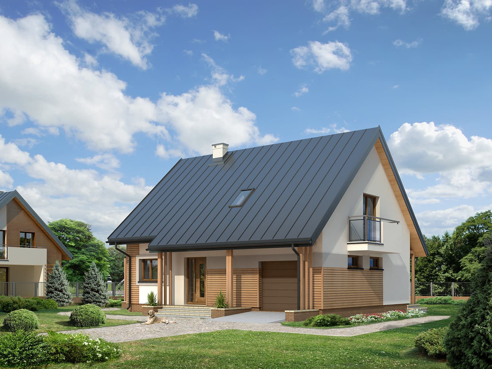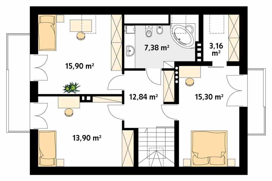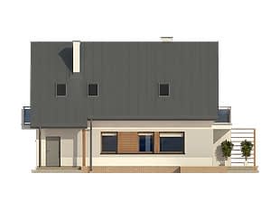 Niewielki ale wygodny dom dla 4 – 5-osobowej rodziny. Zlokalizowana na parterze część dzienna mieści w sobie przestronny pokój dzienny, jadalnię, kuchnię ze spiżarnią i gabinet, dodatkowo są tu: łazienka, duża kotłownia i jednostanowiskowy garaż. Na poddaszu znajdują się trzy obszerne sypialnie z wyjściami na dwa balkony, łazienka i garderoba. Prosta bryła z dwuspadowym dachem czyni dom łatwym w realizacji i tanim w użytkowaniu.Konstrukcja