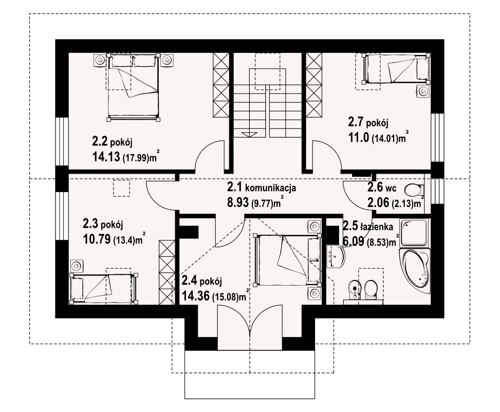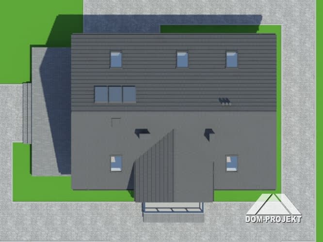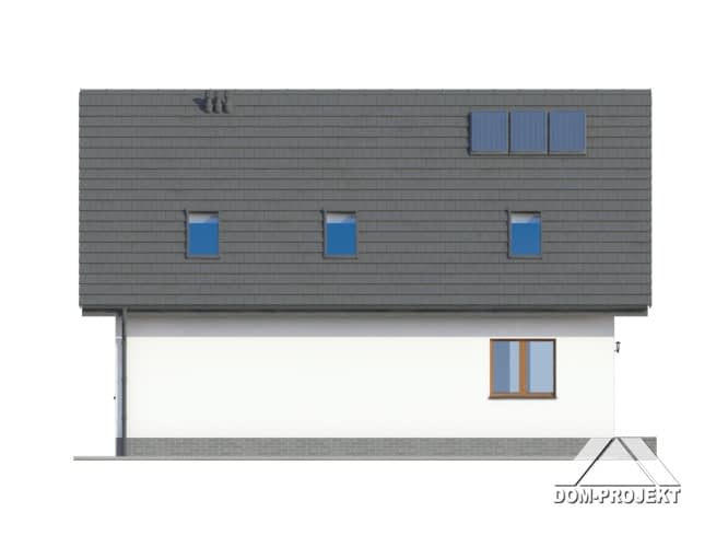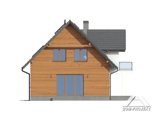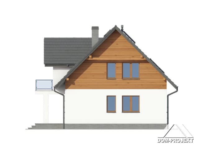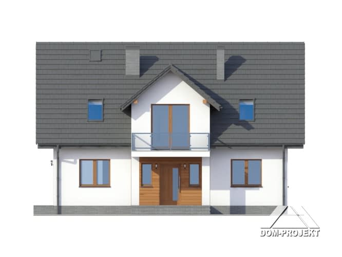 Dom z poddaszem użytkowym. Duży salon z aneksem kuchennym, kominkiem, wyjściem na taras i schodami na poddasze. Pokój biblioteka, wc, wiatrołap, spiżarka i kotłownia. Na poddaszu cztery pokoje, łazienka, wc, komunikacja i dwa balkony. Zwarta bryła budynku i dach dwuspadowy sprzyjają szybkiej i taniej budowie i niskim kosztom eksploatacji.Rzuty
