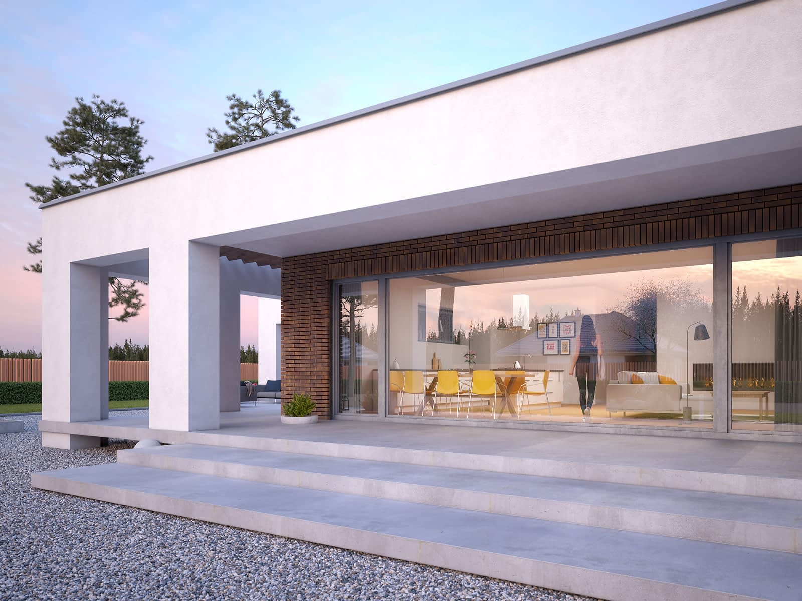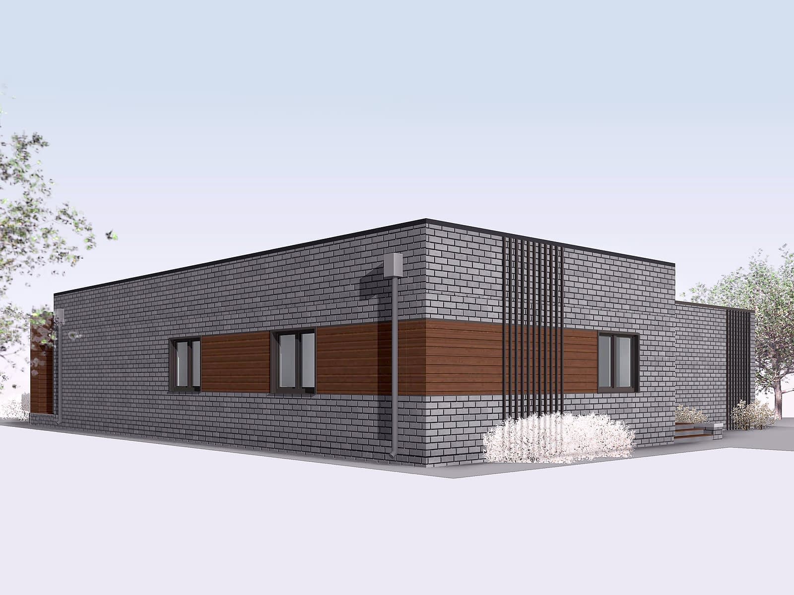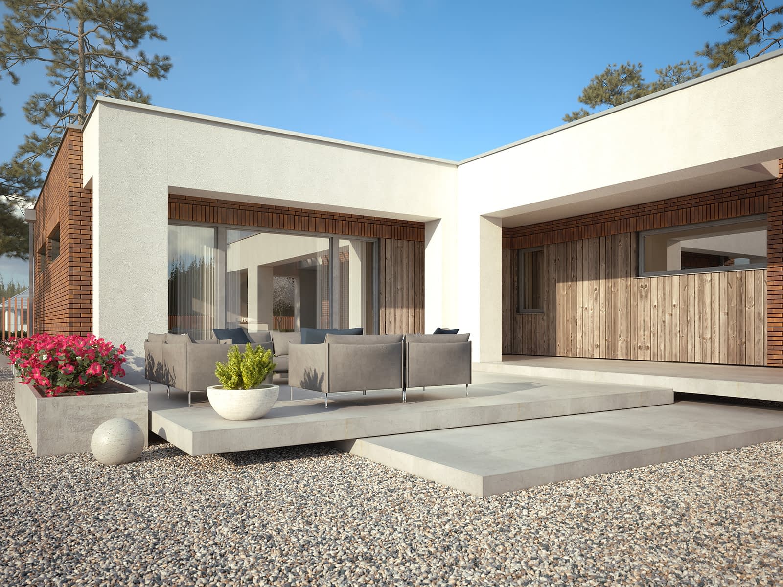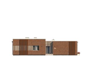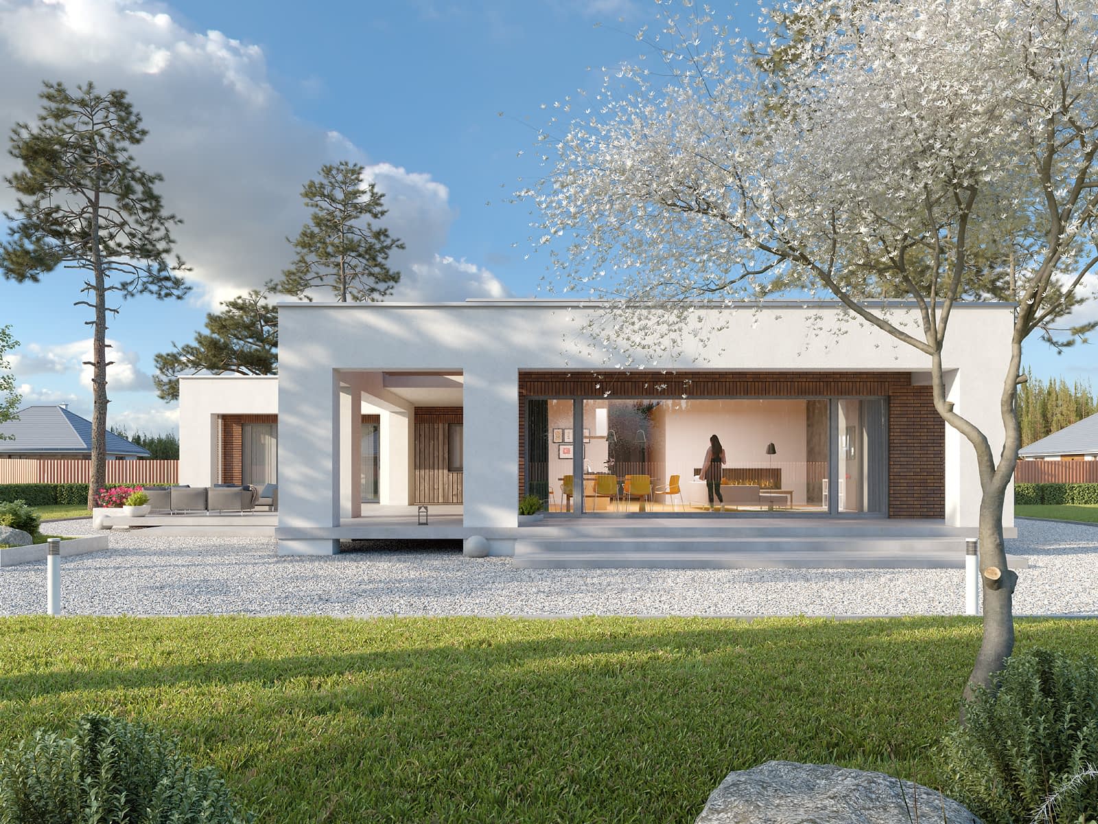 Jadeit 2 to projekt domu parterowego, zaprojektowany z myślą o oryginalnej bryle oraz ciekawych rozwiązaniach elewacyjnych. Projekt podzielono na trzy strefy użytkowe. Strefę dzienną tworzy salon z kuchnią i jadalnią, który jest otwarty na ogród poprzez duże przeszklenie. Strefa nocna to cztery sypialnie, z czego jedna to apartament gospodarzy z przestronną łazienką z widokiem na ogród. Dodatkowo na parterze znajduje się ogólnodostępna łazienka oraz kotłownia.Konstrukcja