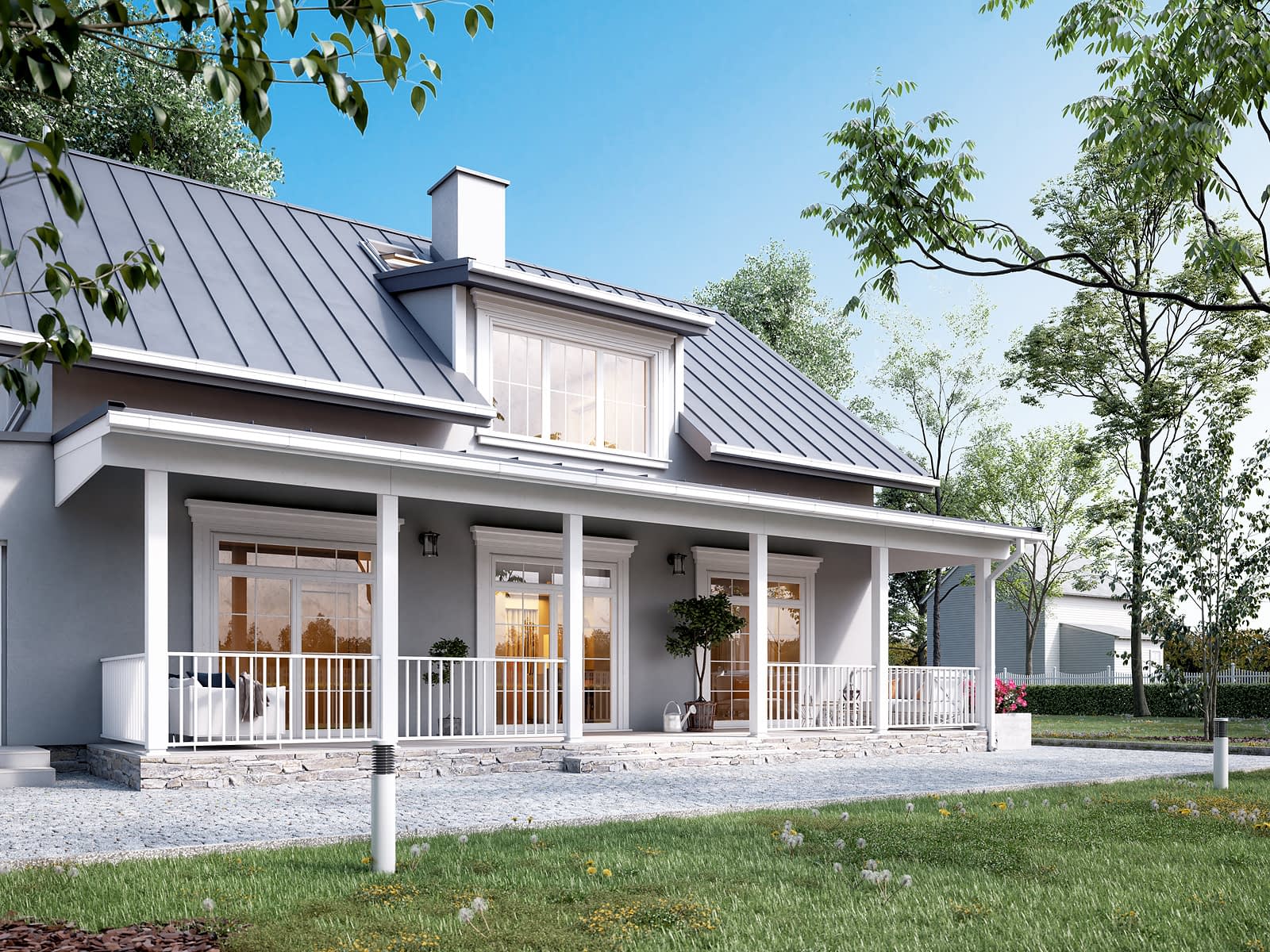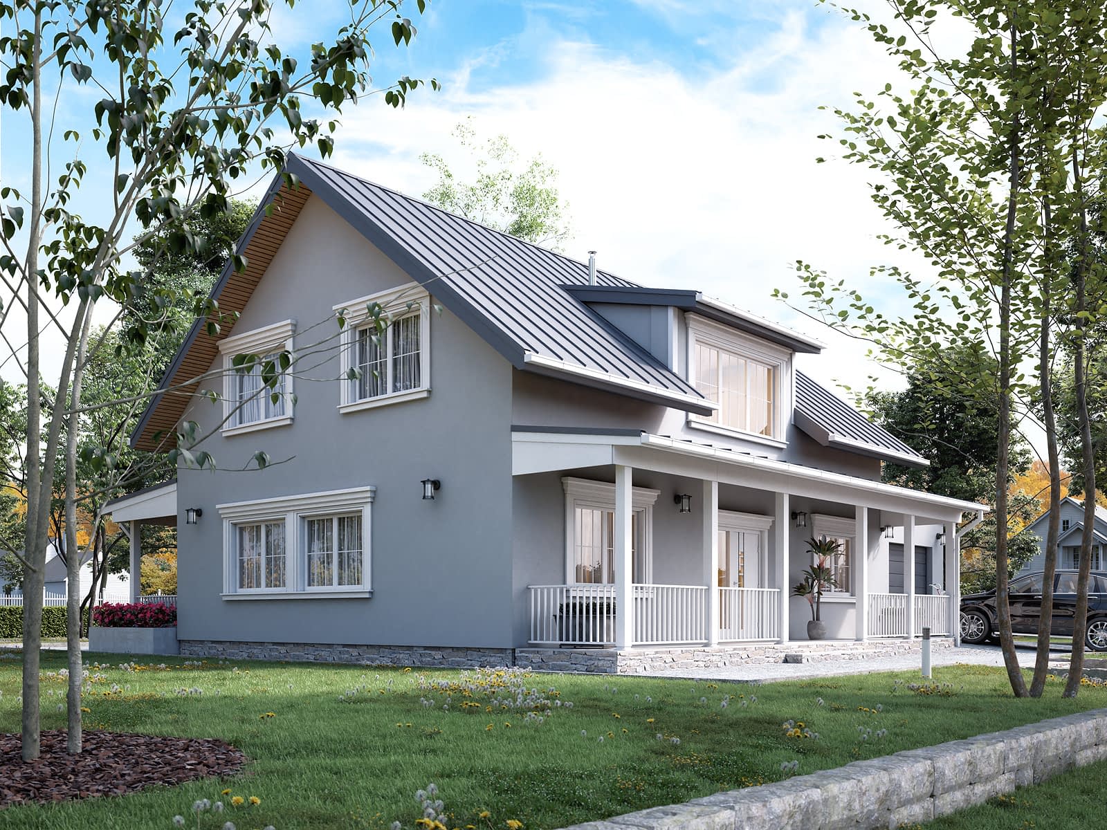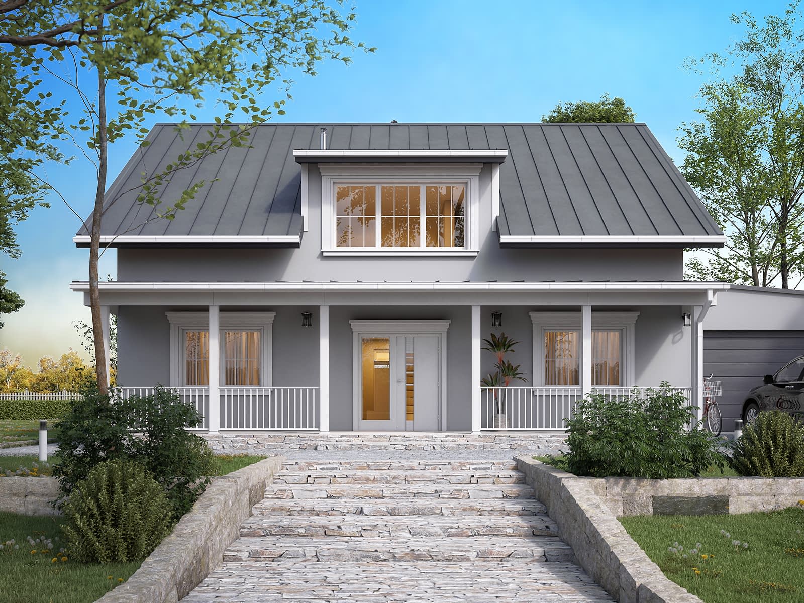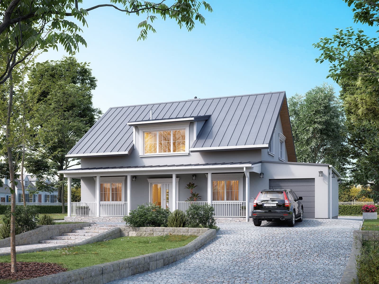 Jagodowy 2 dr-T to projekt domu z użytkowym poddaszem i jednostanowiskowym garażem. Prosta bryła budynku została przykryta dwuspadowym dachem pokrytym blachą na rąbek stojący. Zestawienie jasnej elewacji z szarym dachem oraz stolarką ze szprosami nadaje budynkowi niezwykłego uroku i klasy. Niewątpliwym atutem projektu jest zadaszona weranda, znajdująca się zarówno od frontu jak i ogrodu. Część dzienną domu stanowi otwarta przestrzeń. Składają się na nią kuchnia, jadalnia oraz salon z kominkiem. Na parterze zaprojektowano także dodatkową sypialnię oraz sąsiadującą z nią łazienkę. Poddasze to azyl jego mieszkańców. Zaprojektowano tu trzy wygodne sypialnie oraz rodzinną łazienkę. Projekt z całą pewnością zaspokoi potrzeby 4 -osobowej rodziny.Konstrukcja