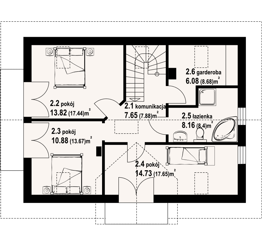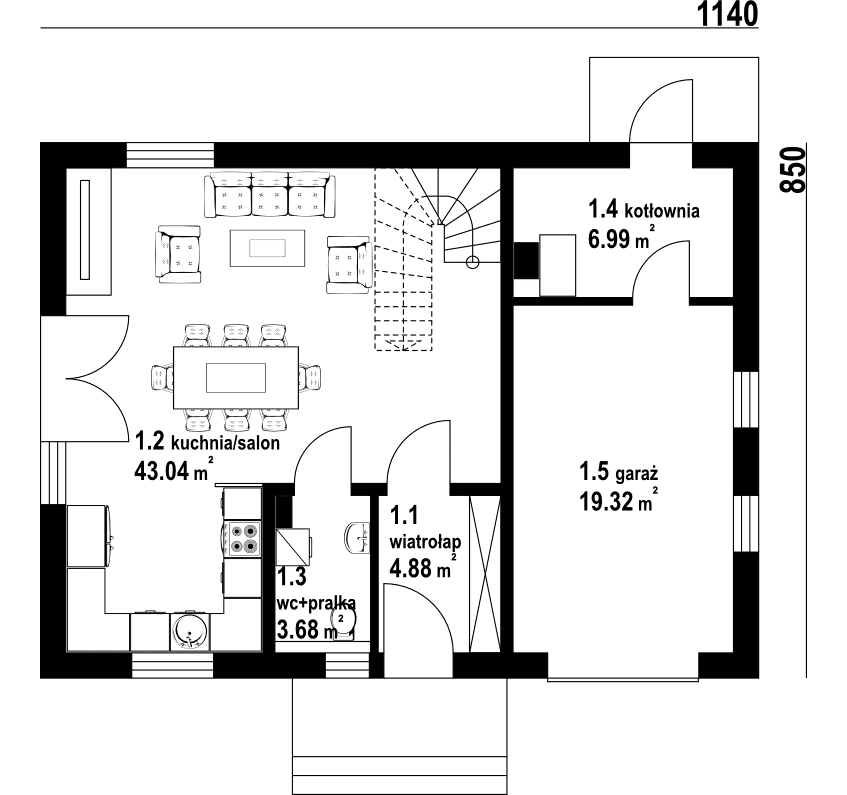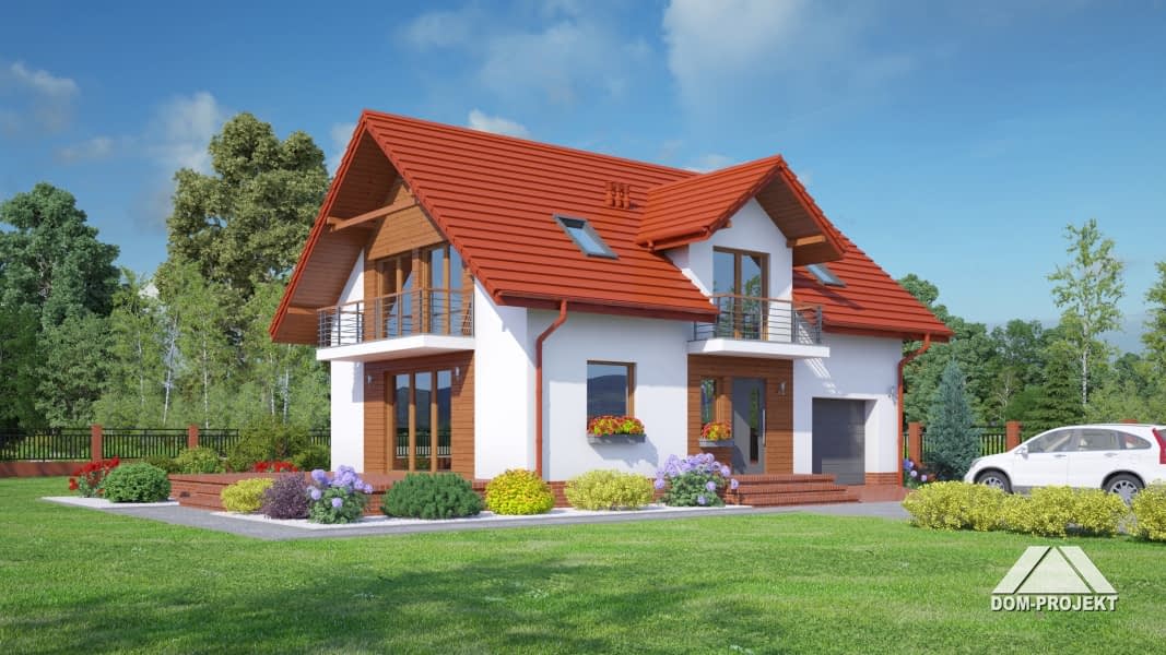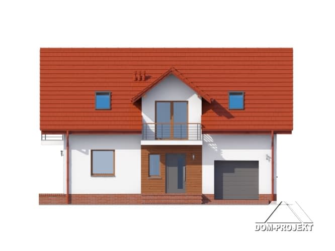 Dom z poddaszem użytkowym. Duży salon z aneksem kuchennym, wyjściem na taras i schodami na poddasze. Wiatrołap, wc (z pralką), garaż, kotłownia. Na poddaszu trzy pokoje, łazienka, garderoba, komunikacja i dwa balkony. Zwarta bryła budynku i dach dwuspadowy sprzyjają szybkiej i taniej budowie i niskim kosztom eksploatacji.Rzuty