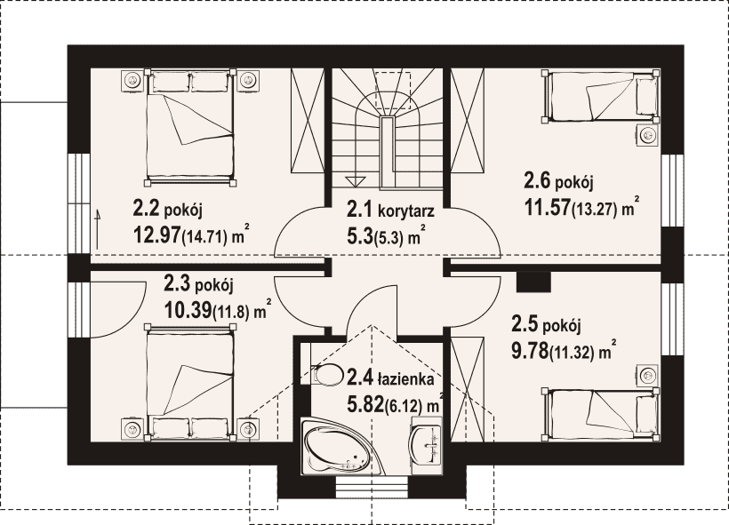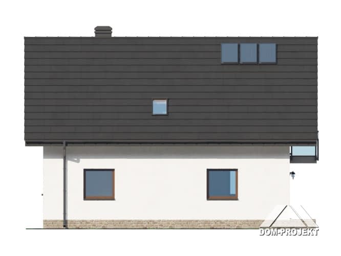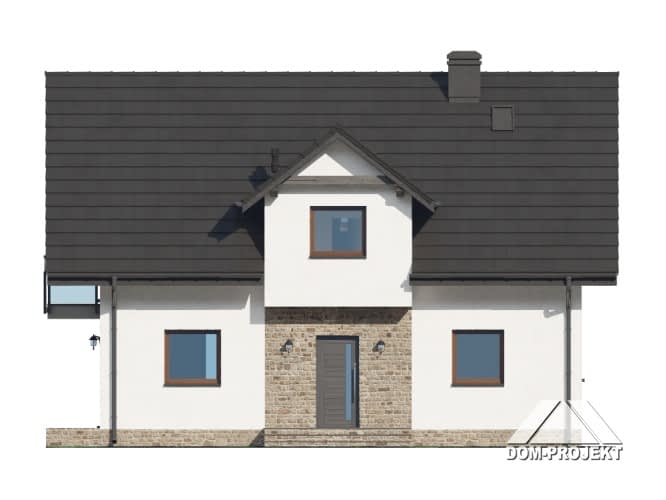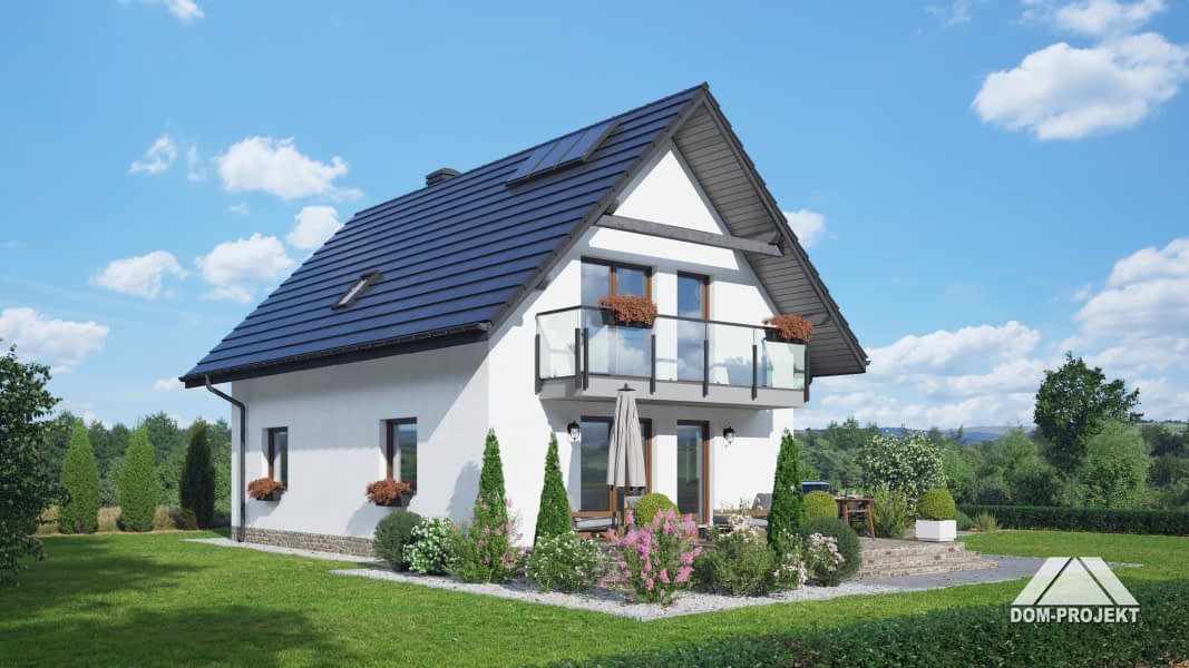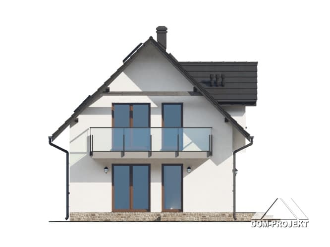 Dom z poddaszem użytkowym. Na parterze salon z aneksem kuchennym, wyjściem na taras i schodami na poddasze. Pokój, łazienka, kotłownia, wiatrołap. Na poddaszu cztery pokoje, łazienka, korytarz oraz balkon dostępny z dwóch pokoi. Zwarta bryła budynku oraz dach dwuspadowy sprzyjają szybkiej i taniej budowie oraz niskim kosztom eksploatacji.Rzuty