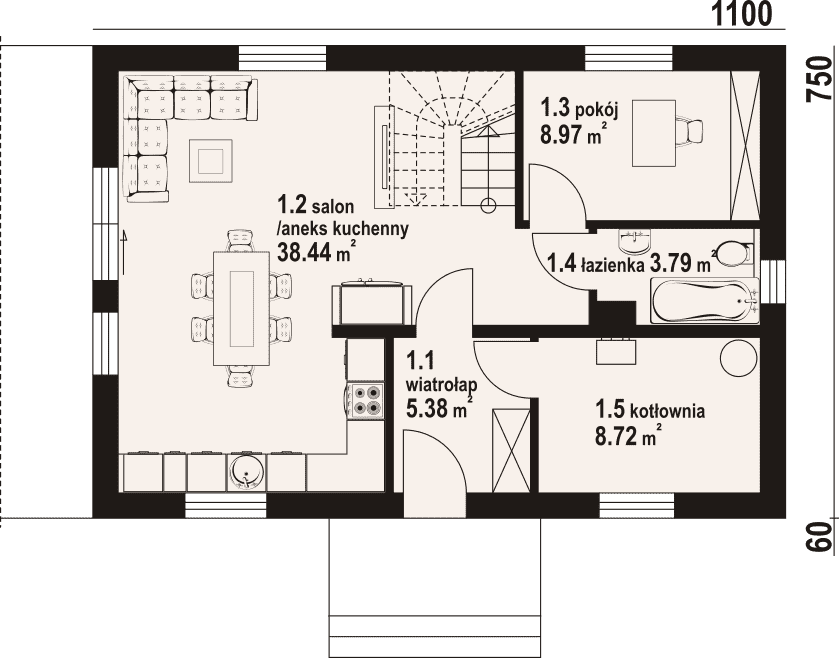 - 1.2 - salon z aneksem kuchennym38.44 m²