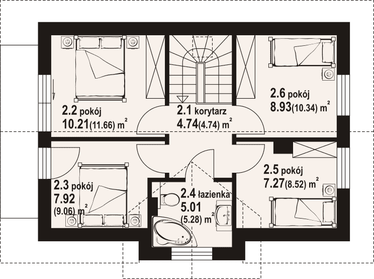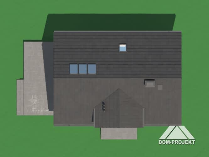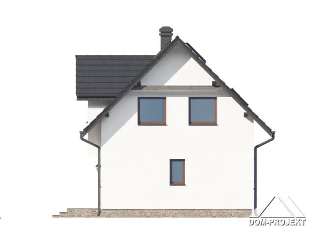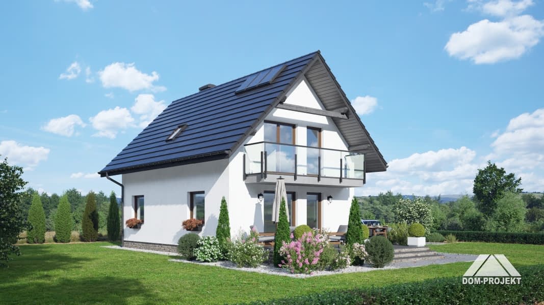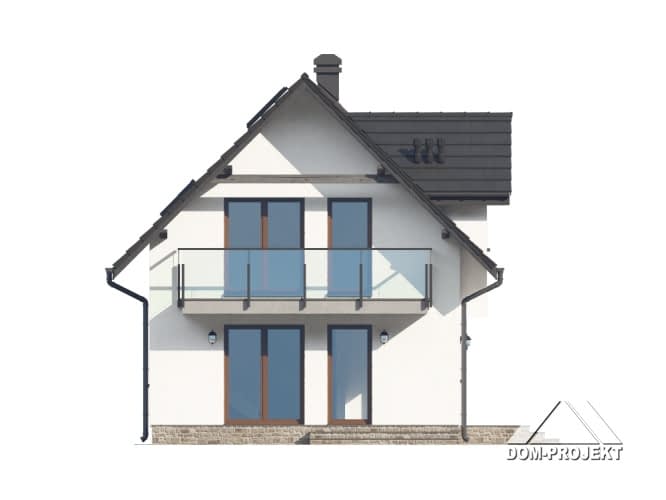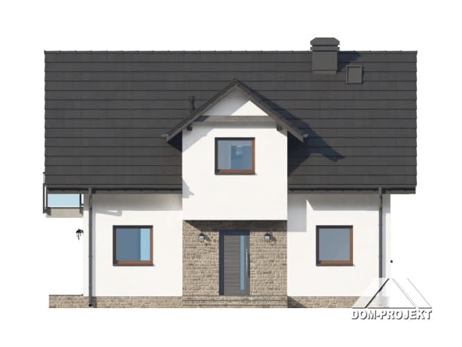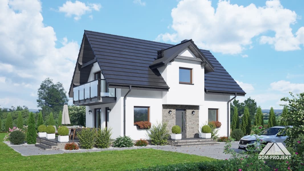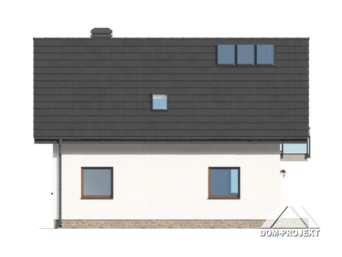 Dom z poddaszem użytkowym. Na parterze salon z aneksem kuchennym, schodami na poddasze oraz wyjściem na taras. Pokój do pracy, wc, kotłownia, wiatrołap. Na poddaszu cztery pokoje, korytarz, łazienka oraz balkon. Zwarta bryła budynku oraz dach dwuspadowy sprzyjają szybkiej i taniej budowie oraz niskim kosztom eksploatacji.Rzuty