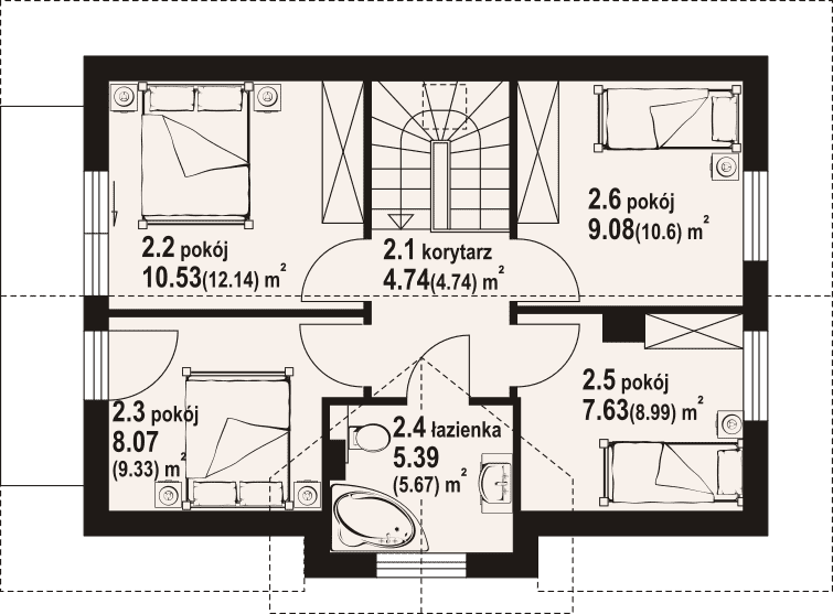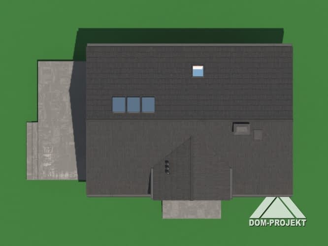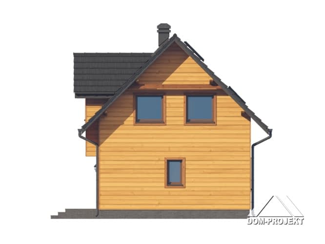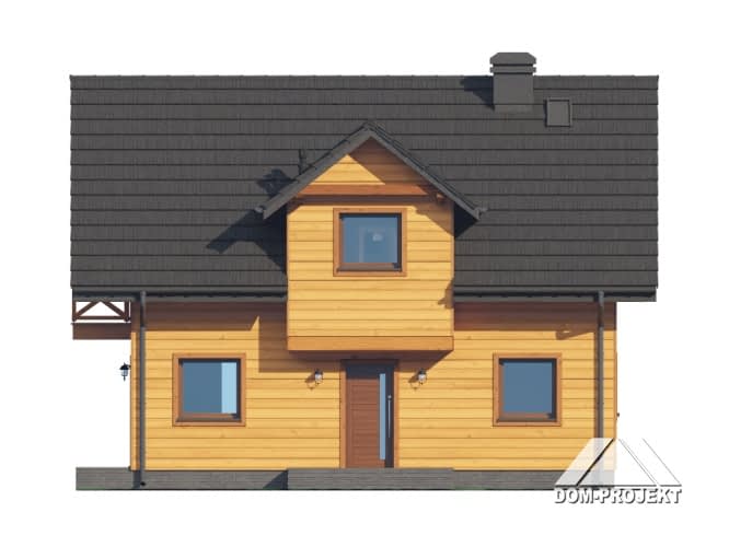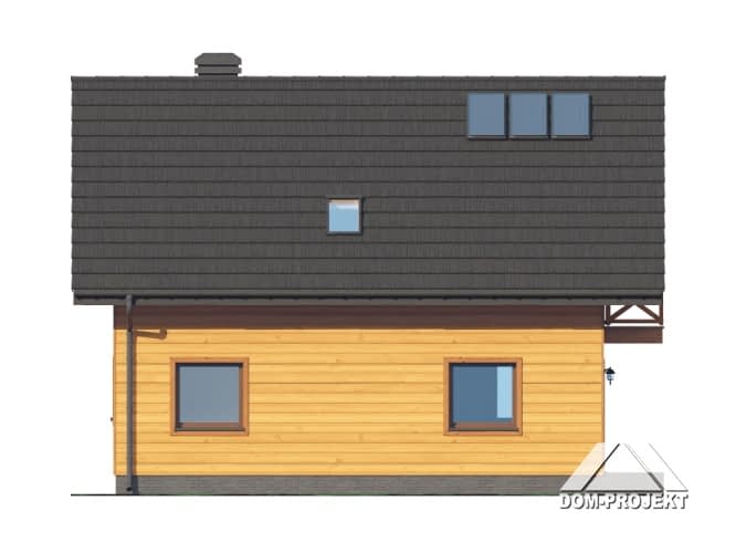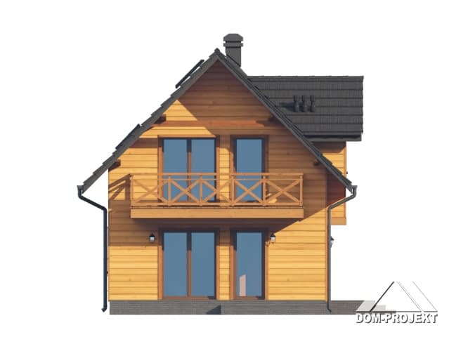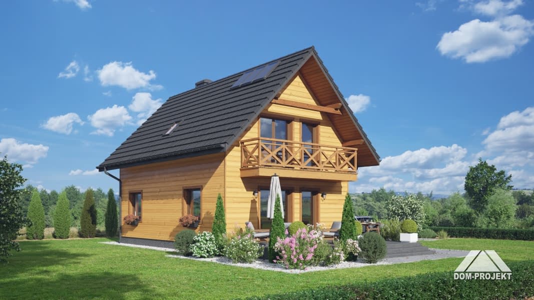 Dom w konstrukcji szkieletu drewnianego. Na parterze salon z aneksem kuchennym, wyjściem na taras i schodami na poddasze. Pokój, kotłownia, wc, wiatrołap. Na poddaszu cztery pokoje, korytarz, łazienka, balkon dostępny z dwóch pokoi. Zwarta bryła budynku oraz dach dwuspadowy sprzyjają szybkiej i taniej budowie oraz niskim kosztom eksploatacji.Rzuty