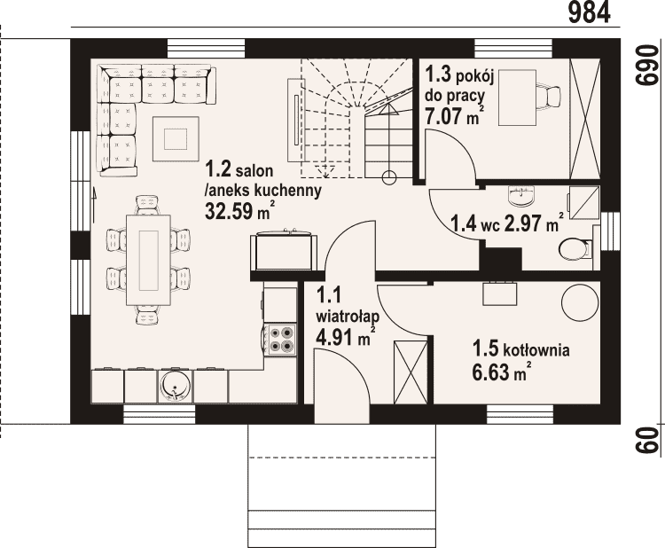 - 1.2 - salon z aneksem kuchennym32.59 m²