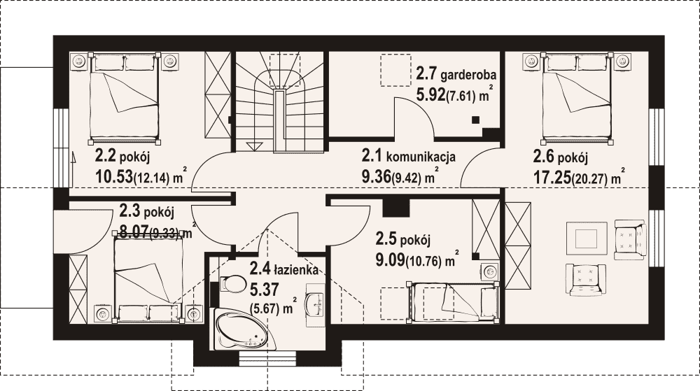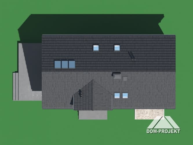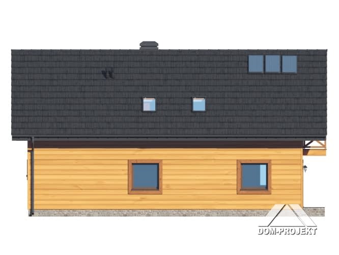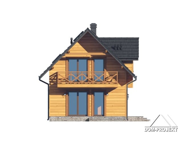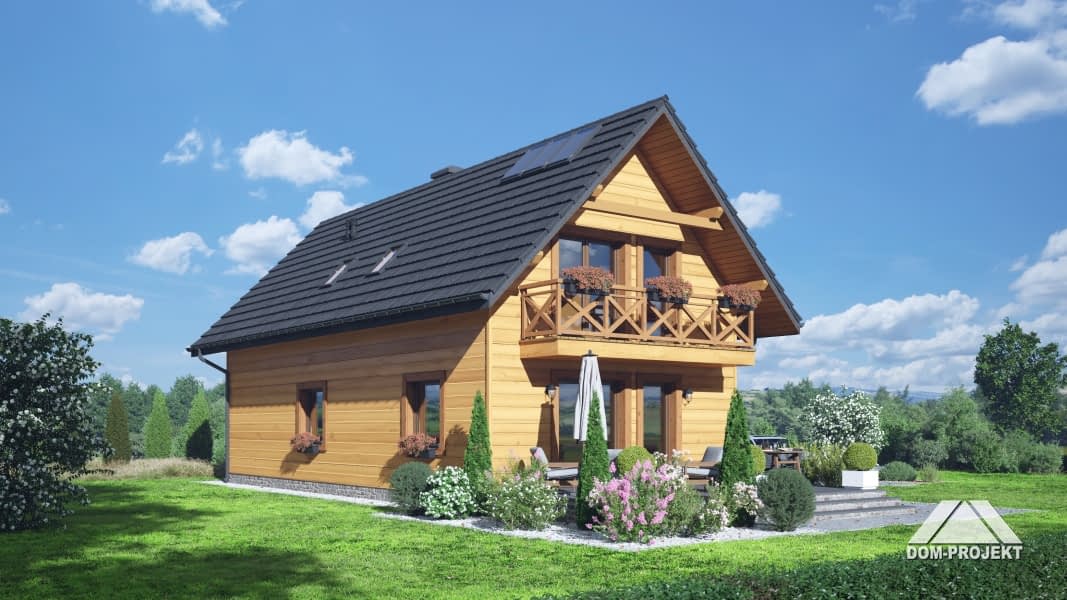 Dom w konstrukcji szkieletu drewnianego. Na parterze salon z aneksem kuchennym, wyjściem na taras i schodami na poddasze. Na poddaszu cztery pokoje, łazienka, komunikacja, garderoba oraz balkon dostępny z dwóch pokoi. Zwarta bryła budynku oraz dach dwuspadowy sprzyjają szybkiej i taniej budowie oraz niskim kosztom eksploatacji.Rzuty